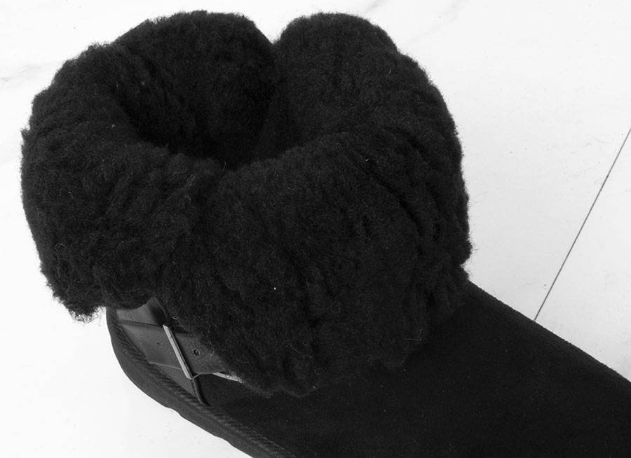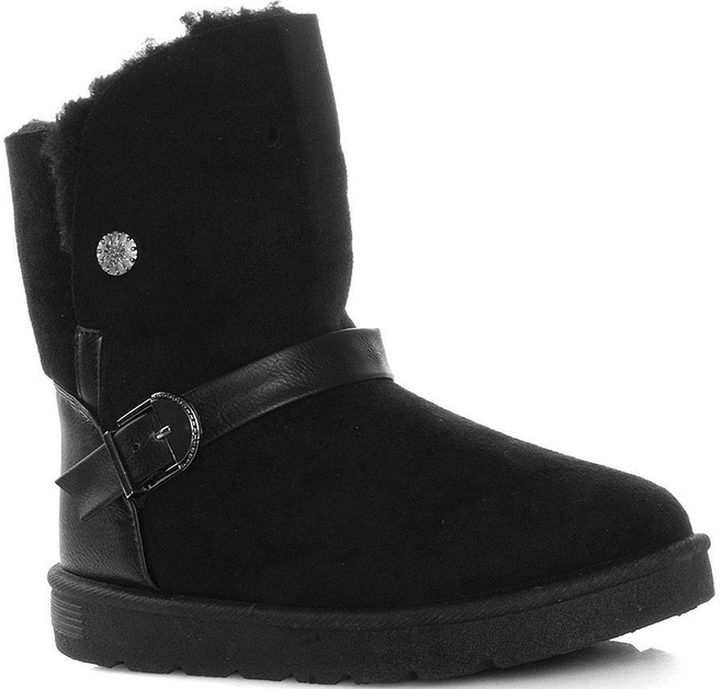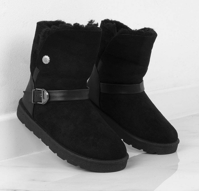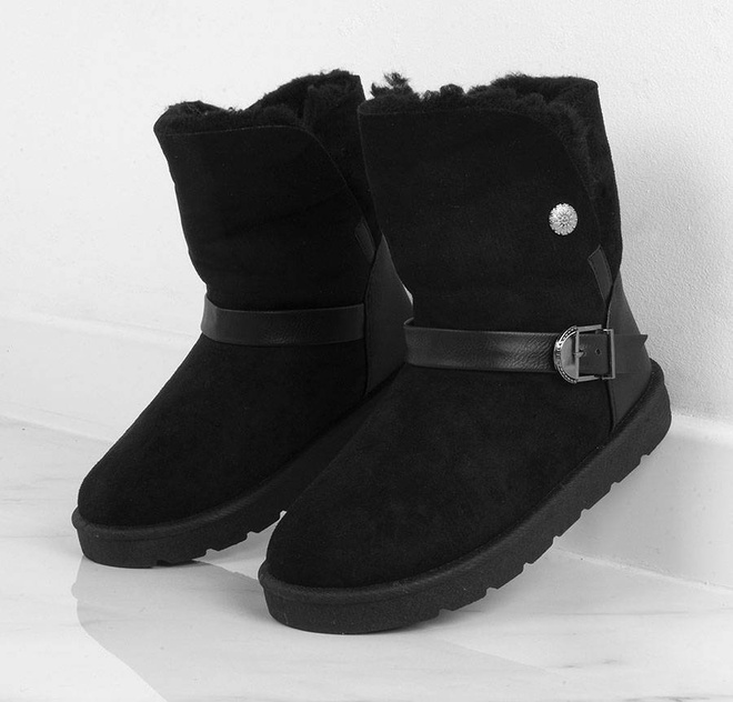 • Stylowe śniegowce wykonane ze skóry ekologicznej zamszowej, bardzo ciepłe. Ozdobione klamrą. Środek buta ocieplony kożuszkiem.