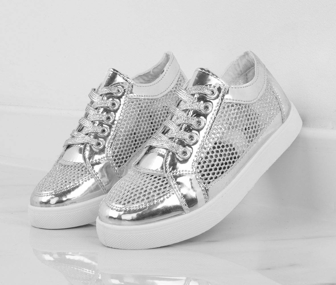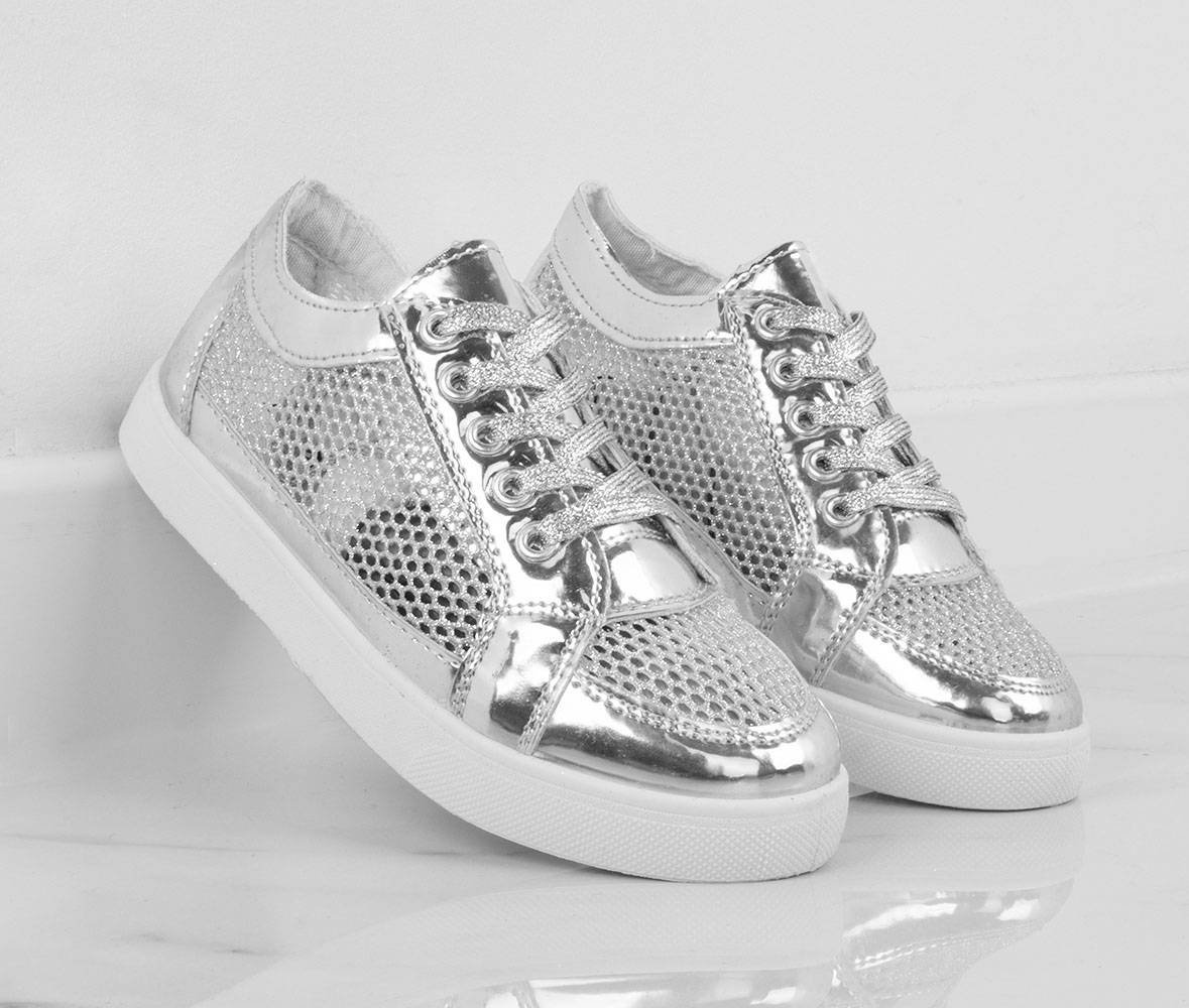 Trampki wykonane z materiału z ekoskóry. Model posiada wstawki brokatowe i ażurowe. Wygodne, sznurowane obuwie.