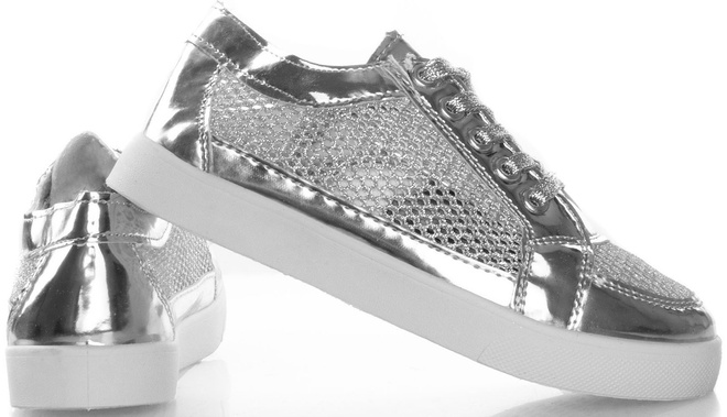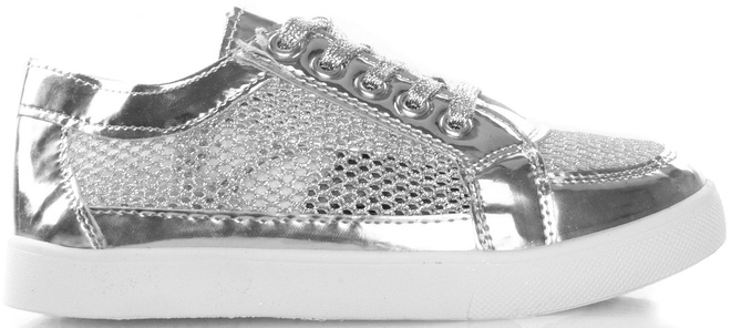 • Trampki wykonane z materiału z ekoskóry. Model posiada wstawki brokatowe i ażurowe. Wygodne, sznurowane obuwie.