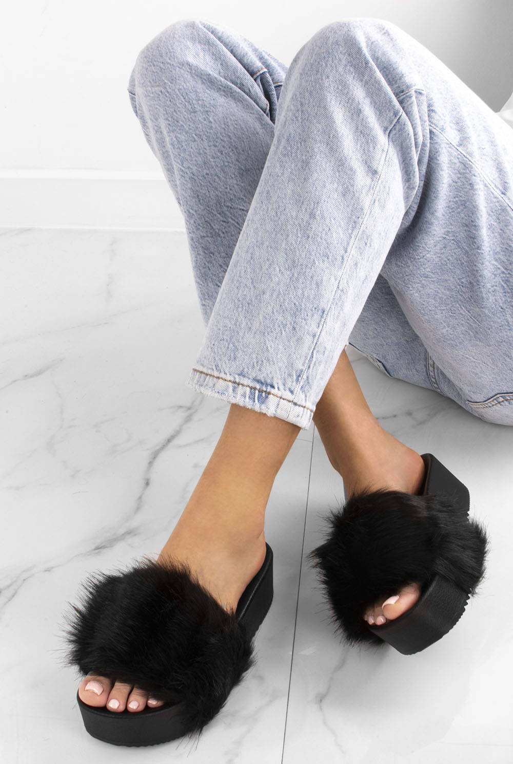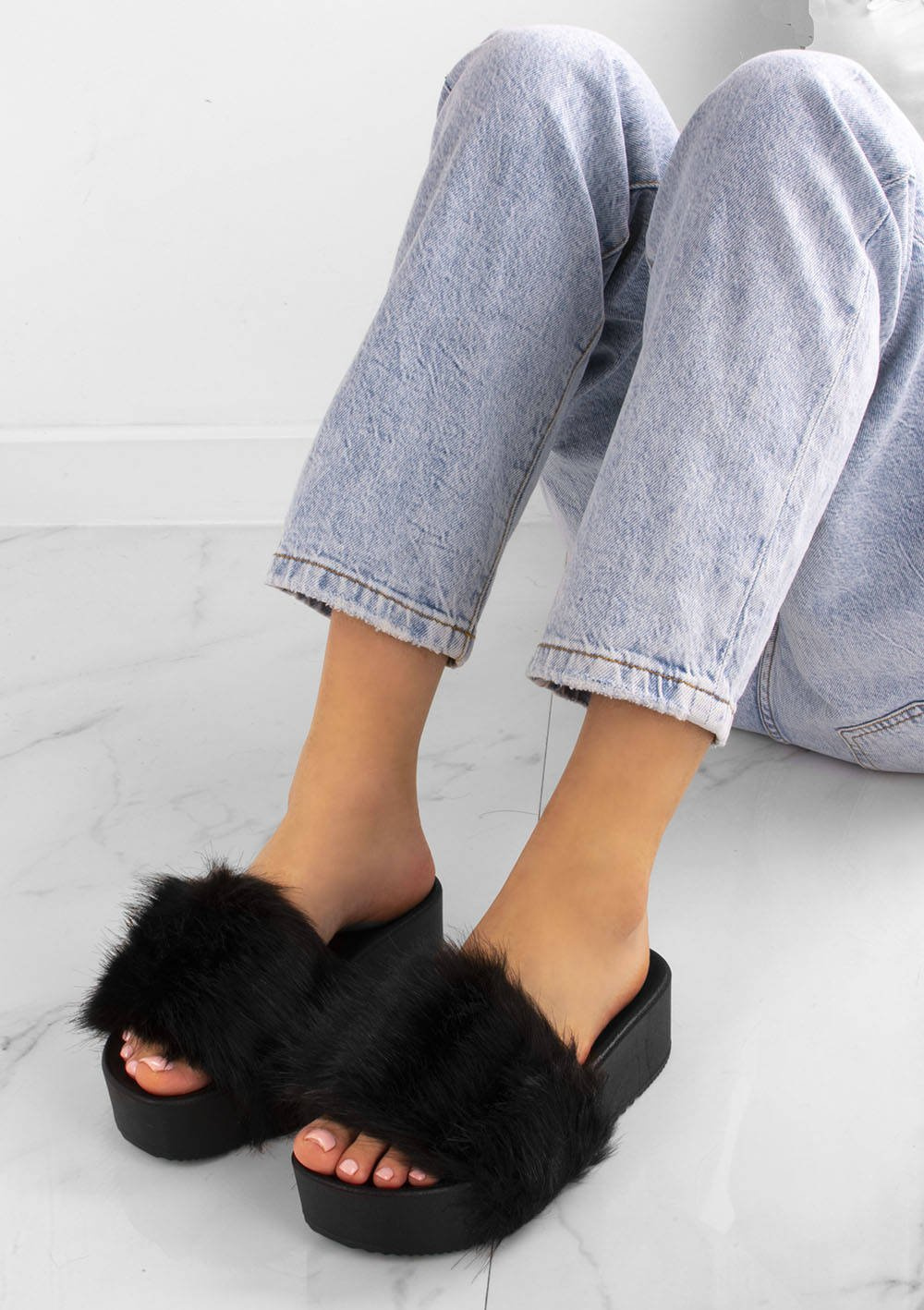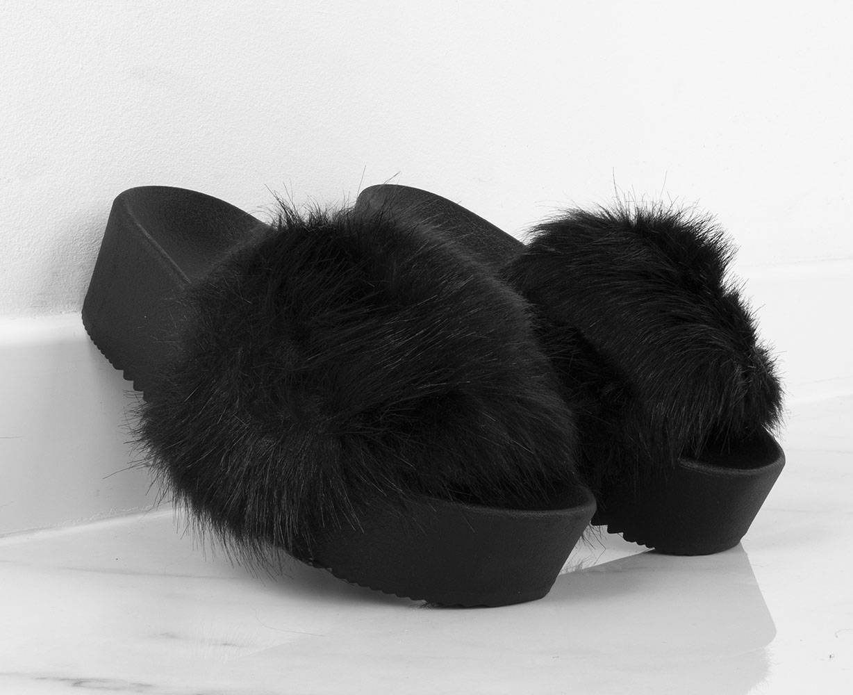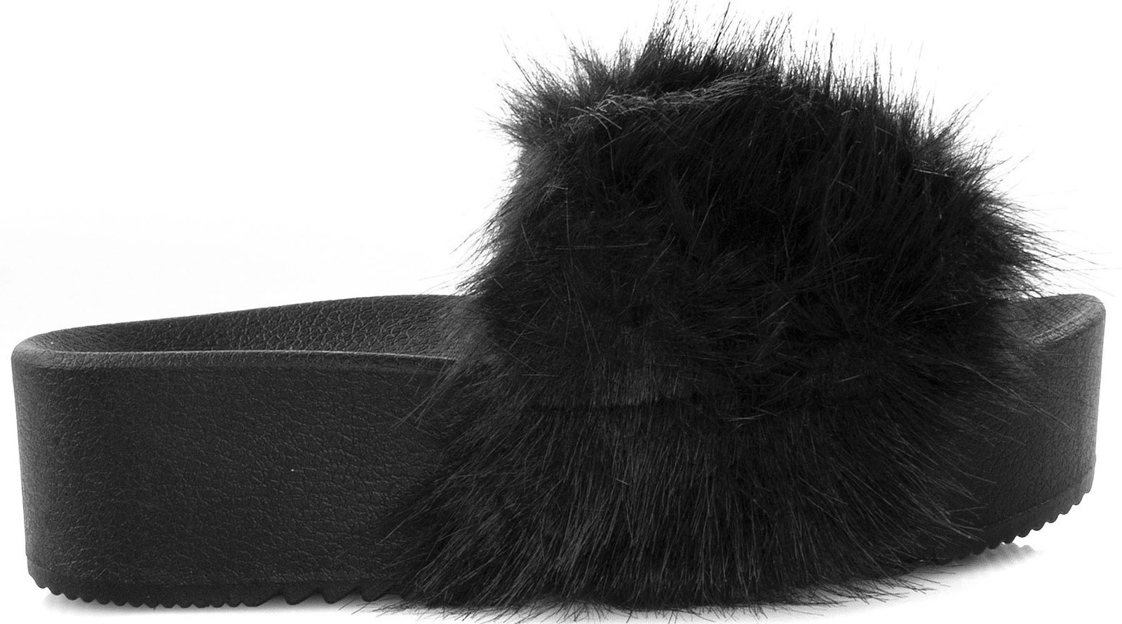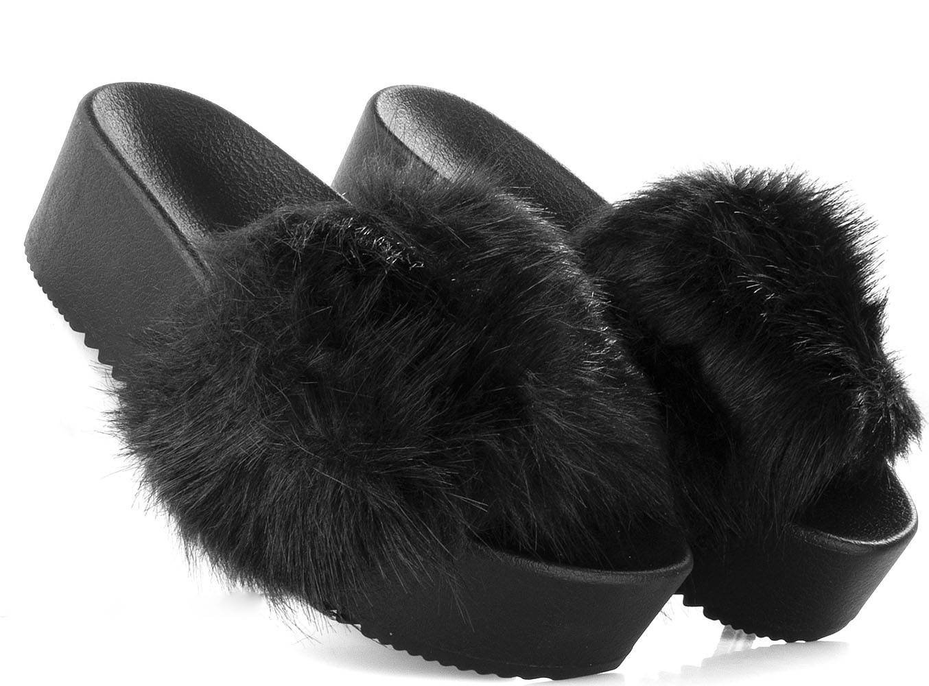 Klapki na wysokiej gumowej platformie. Model posiada ozdobne futerko na paseczku. Obuwie bardzo wygodne. Idealne na co dzień!