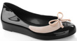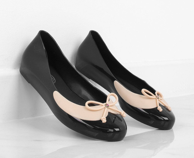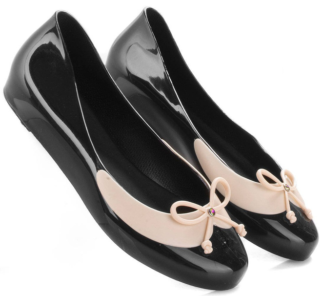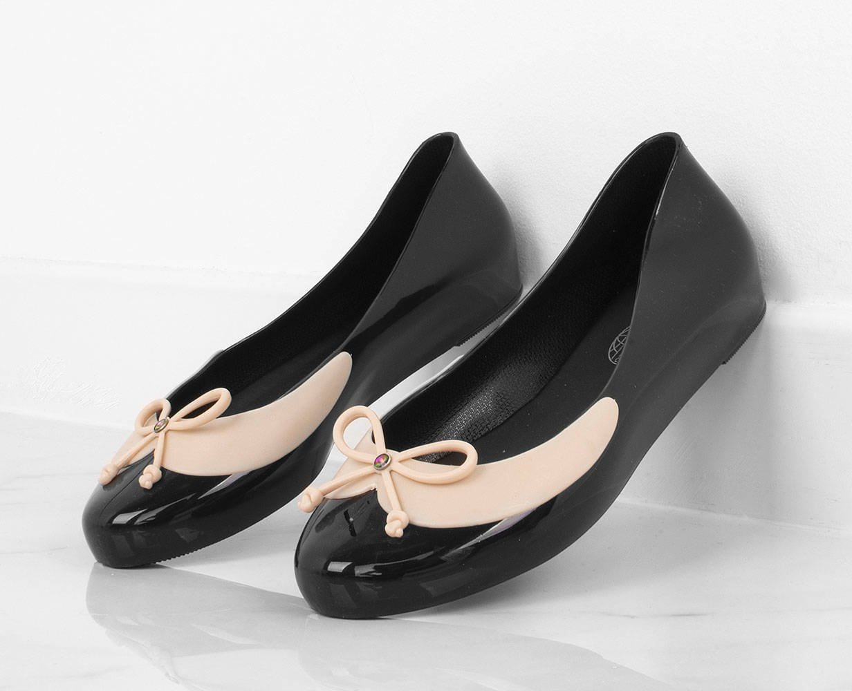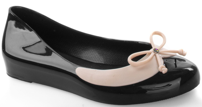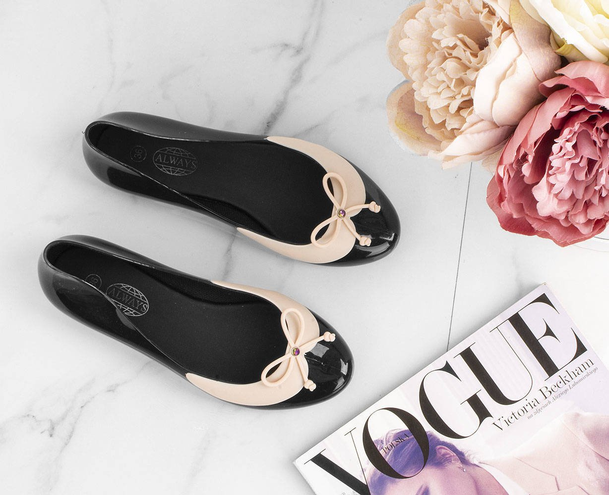 Damskie balerinki meliski wykonane z tworzywa gumowego. Uroku dodaje kokardka. Model na płaskiej podeszwie gwarantuje komfort w chodzeniu. Ponadczasowy model, który dopasujesz do wszystkiego!