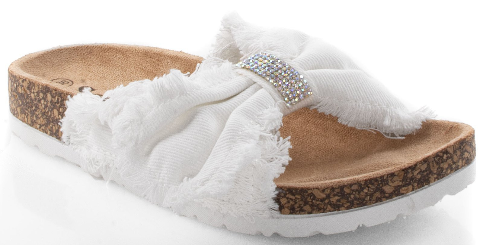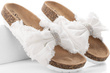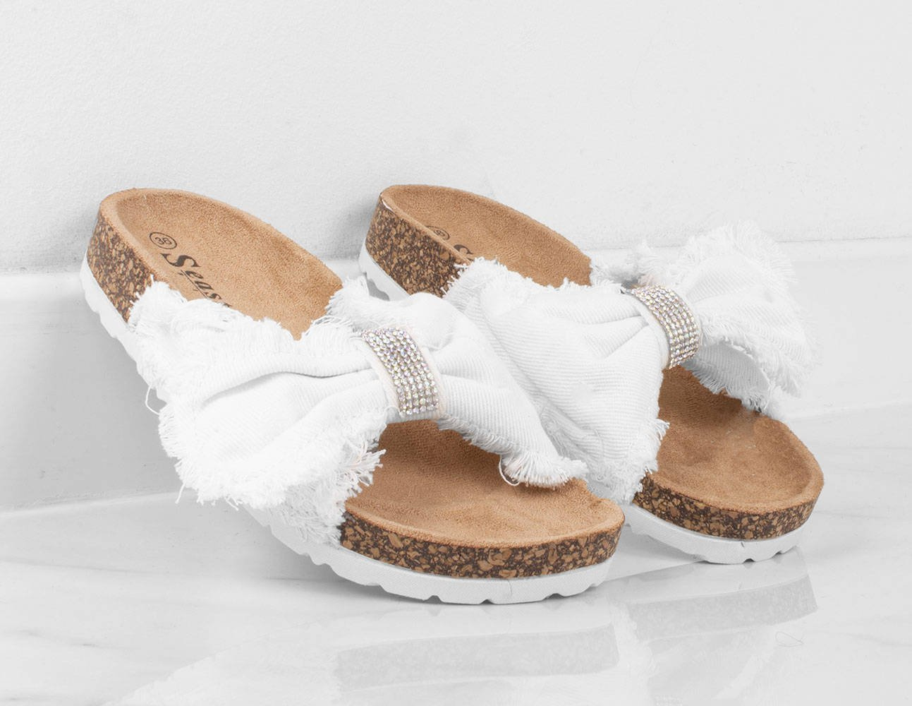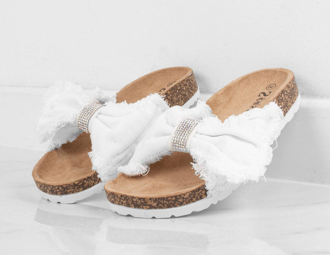 BIAŁE KLAPKI Z KOKARDĄ NA KORKU TO IDEALNY WYBÓR NA CIEPŁE DNI, SĄ PRZEWIEWNE I BARDZO WYGODNE.