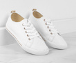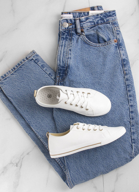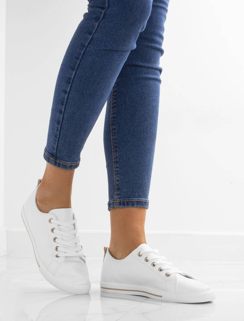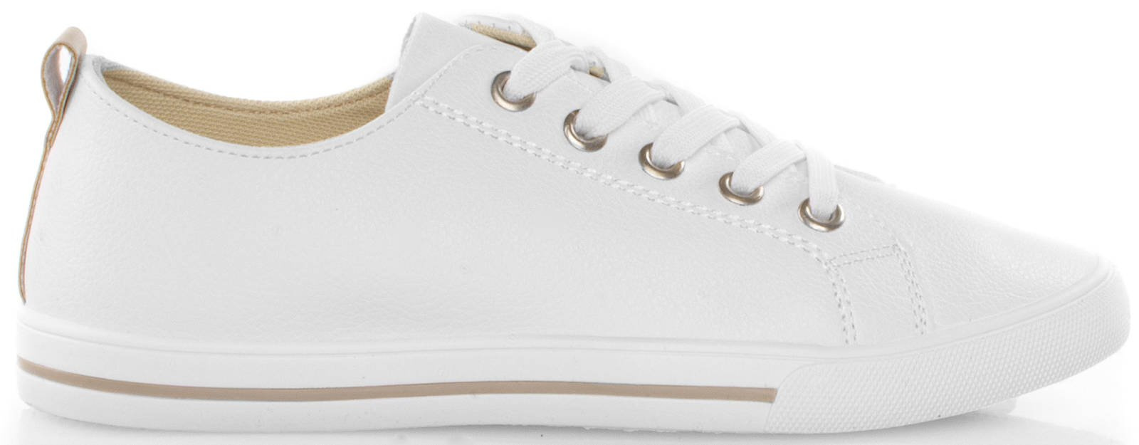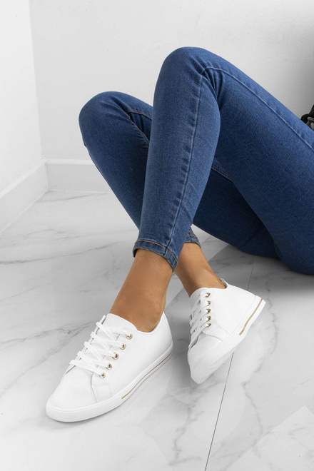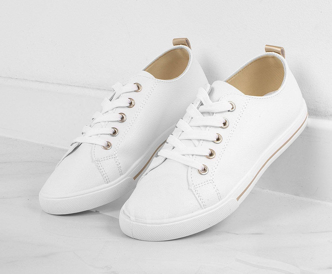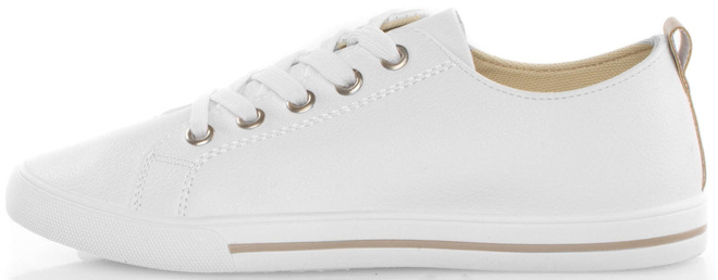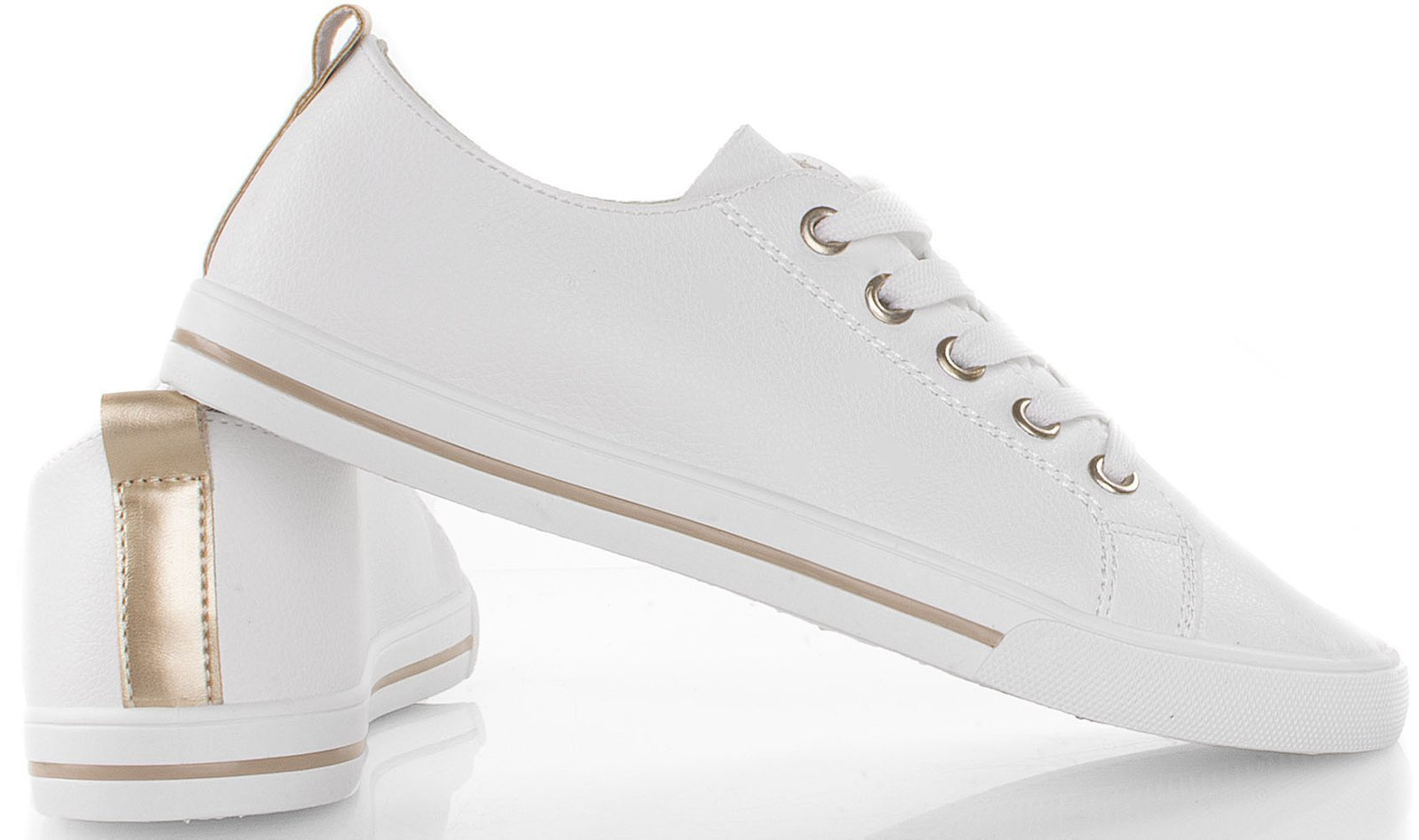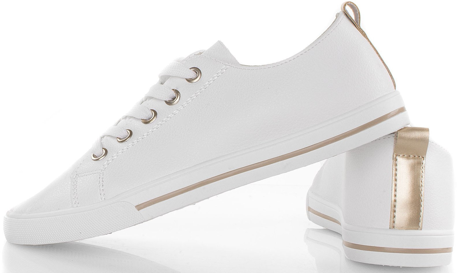 Stylowe białe tenisówki wykonane z najwyższej jakości skóry ekologicznej, podeszwa zaś to tworzywo gumowe. Model posiada sznurowanie i ozdobne wstawki w kolorze złota. Wyglądają sportowo ale elegancko jednocześnie, wyróżnia je staranne wykonanie!