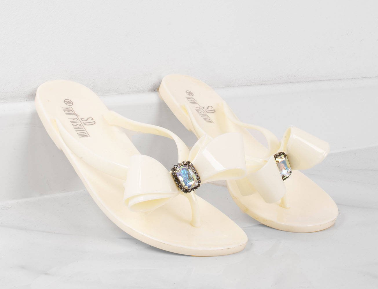 Wygodne klapki wykonane w całości z tworzywa gumowego. Pasek zdobiony kokardką.