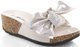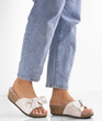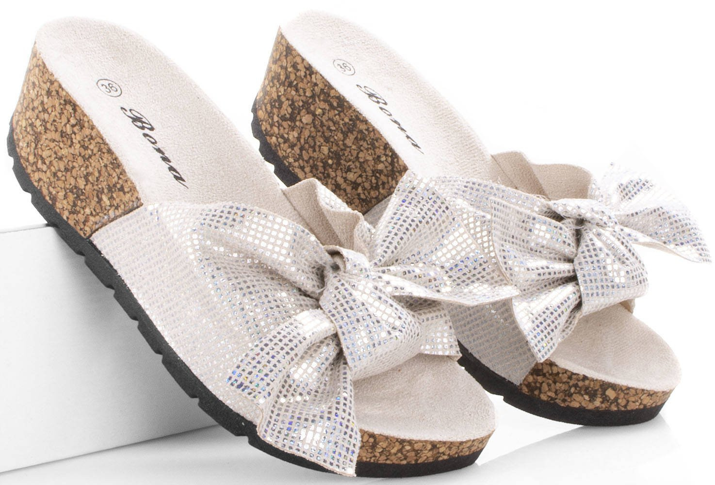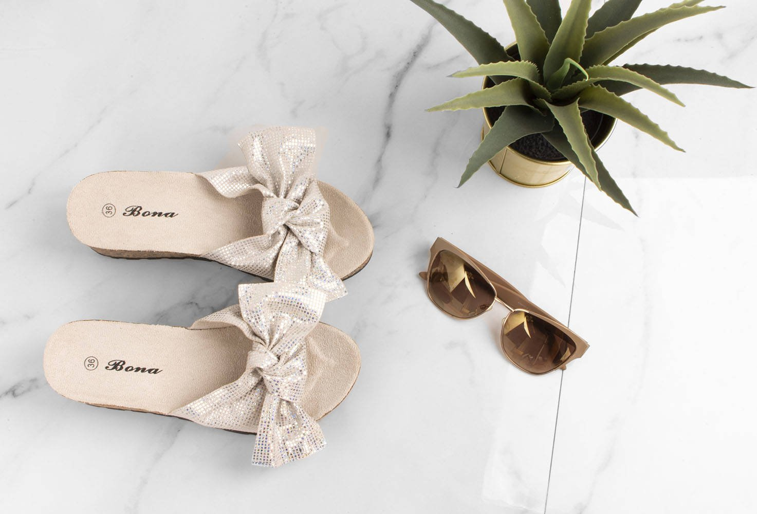 • Klapki na stabilnym, korkowym koturnie świetnie sprawdzą się w codziennych stylizacjach. Model zdobiony połyskująca kokardką. Wkładka wykonana z zamszu, dzięki czemu jest ona komfortowa dla stopy.