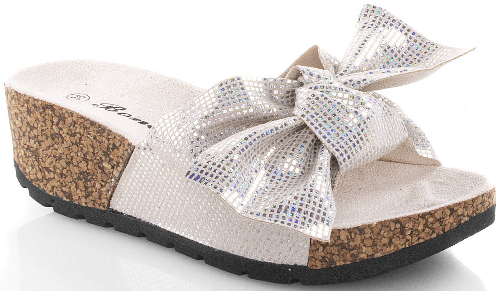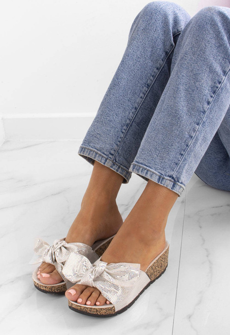 Klapki na stabilnym, korkowym koturnie świetnie sprawdzą się w codziennych stylizacjach. Model zdobiony połyskująca kokardką. Wkładka wykonana z zamszu, dzięki czemu jest ona komfortowa dla stopy. Pięknie prezentują się na stopie!