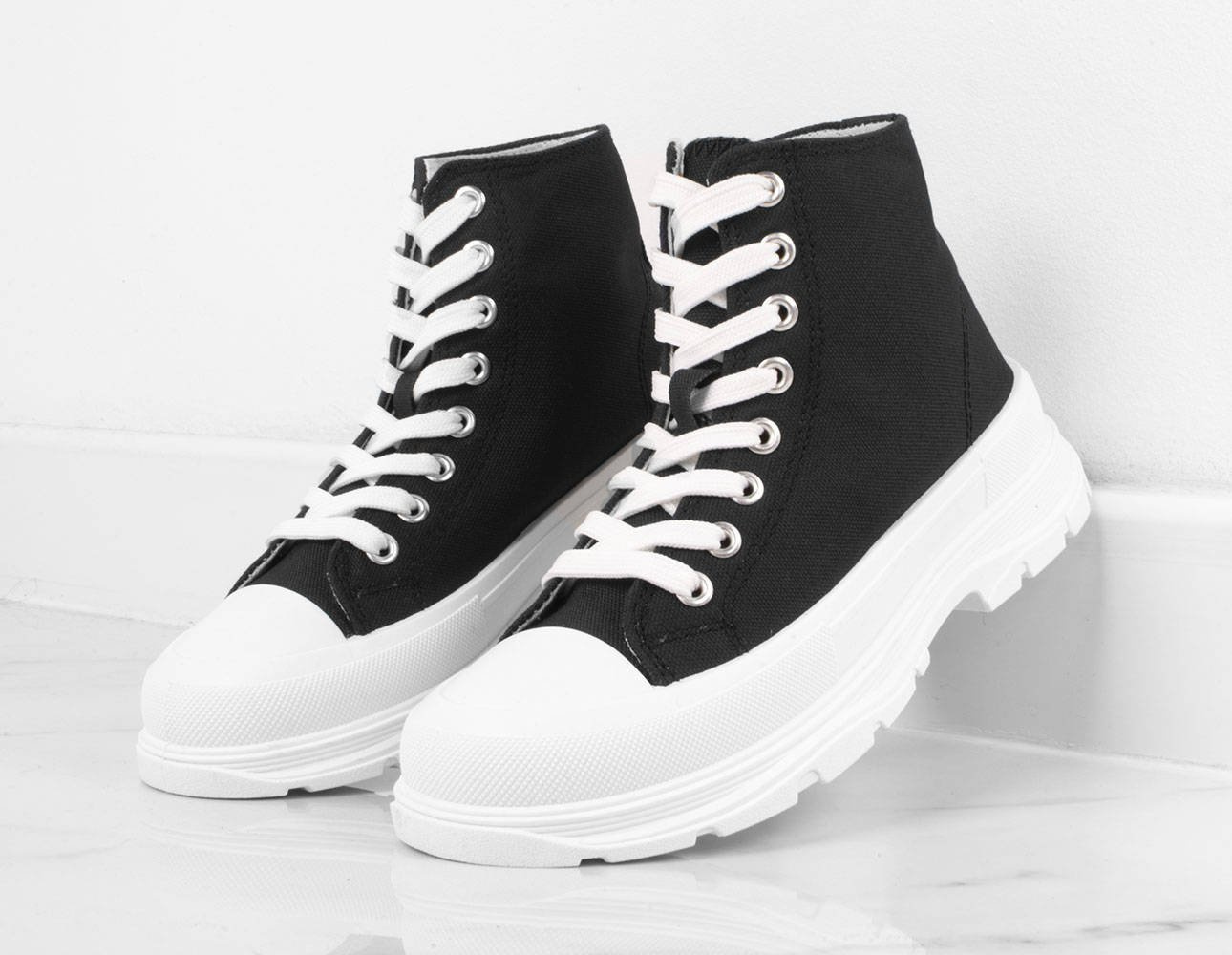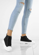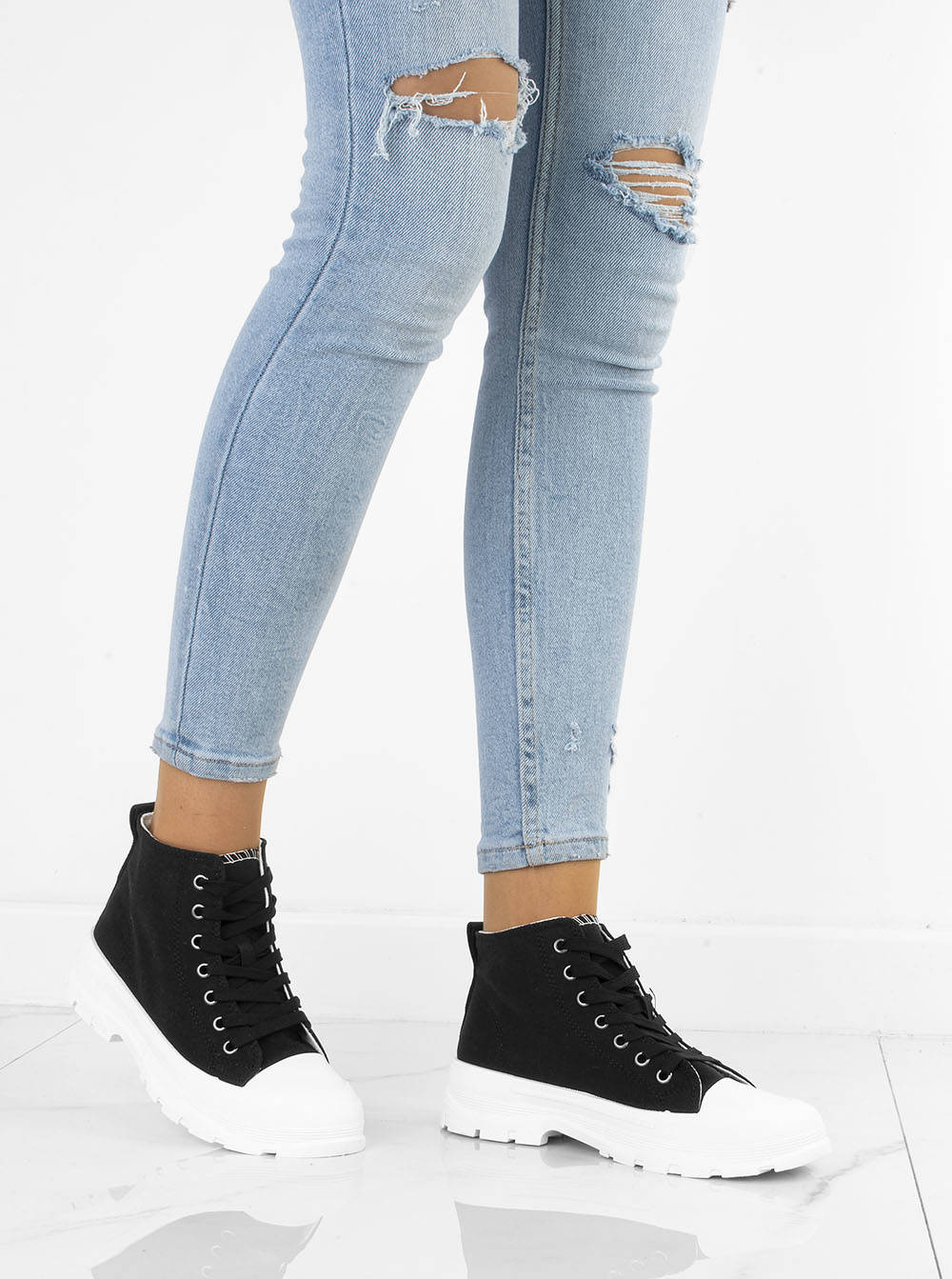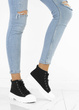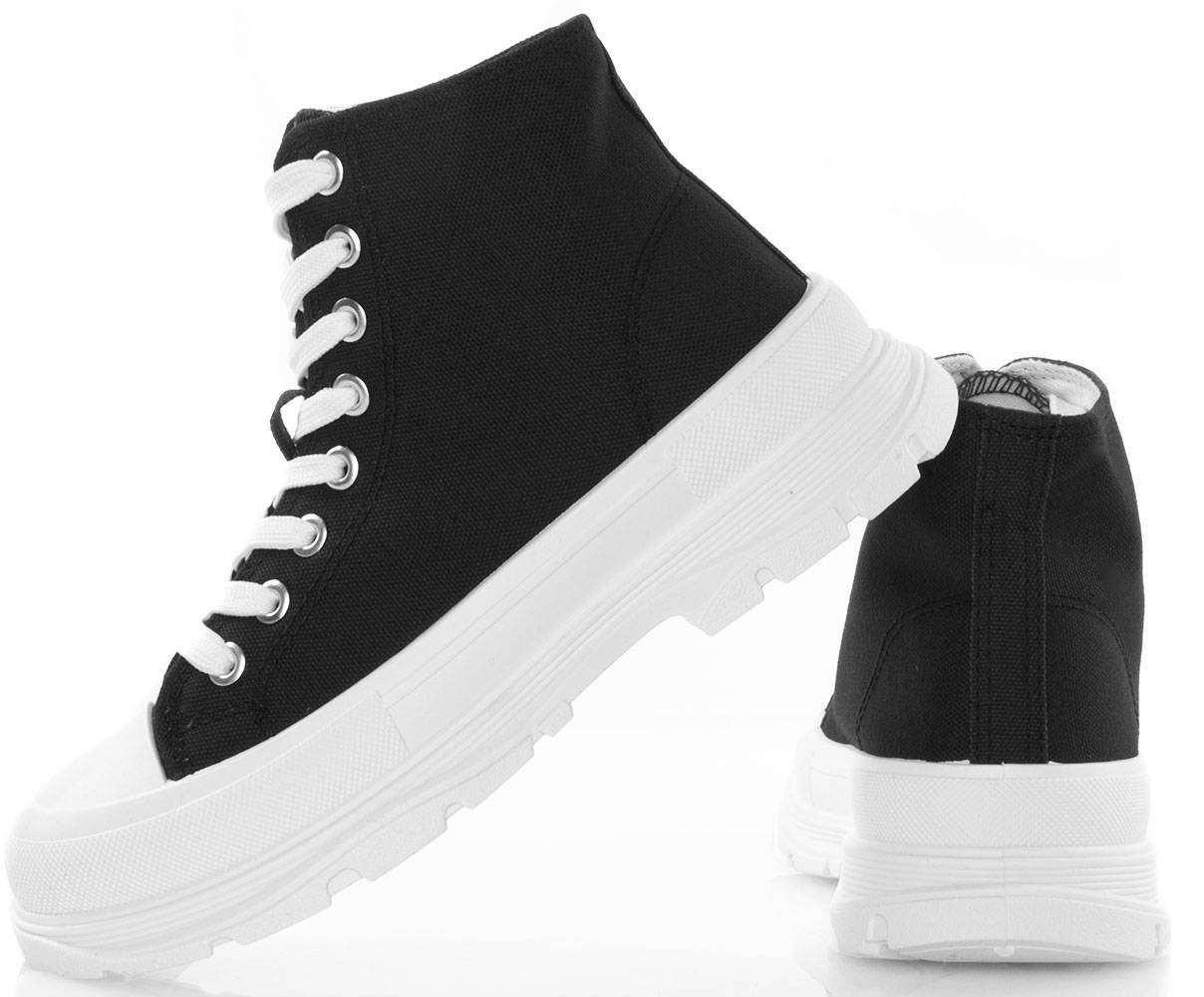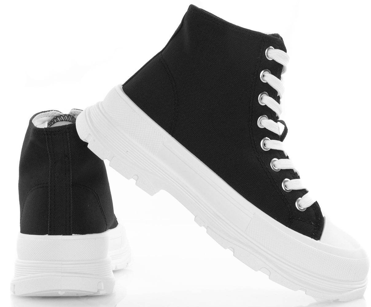 • Damskie wysokie buty sportowe a'la trampki. Wykonane z materiału tkaninowego na grubszej, wygodnej podeszwie z platformą. Model ze sznurowaną cholewką, tkaninowa wkładka.