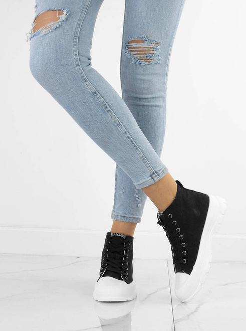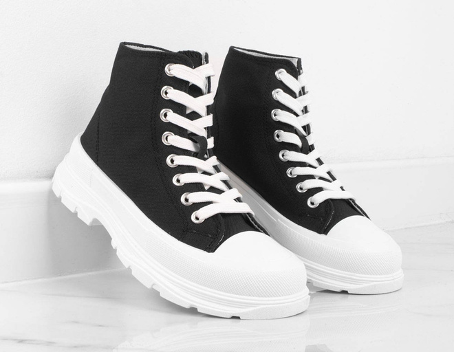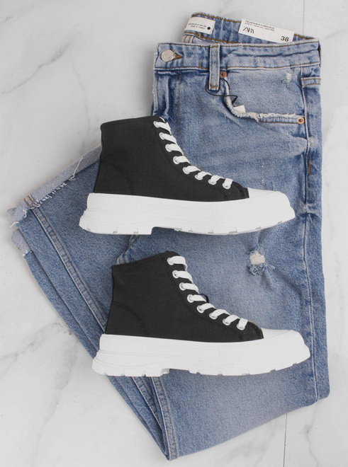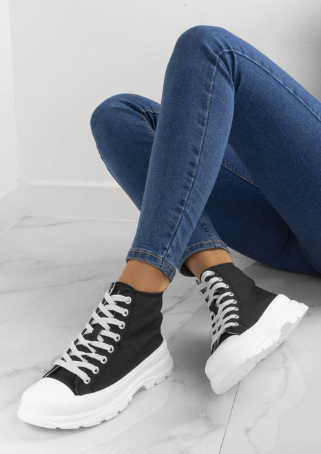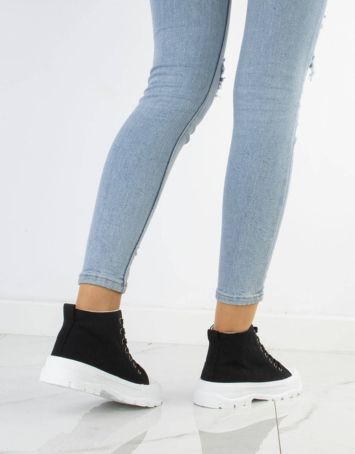 Damskie wysokie buty sportowe a'la trampki. Wykonane z materiału tkaninowego na grubszej, wygodnej podeszwie z platformą. Model ze sznurowaną cholewką, tkaninowa wkładka.