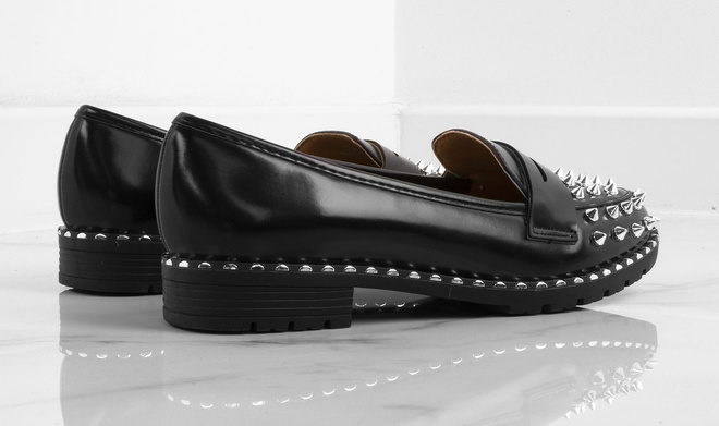 Wyjątkowe mokasyny ze skóry ekologicznej na profilowanej, płaskiej podeszwie. Piękna, głęboka czerń kolor oraz efektowne ozdoby w postaci ćwieków. Model solidnie i starannie wykonany. Obuwie idealne do tworzenia najmodniejszych stylizacji!