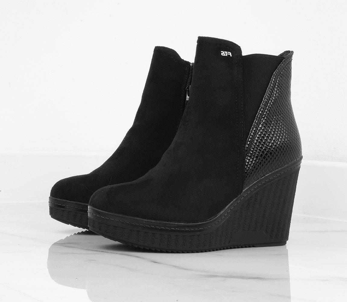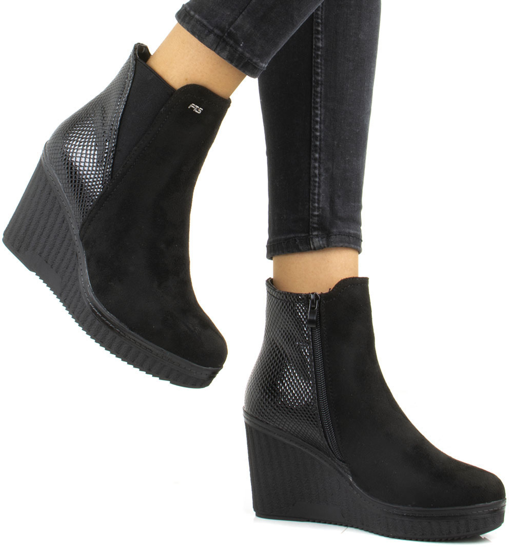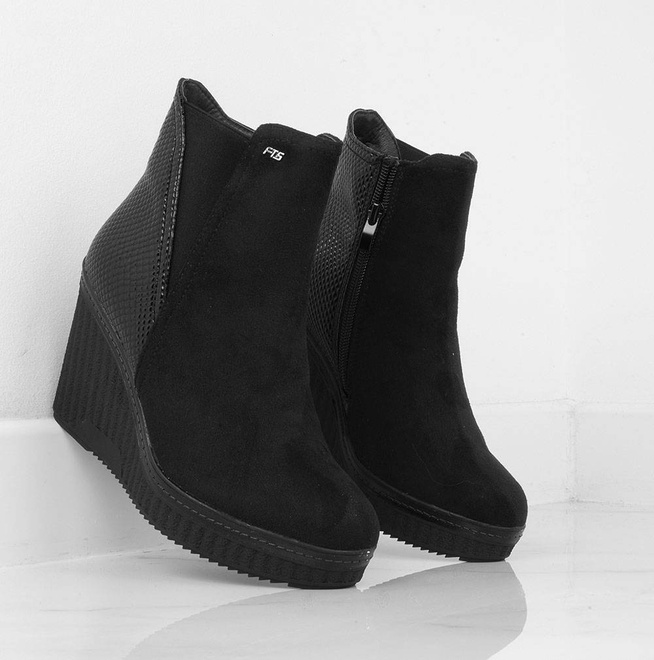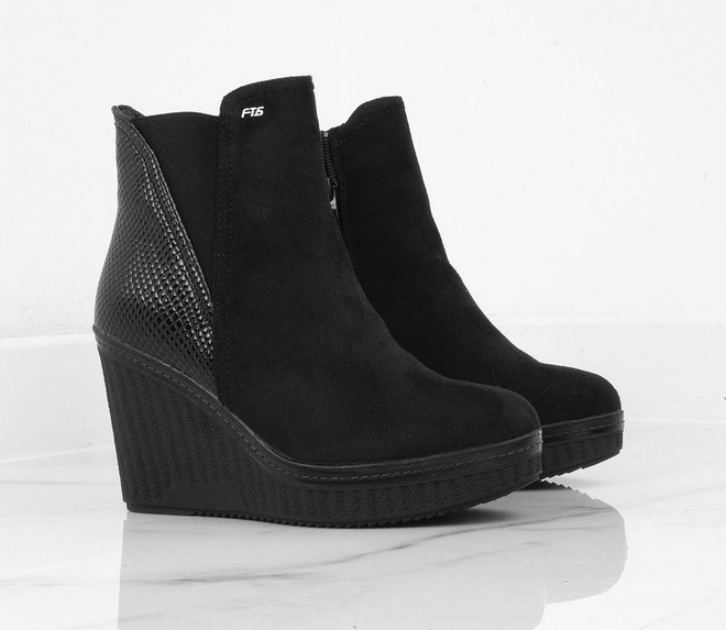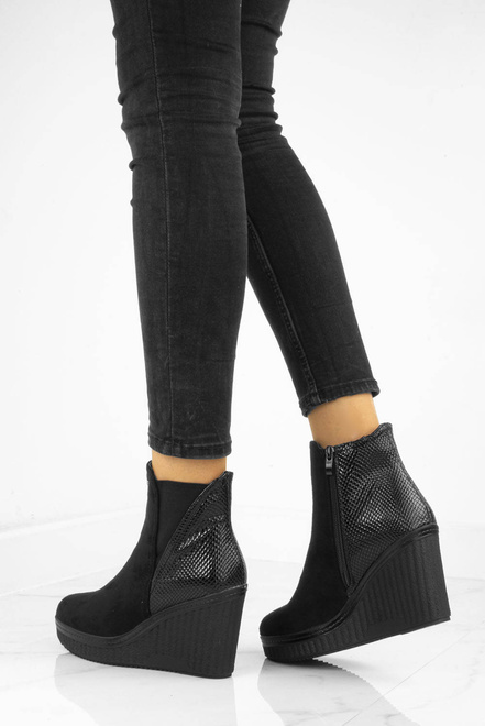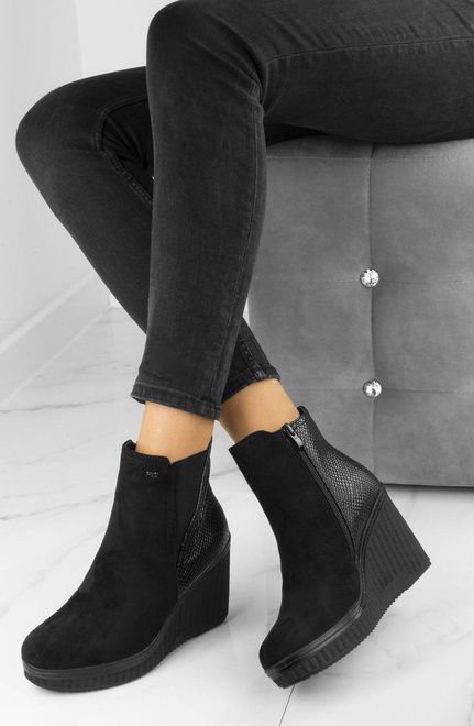 Botki wykonane z zamszu, na stabilnej i wygodnej koturnie. Model posiada delikatnie ocieplenie, zapięcie na suwak.