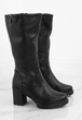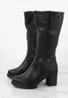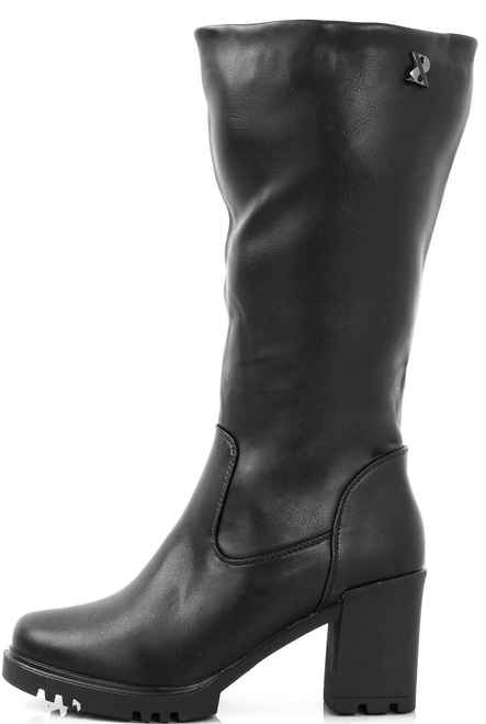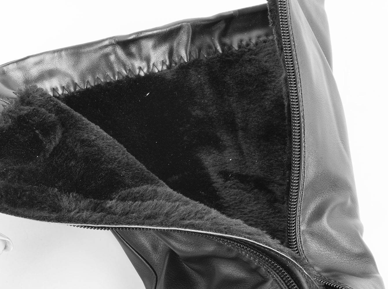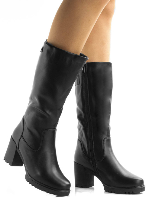 Klasyczne czarne kozaki na obcasie wykonane ze skóry ekologicznej. Ocieplane grubym futerkiem, idealne na jesień i zimę. Na całej długości cholewki znajduje się zamek dzięki czemu zakładanie jest niezwykle łatwe. W górnej części cholewki elastyczna wstawka dzięki czemu buty ładnie dopasowują się do łydki. Antypoślizgowa podeszwa typu traper.