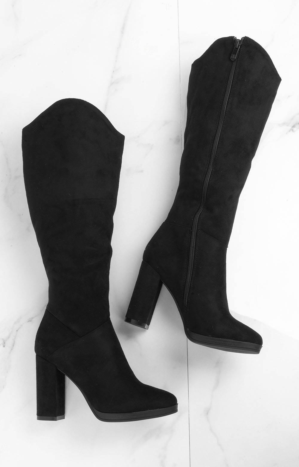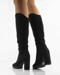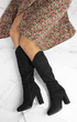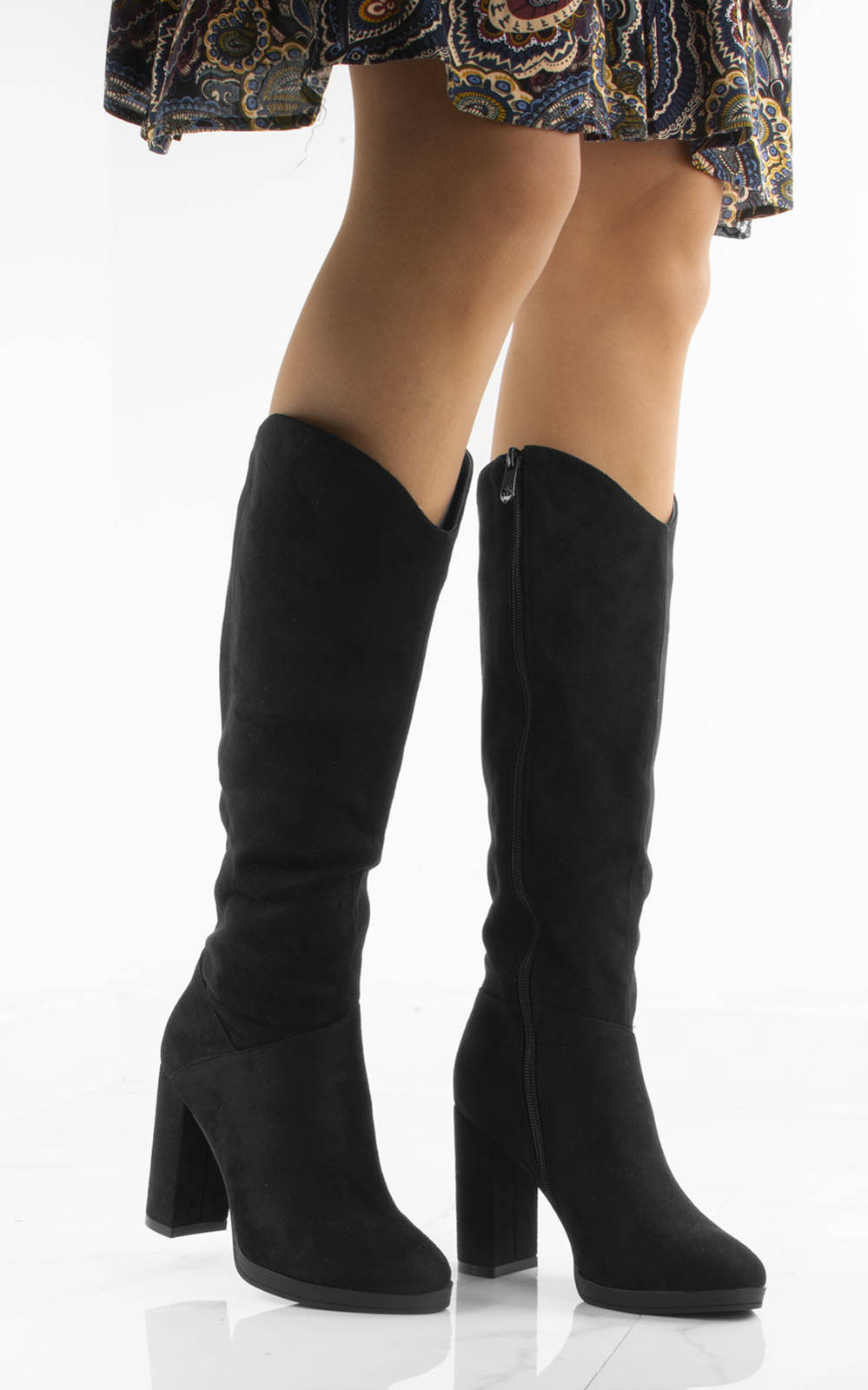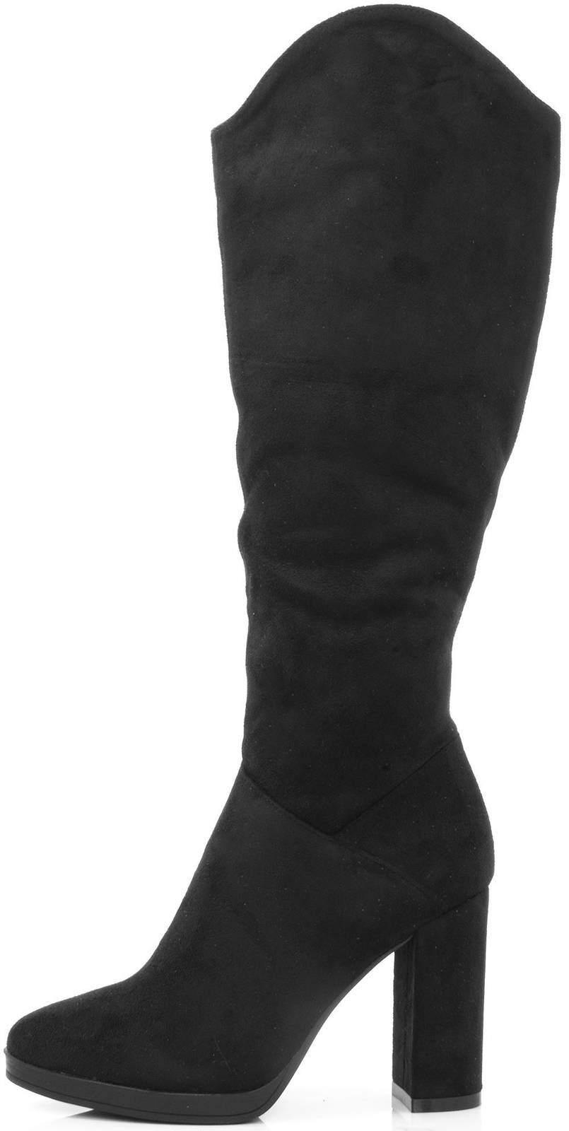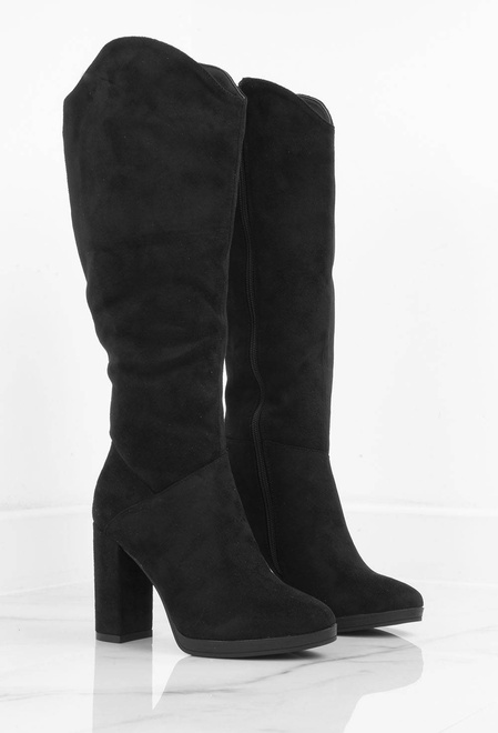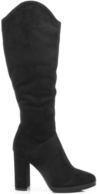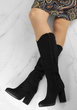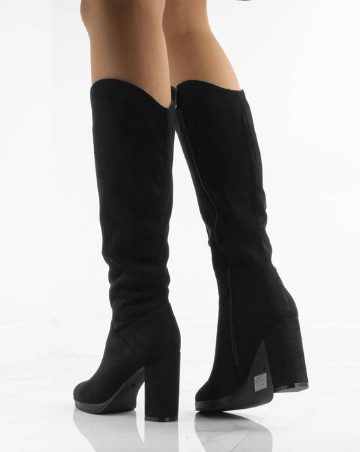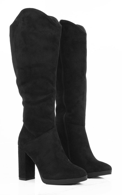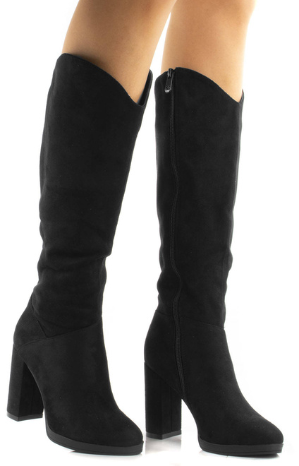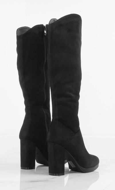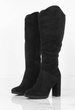 Stylowe kozaki damskie wykonane z zamszu ekologicznego. Cholewka sięgająca przed kolano to najmodniejszy fason tegorocznego sezonu jesienno-zimowego. Stabilny obcas typu słupek, zgrabny migdałowy przód butów. Zapinane na suwak (na całek długości cholewki). Wewnątrz ocieplane futerkiem widocznym na zdjęciu.