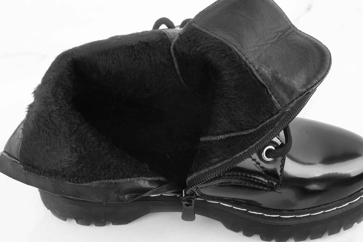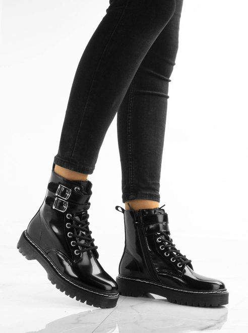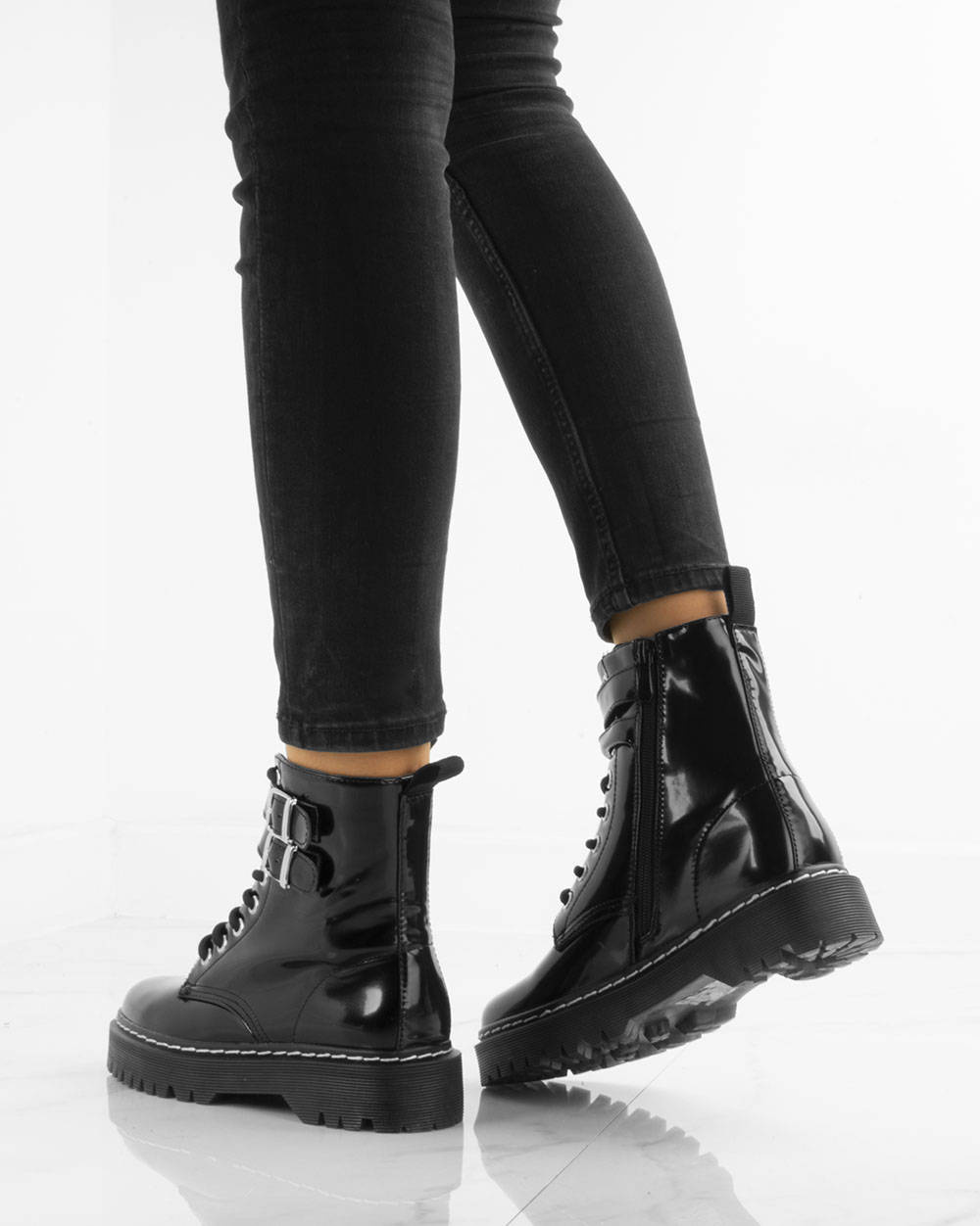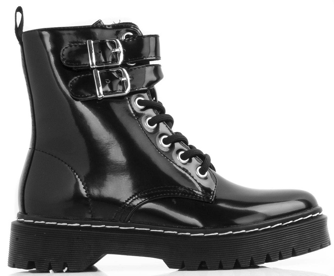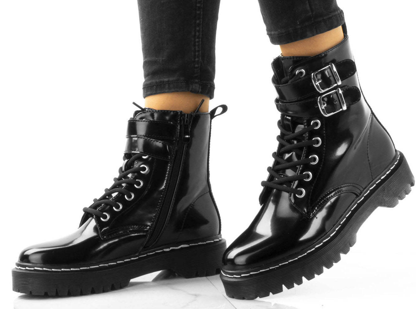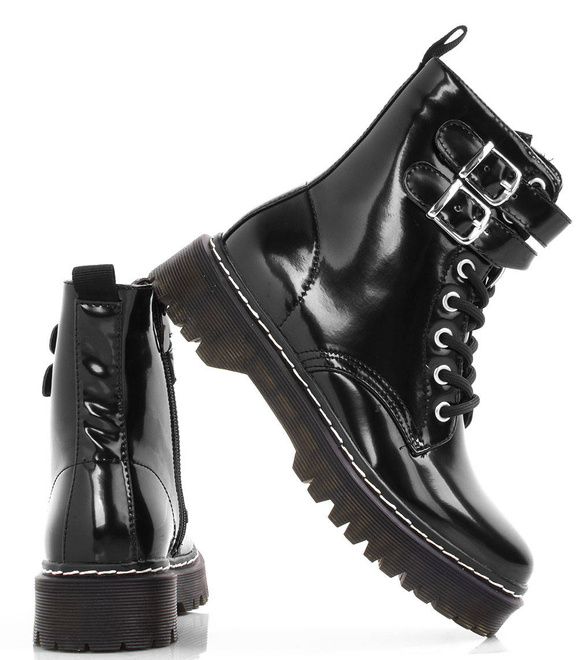 Stylowe botki damskie typu glany. Antypoślizgowa podeszwa typu traper idealna na jesień i zimę. Wnętrze buta wyłożone delikatnym futerkiem widocznym na zdjęciu. Modna, srebrna klamerka w górnej części cholewki dodaje charakteru.