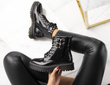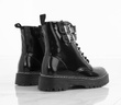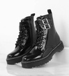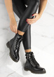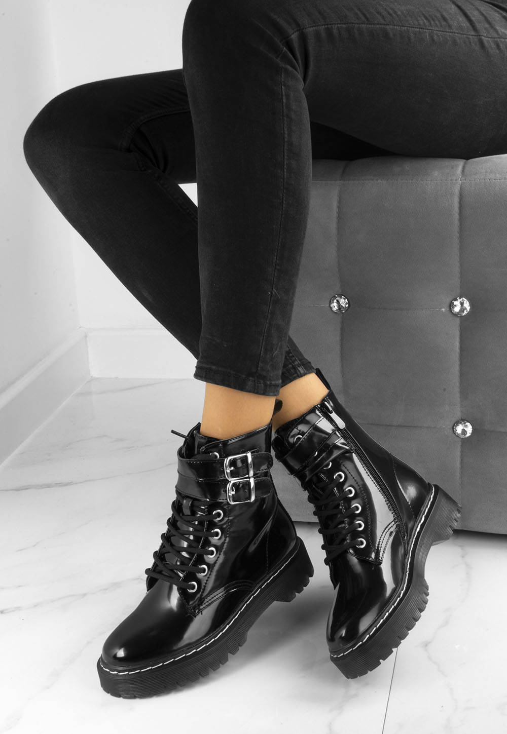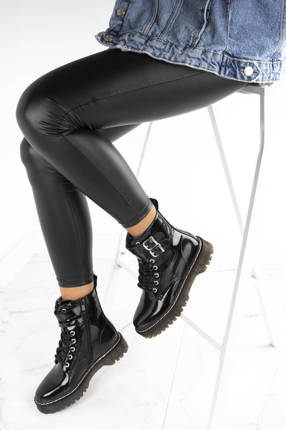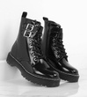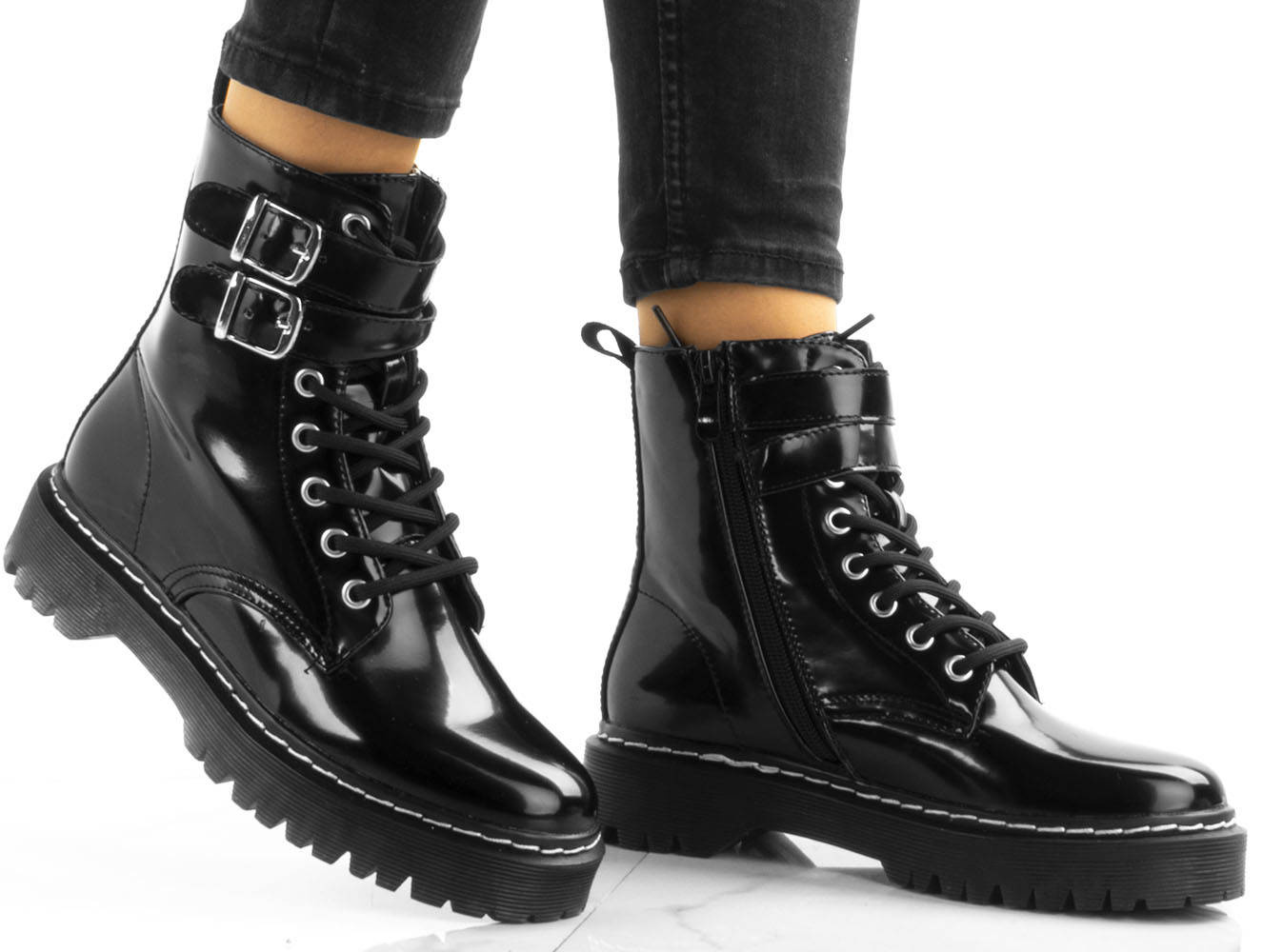 Stylowe botki damskie typu glany. Antypoślizgowa podeszwa typu traper idealna na jesień i zimę. Wnętrze buta wyłożone delikatnym futerkiem widocznym na zdjęciu. Modna, srebrna klamerka w górnej części cholewki dodaje charakteru.