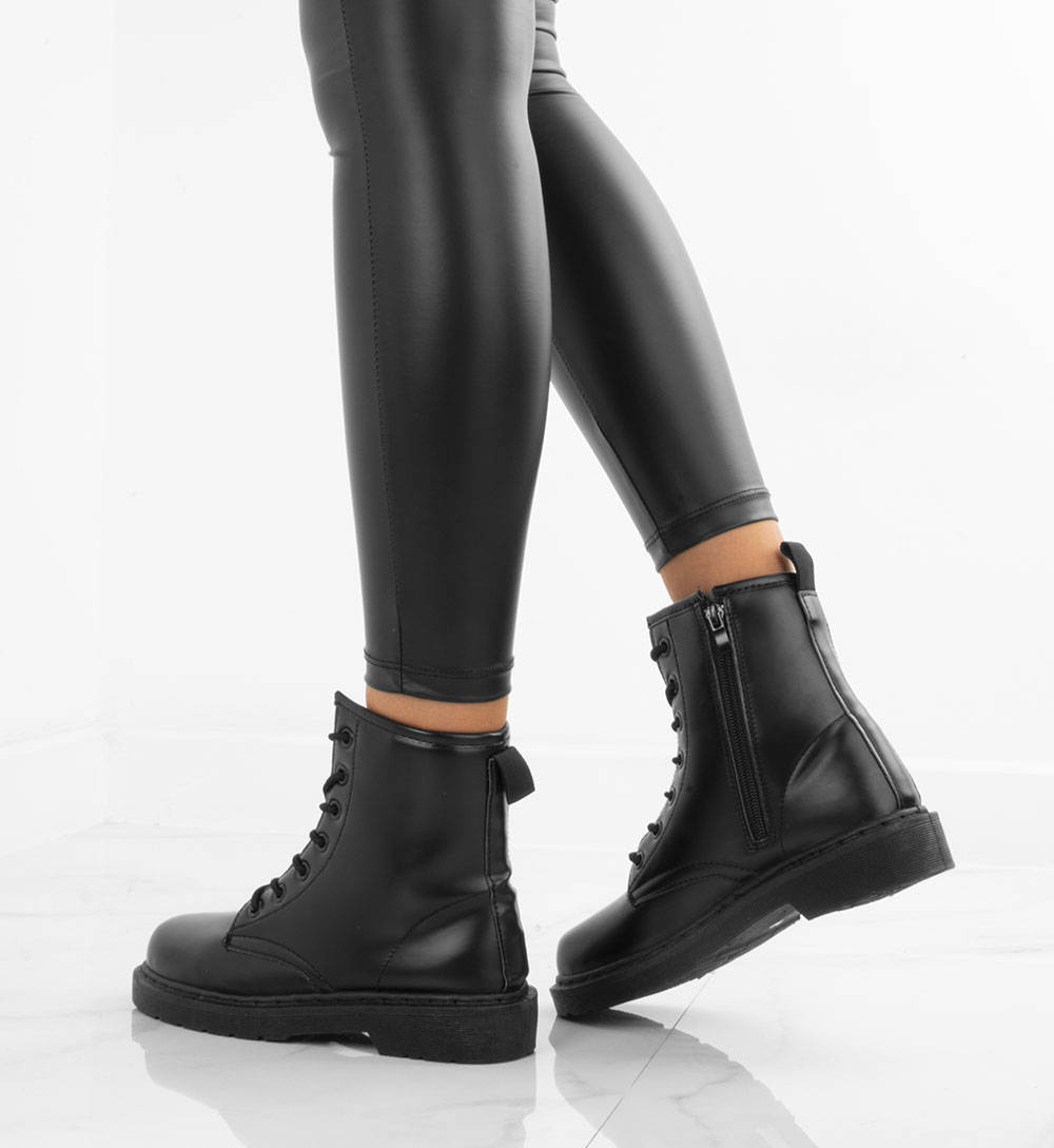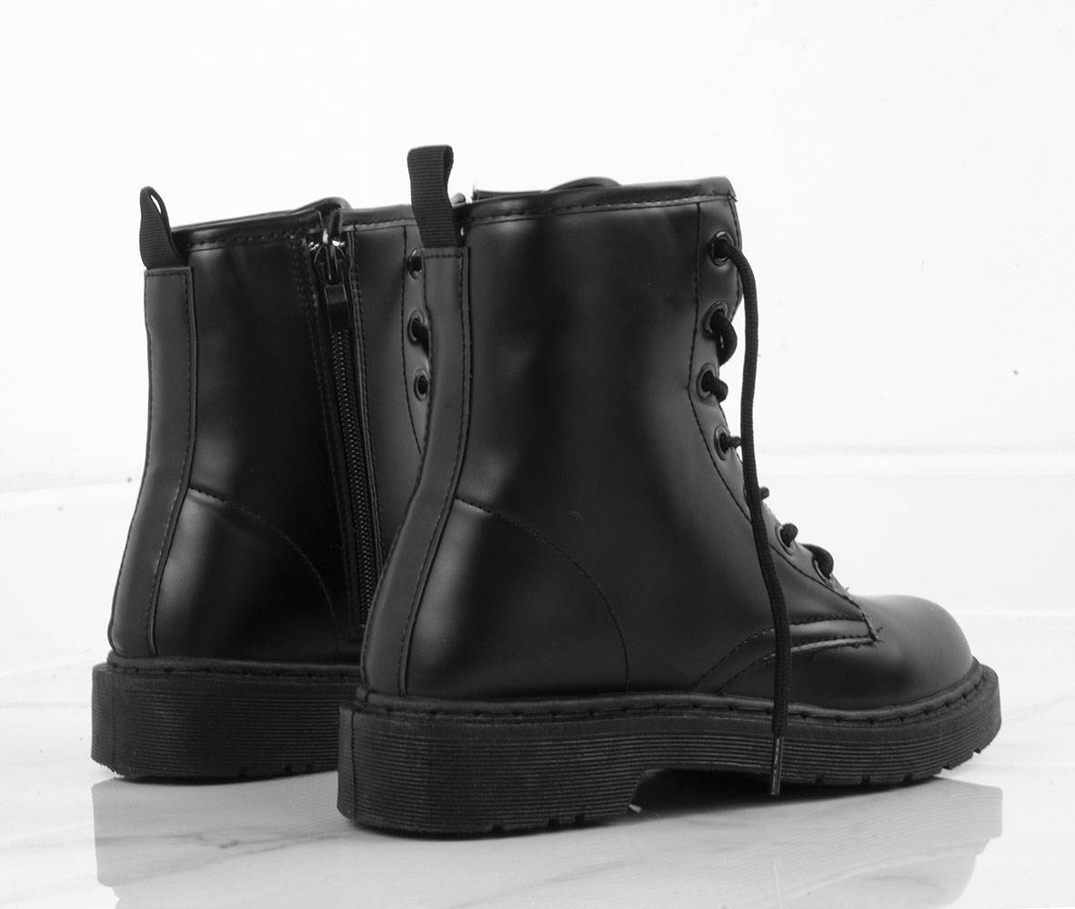 Stylowe botki damskie typu glany. Antypoślizgowa podeszwa typu traper idealna na jesień i zimę. Wnętrze buta wyłożone delikatnym futerkiem widocznym na zdjęciu. Suwak + sznurowanie sprawiają że buty są bardzo łatwe w zakładaniu.