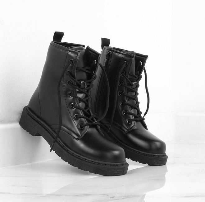 • Stylowe botki damskie typu glany. Antypoślizgowa podeszwa typu traper idealna na jesień i zimę. Wnętrze buta wyłożone delikatnym futerkiem widocznym na zdjęciu.