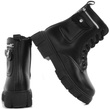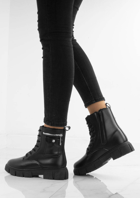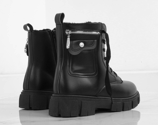 • Czarne trapery wykonane ze skóry ekologicznej. Model sznurowany i zapinany suwakiem co ułatwia zakładanie. Wnętrze buta ocieplone grubym futerkiem. Obuwie posiada kieszonkę zasuwaną suwakiem.