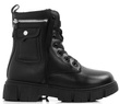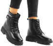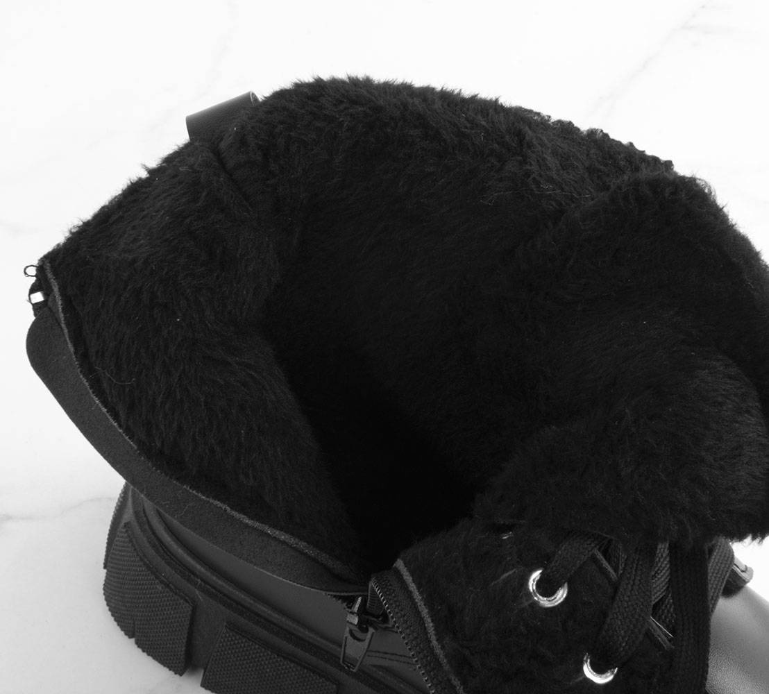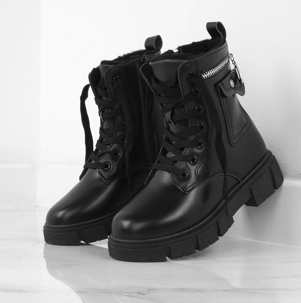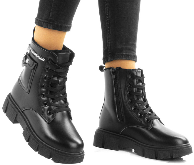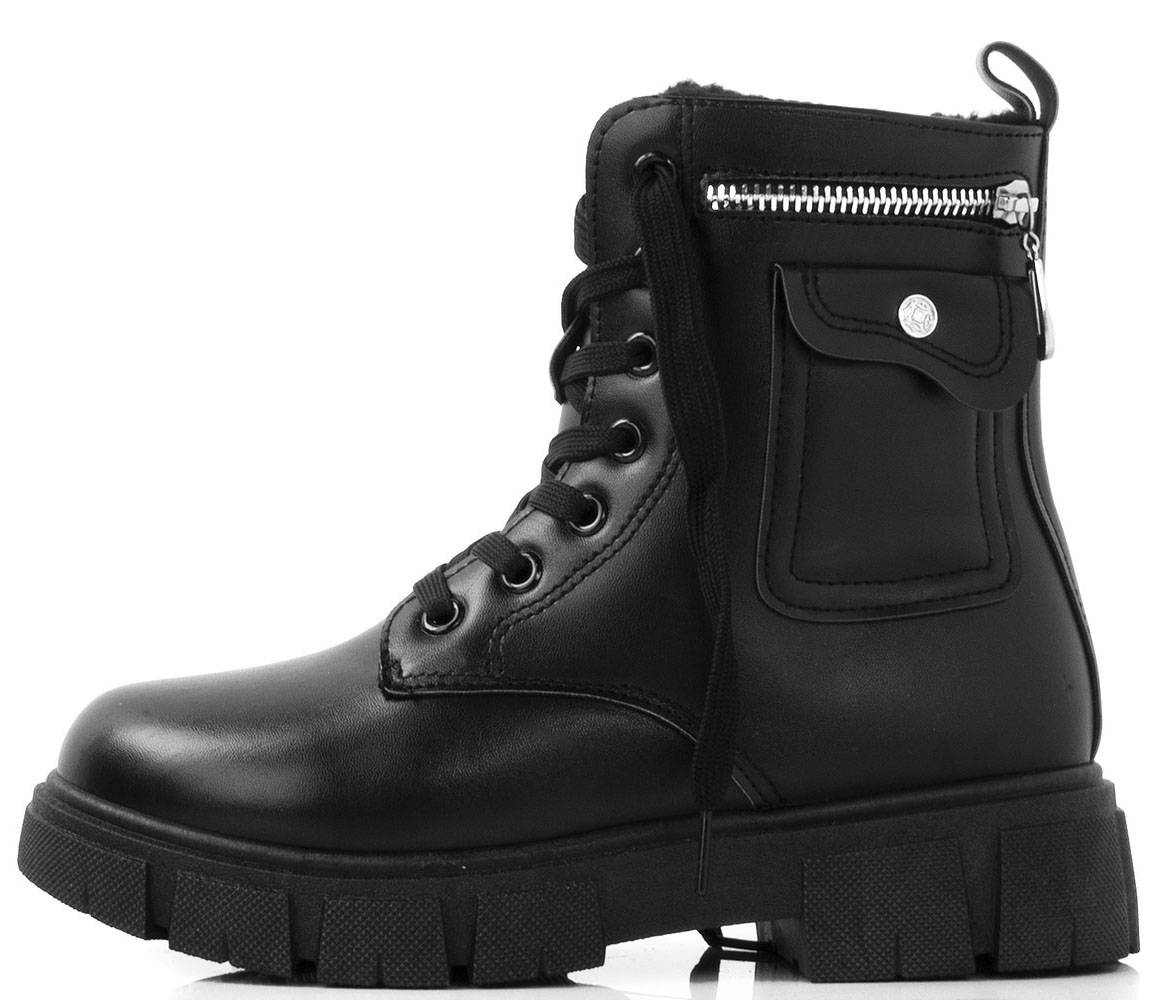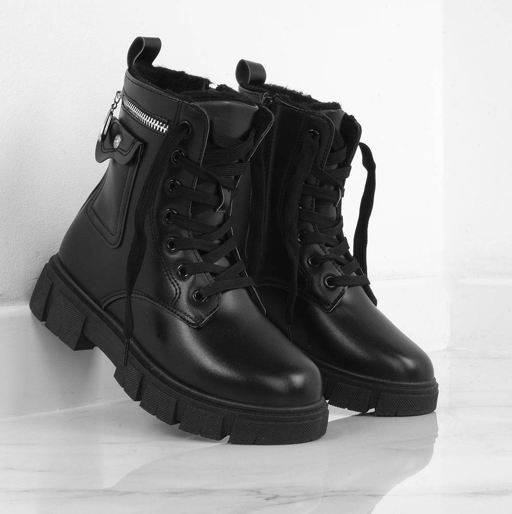 Czarne trapery wykonane ze skóry ekologicznej. Model sznurowany i zapinany suwakiem co ułatwia zakładanie. Wnętrze buta ocieplone grubym futerkiem. Obuwie posiada kieszonkę zasuwaną suwakiem.