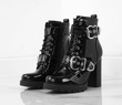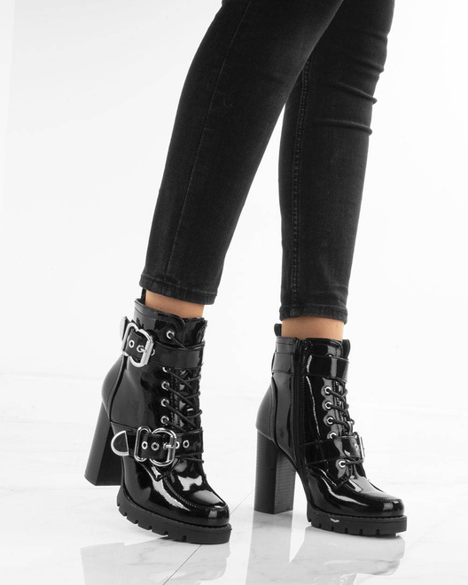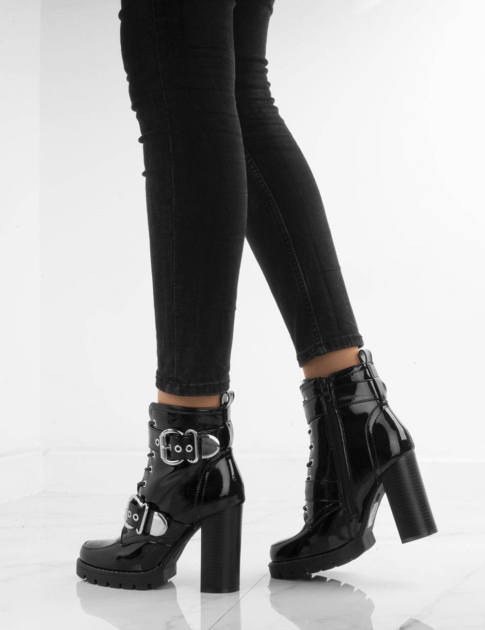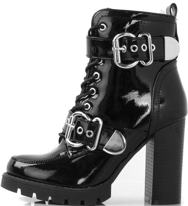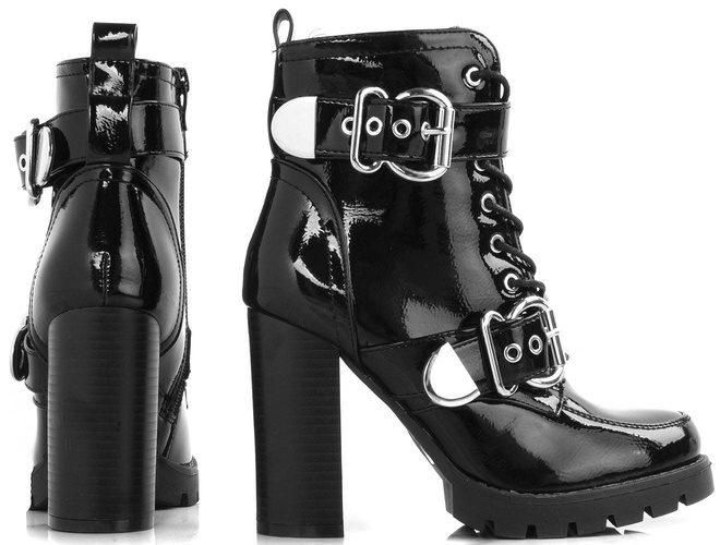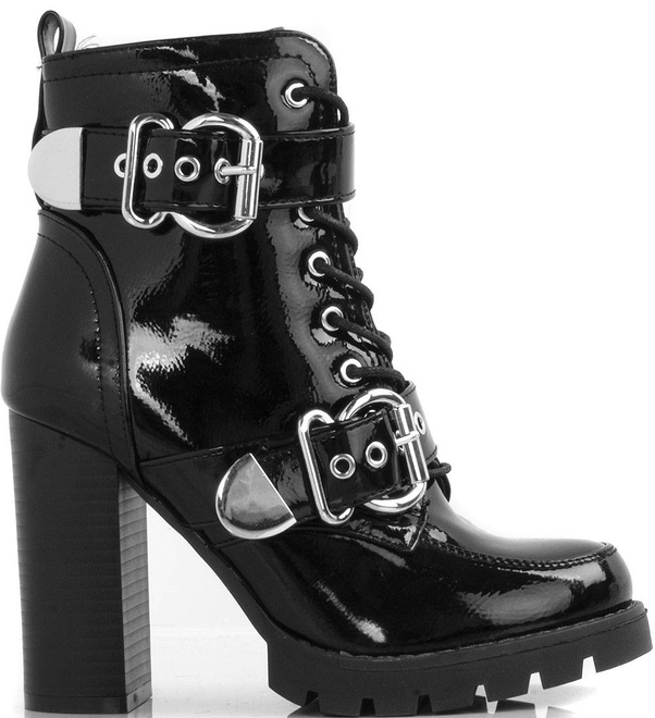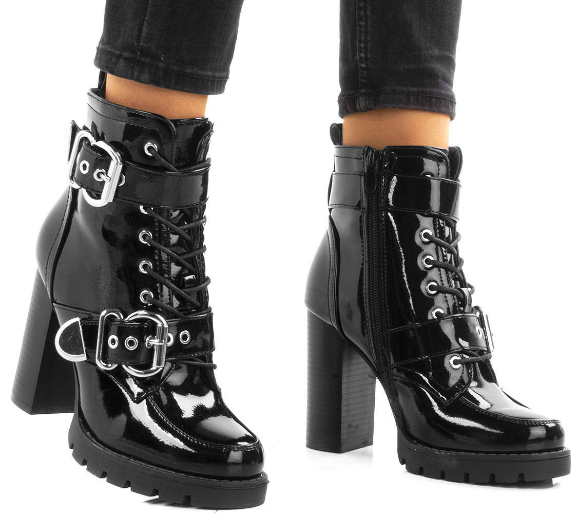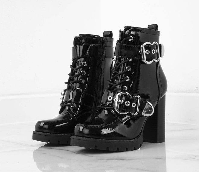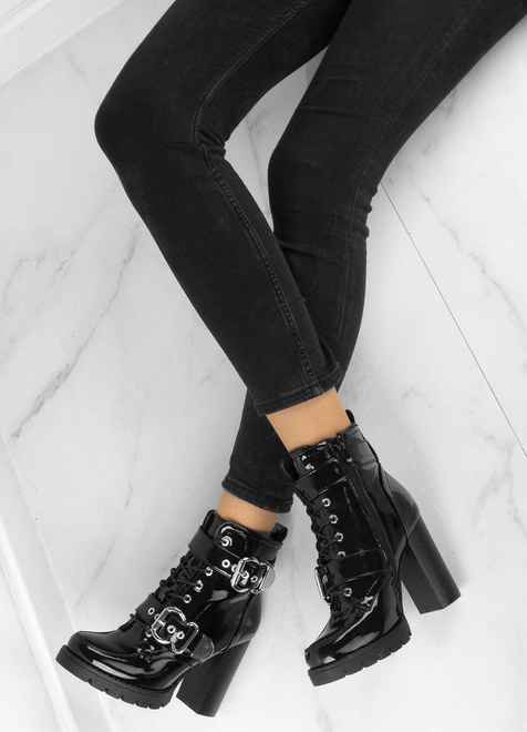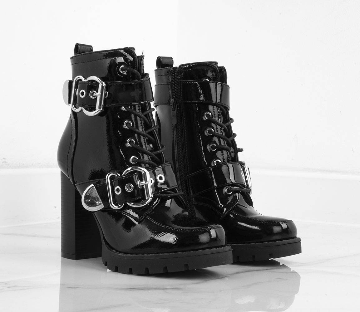 Efektowne damskie lakierowane botki na wyższym obcasie. Model ocieplony delikatnym futerkiem, posiada dwa ozdobne paski z klamrą. Podwójne zapięcie : sznurowanie oraz zamek ułatwia zakładanie.