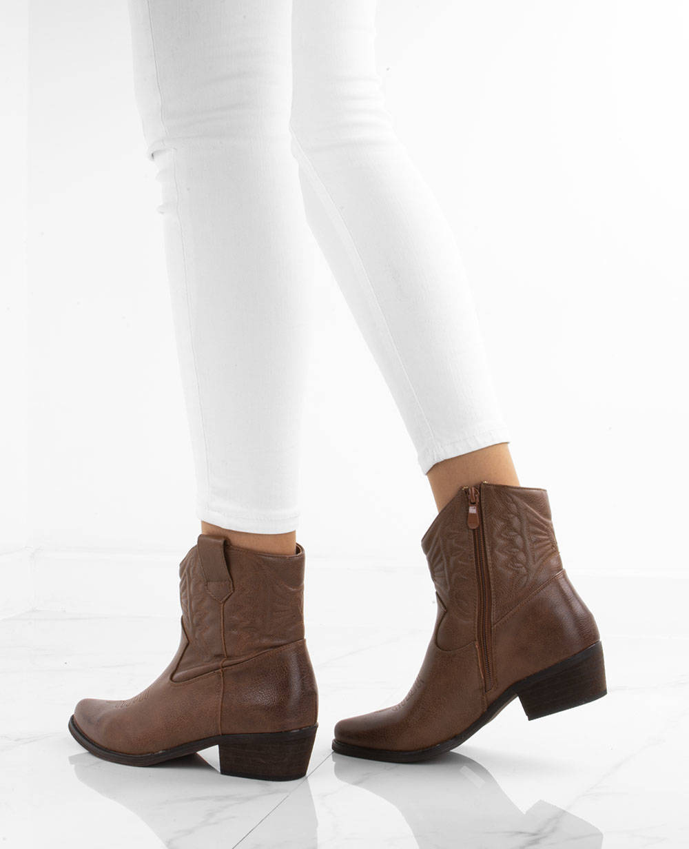Doskonałe damskie botki a'la kowbojki o klasycznym fasonie, wykonane ze skóry ekologicznej. Model jest delikatnie ocieplony futerkiem w środku. Para posiada zapięcie na suwaki po boku i zdobienie haftem.
