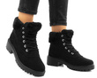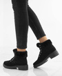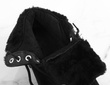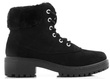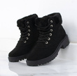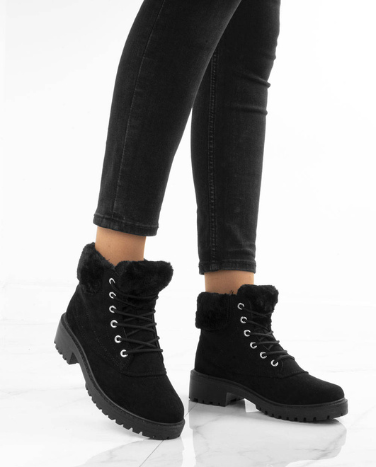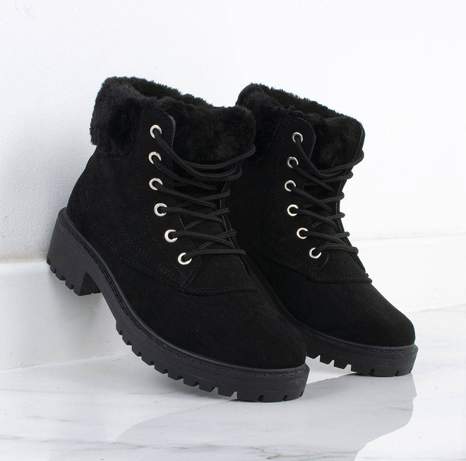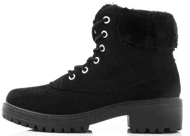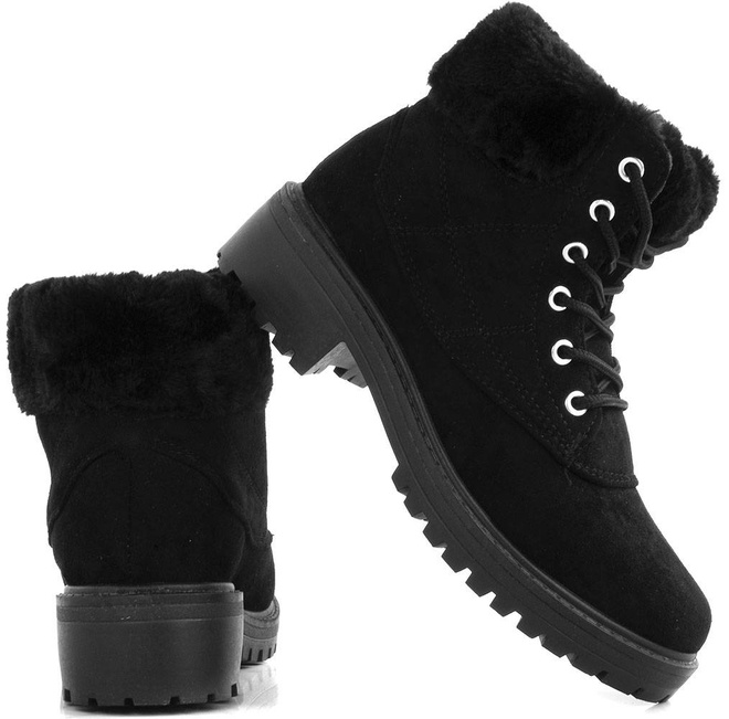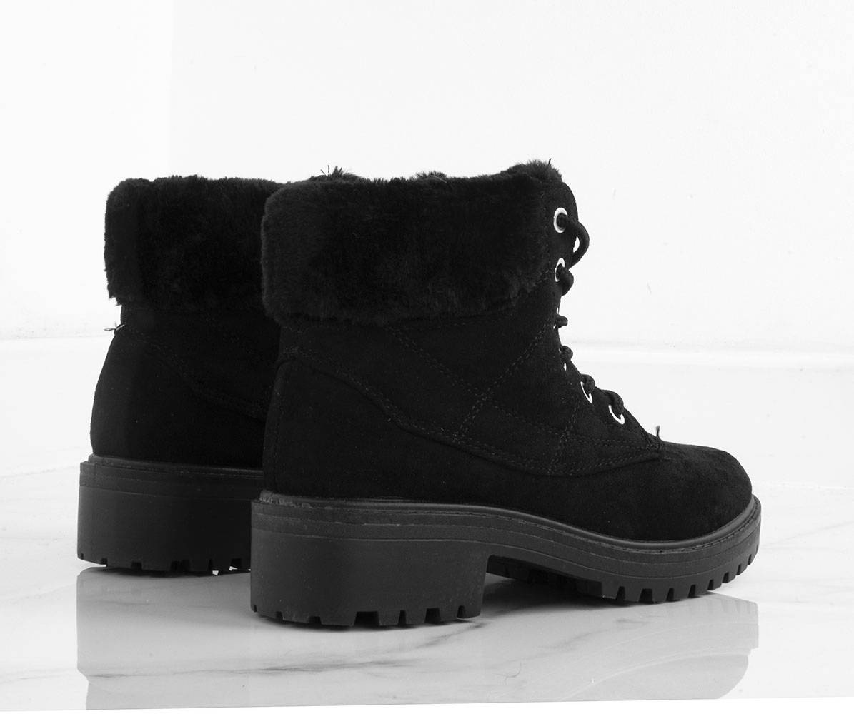 Solidne trapery w kolorze czarnym, w środku ocieplone delikatnym futerkiem. Sznurowane, stabilne botki z antypoślizgową podeszwą. Zdobione grubym futerkiem na zewnątrz buta.