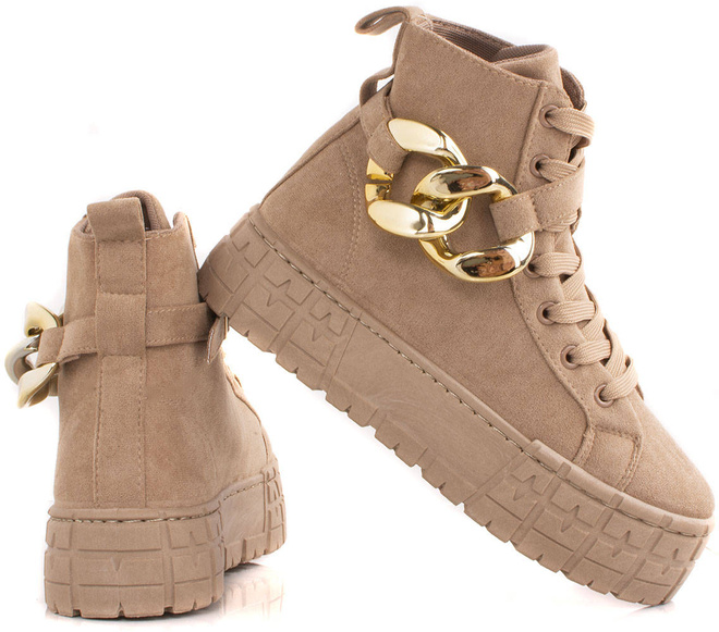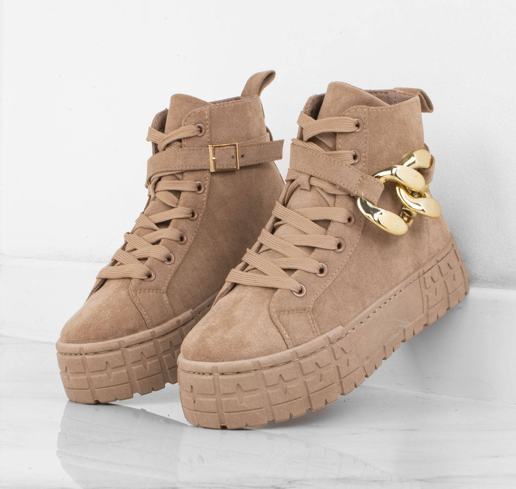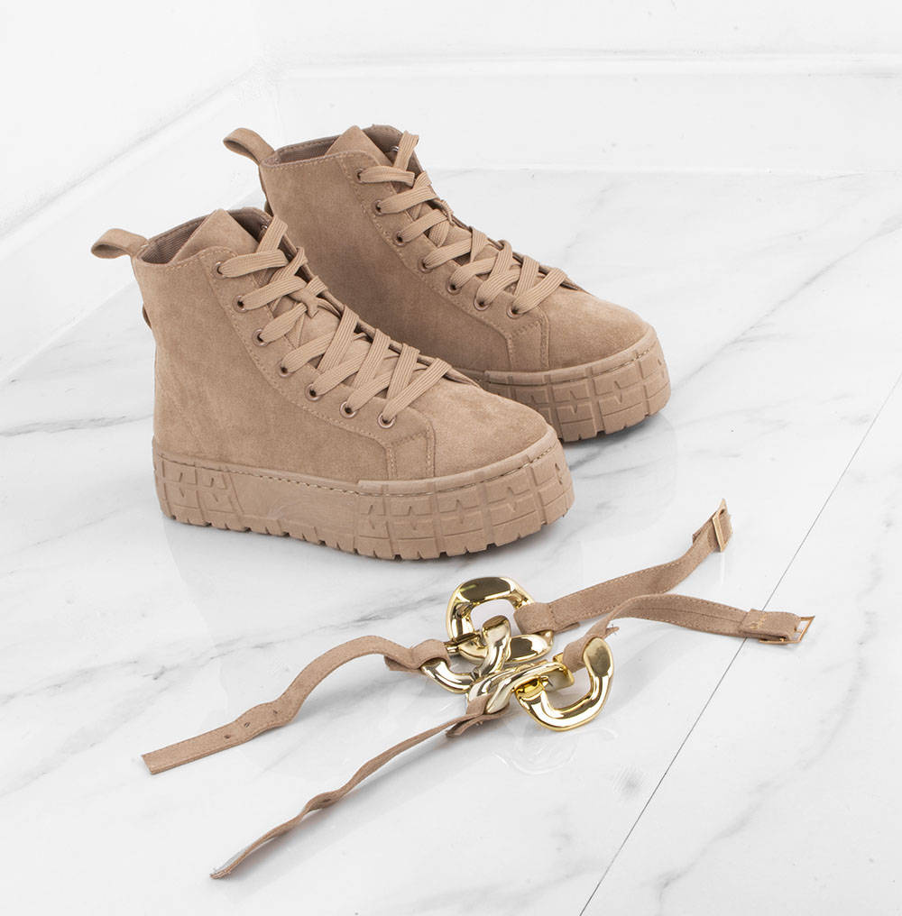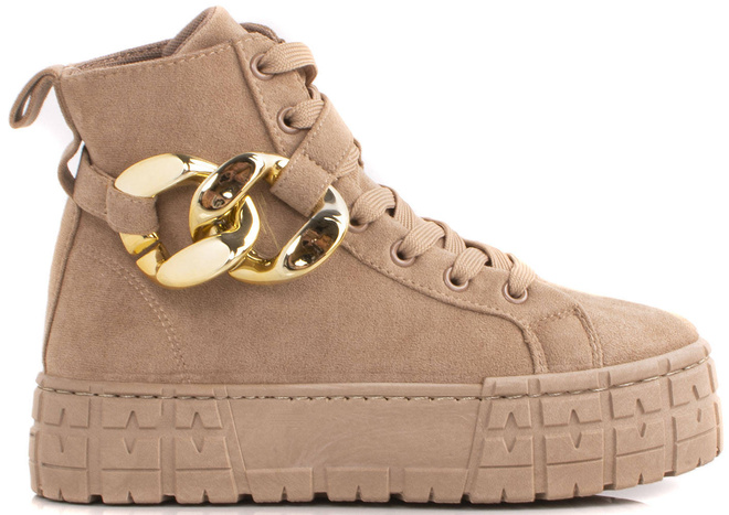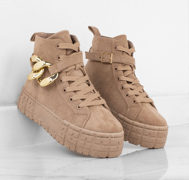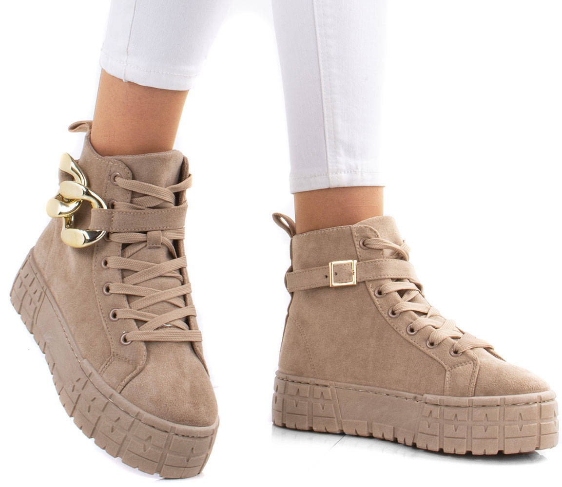 Trampki ala botki wykonane z materiału zamszowego. Posiadają platformę oraz odpinany ozdobny łańcuch.