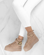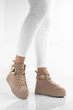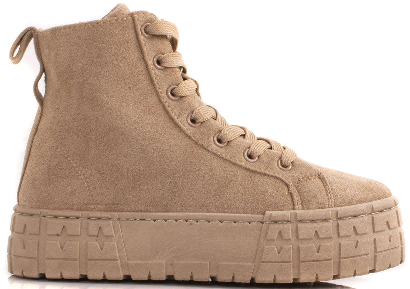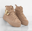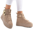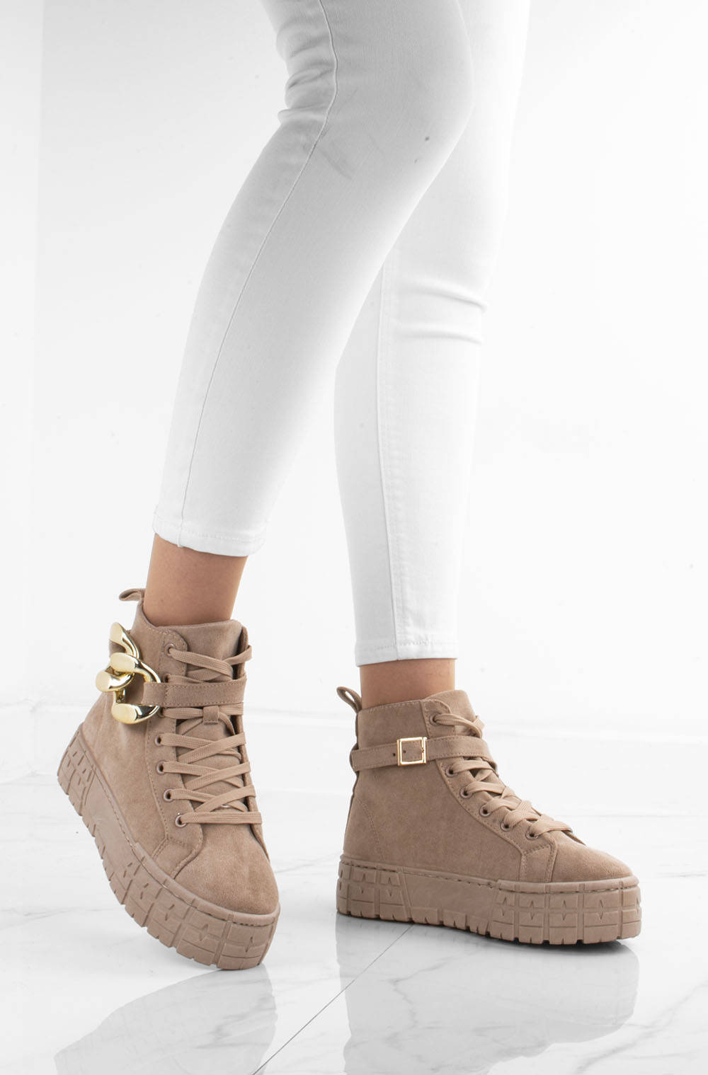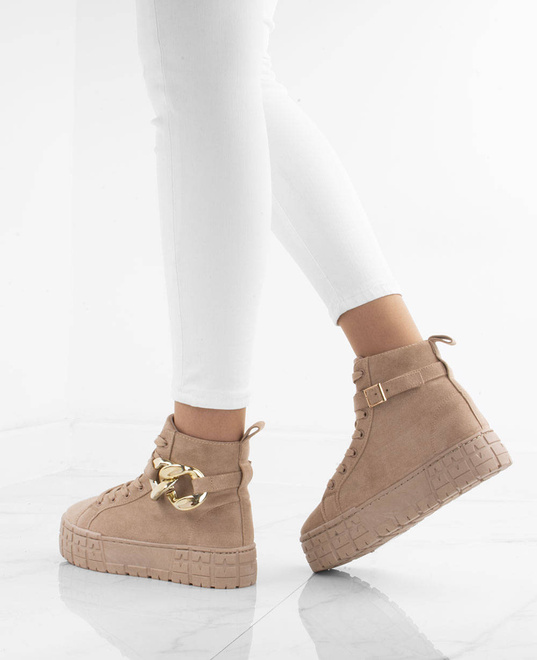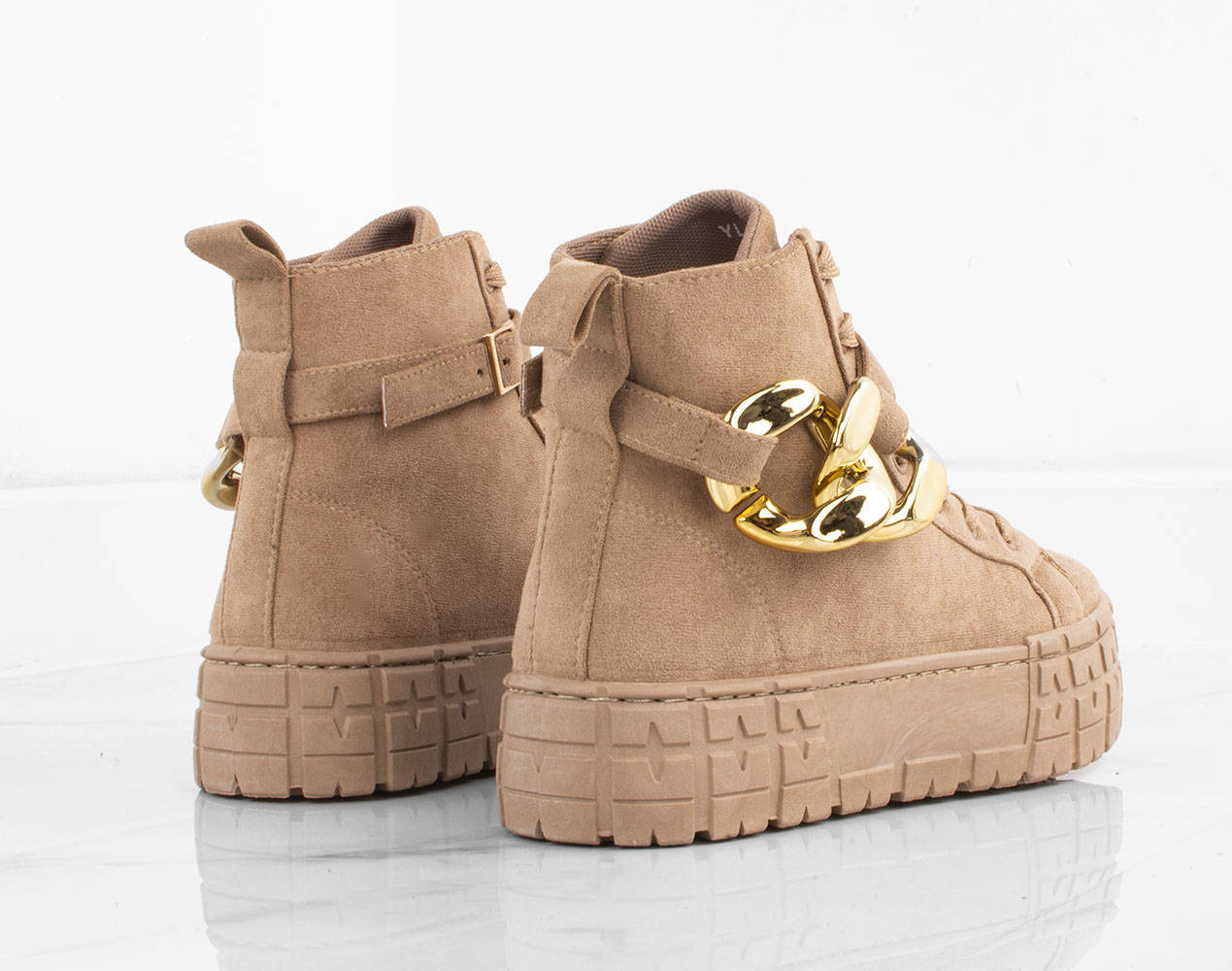 Trampki ala botki wykonane z materiału zamszowego. Posiadają platformę oraz odpinany ozdobny łańcuch.