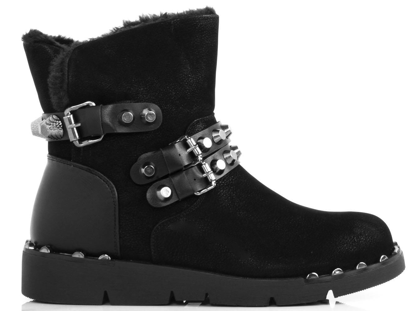 Śliczne damskie śniegowce na płaskiej podeszwie, wykonane ze skóry ekologicznej łączonej z nubukiem.. Środek buta ocieplony futerkiem ( wkładka również). Posiadają ozdobne ćwieki.