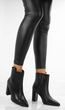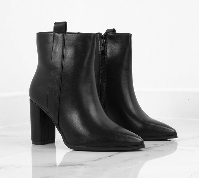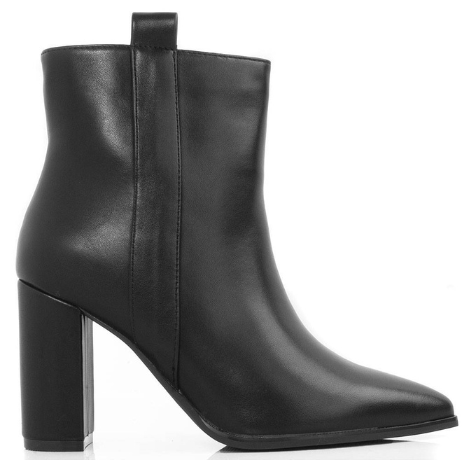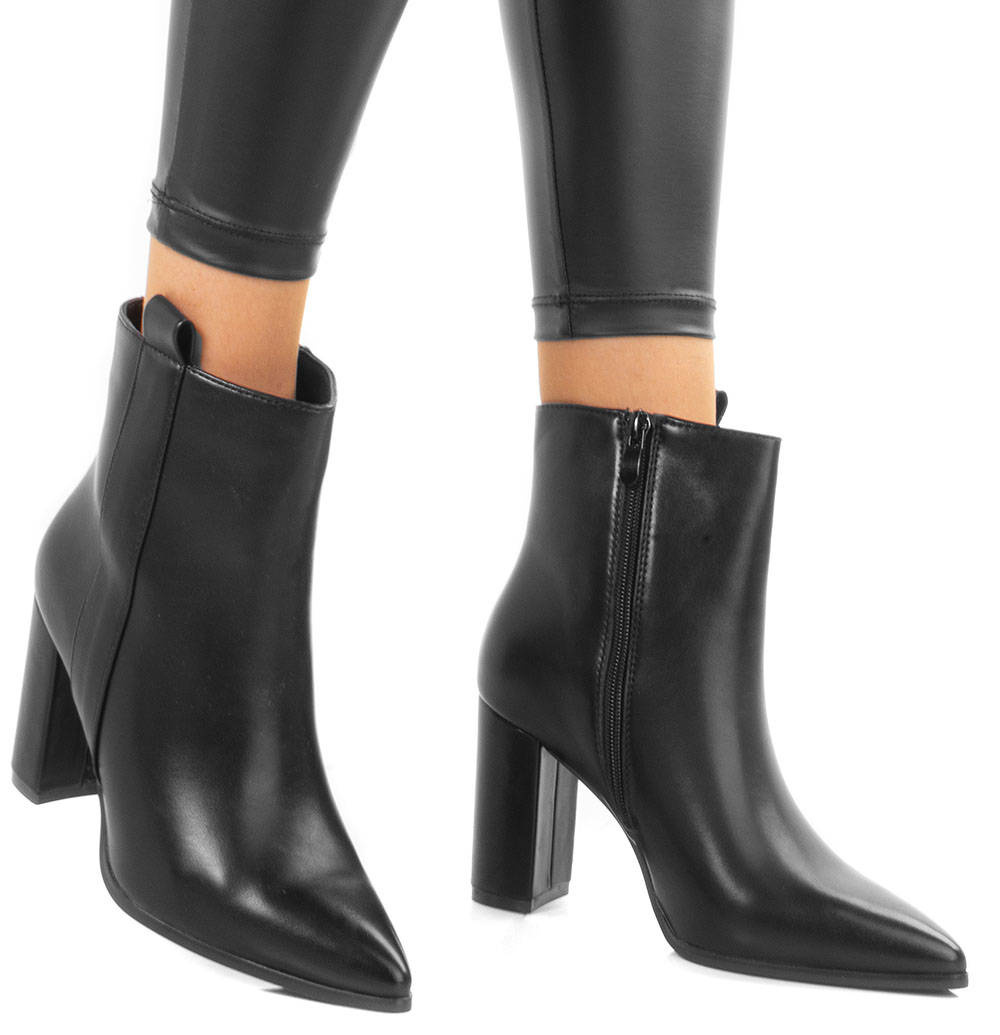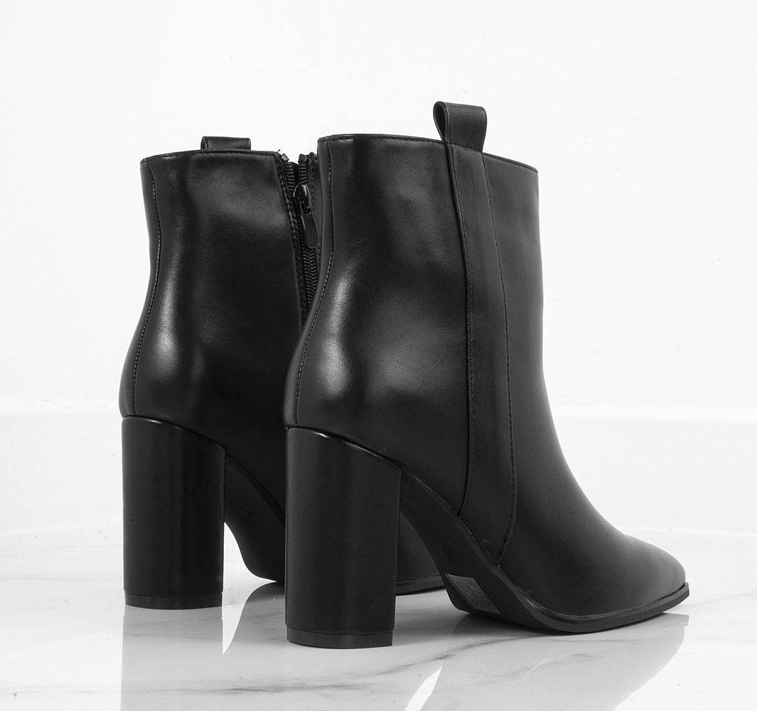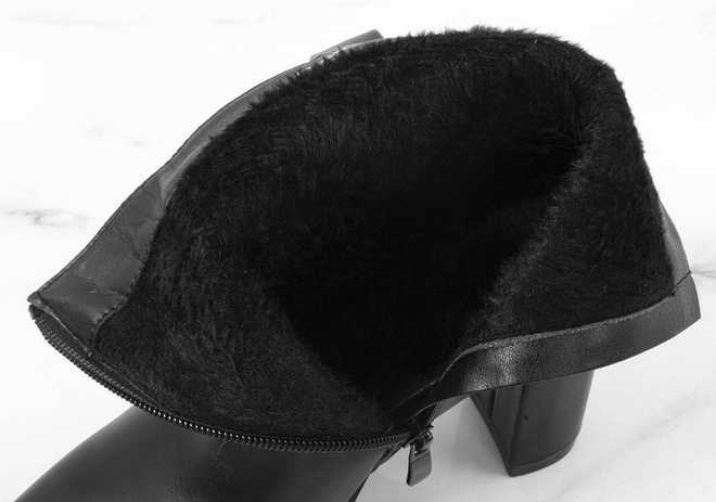 Klasyczne czarne botki wykonane ze skóry ekologicznej. Środek ocieplony delikatnym futerkiem. Na stabilnym słupku. Wygodne oraz modne!