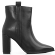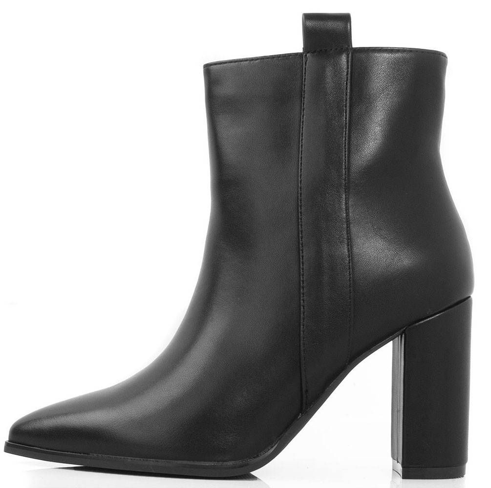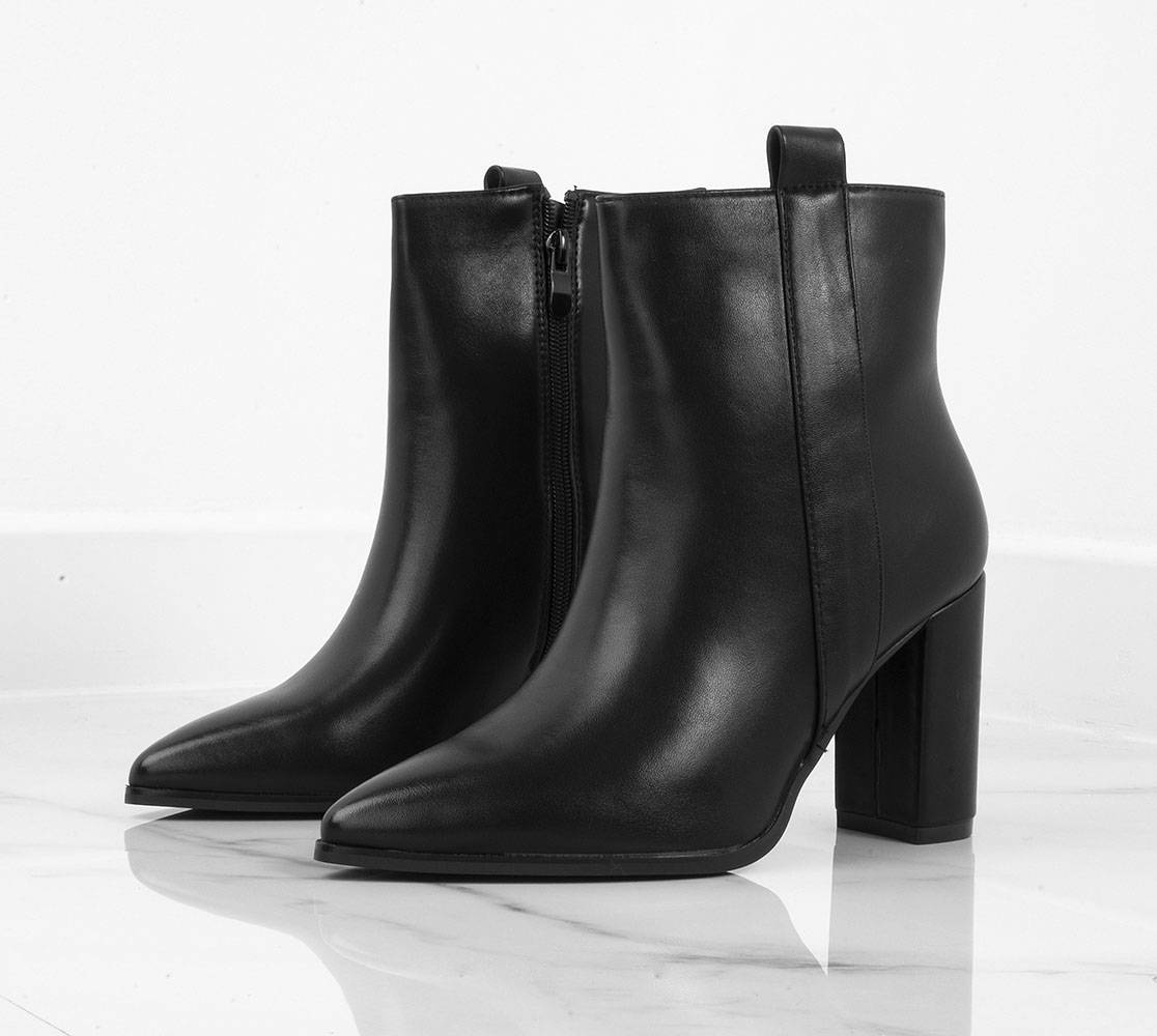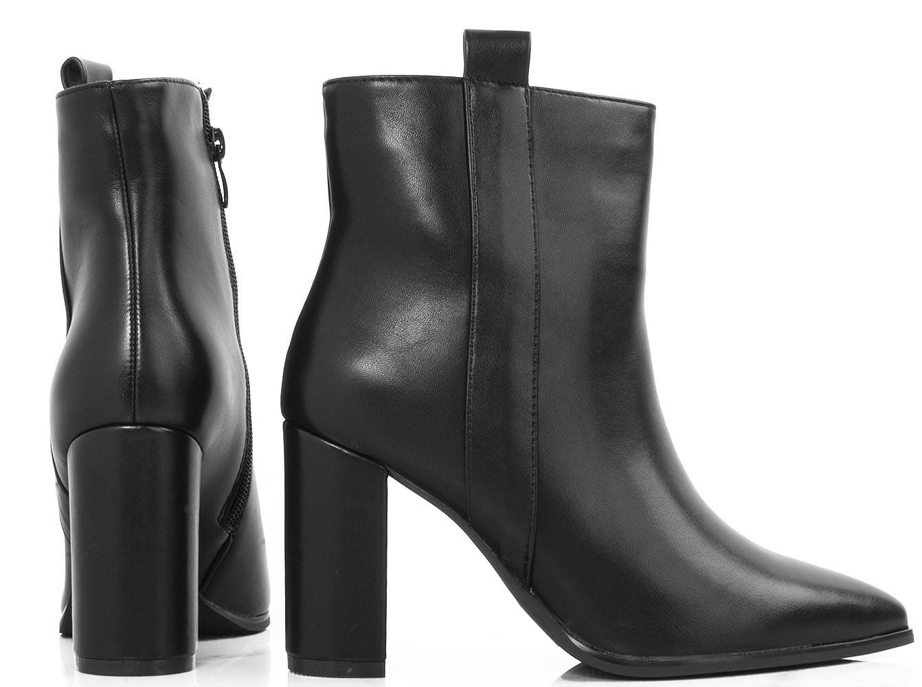 Klasyczne czarne botki wykonane ze skóry ekologicznej. Środek ocieplony delikatnym futerkiem. Na stabilnym słupku. Wygodne oraz modne!
