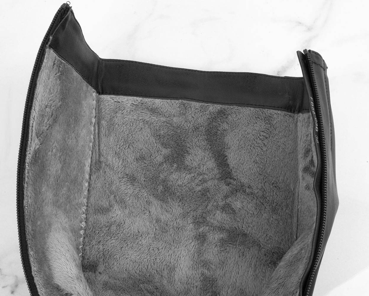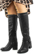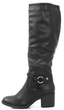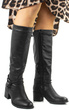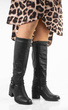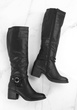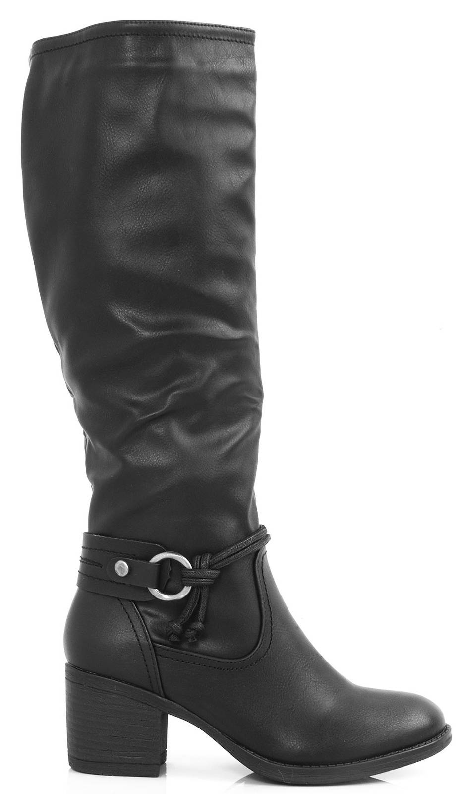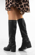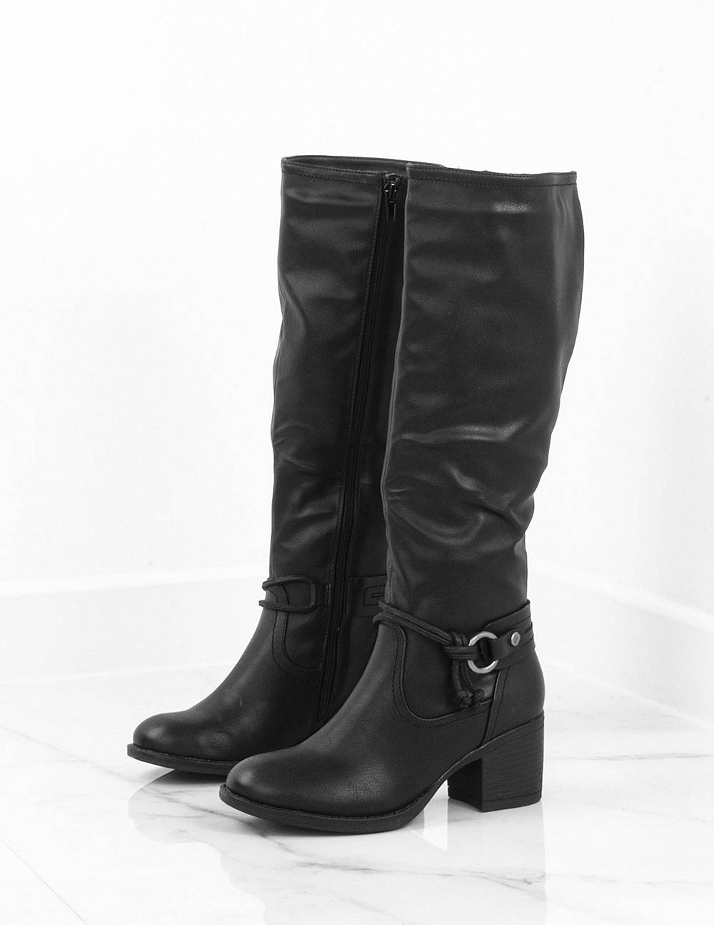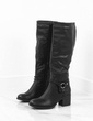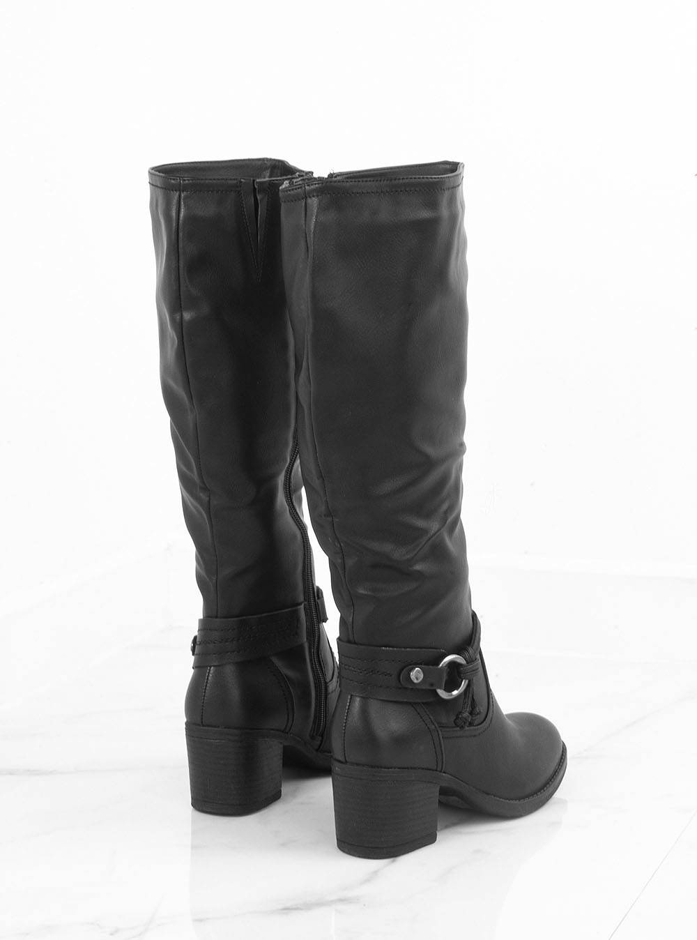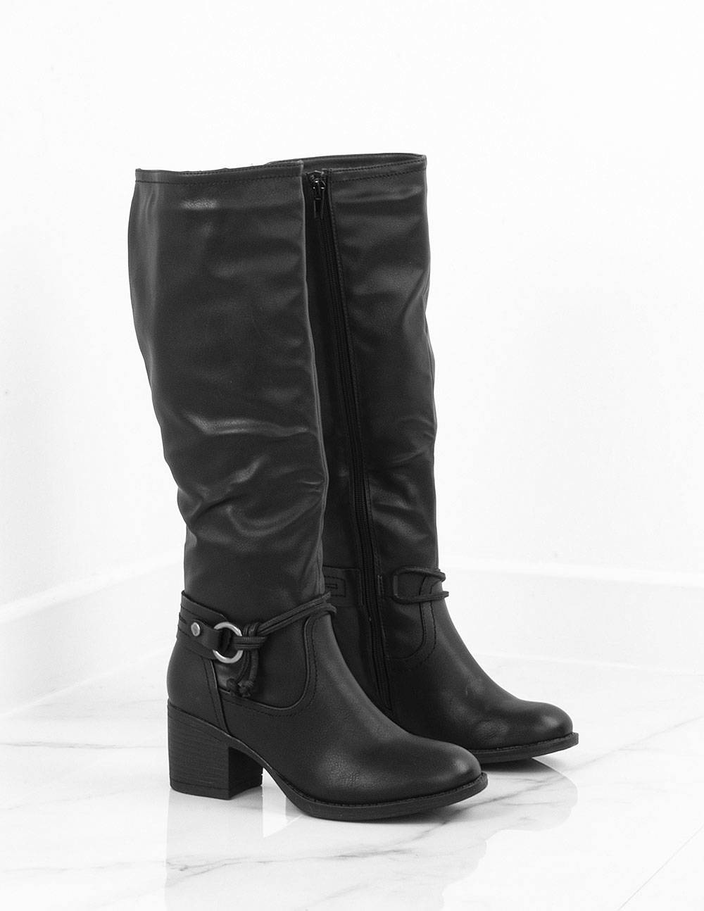 • Eleganckie czarne kozaki damskie. Cholewka wykonana ze skóry ekologicznej, w środku ocieplane delikatnym futerkiem. Buty są zapinane suwakiem po boku.
