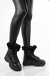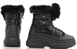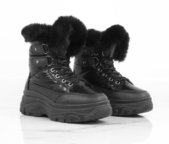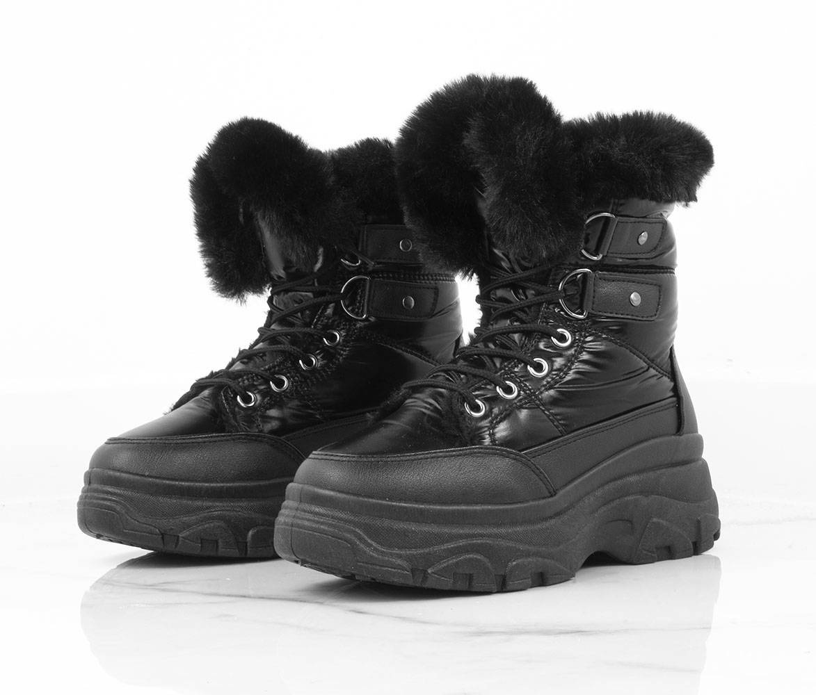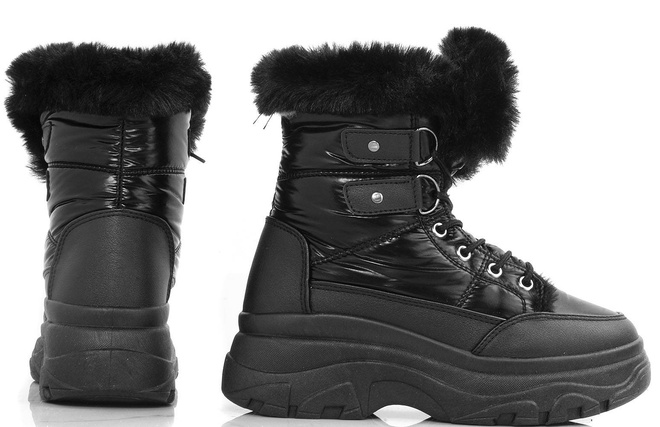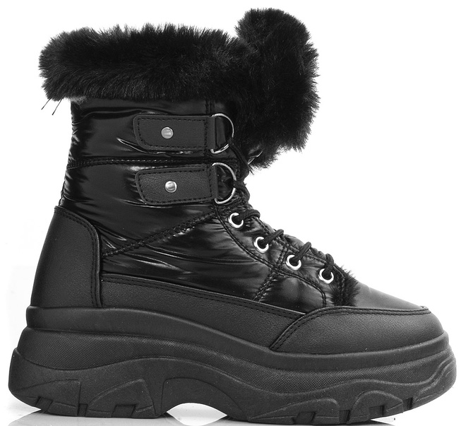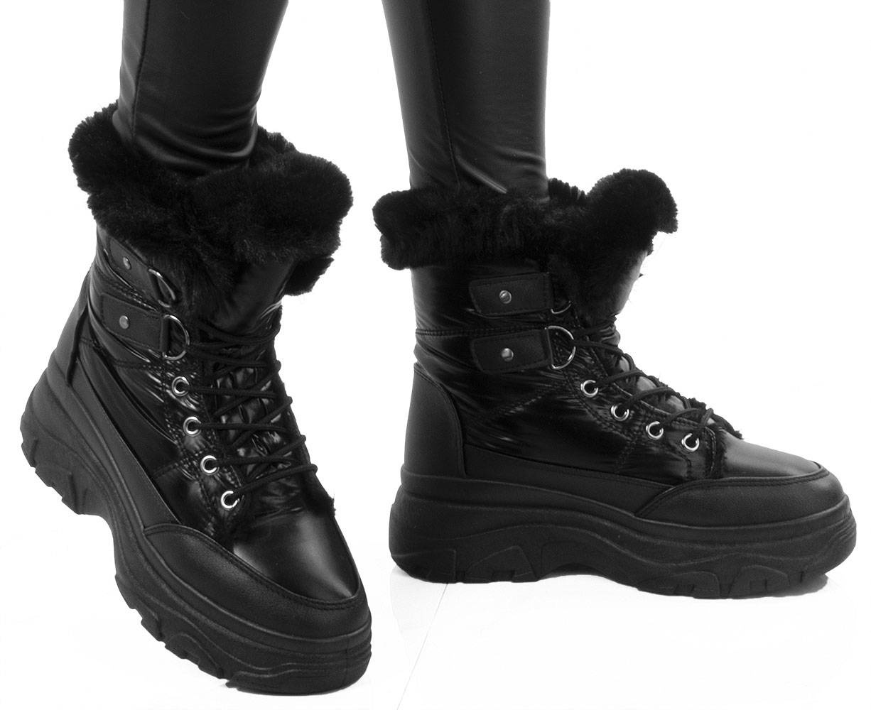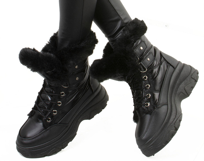 Ciepłe śniegowce damskie z ozdobnym futerkiem, model wykonany ze skóry ekologicznej. Obuwie na wyższej podeszwie, wiązane na sznurówki. Środek buta ocieplony futerkiem.
