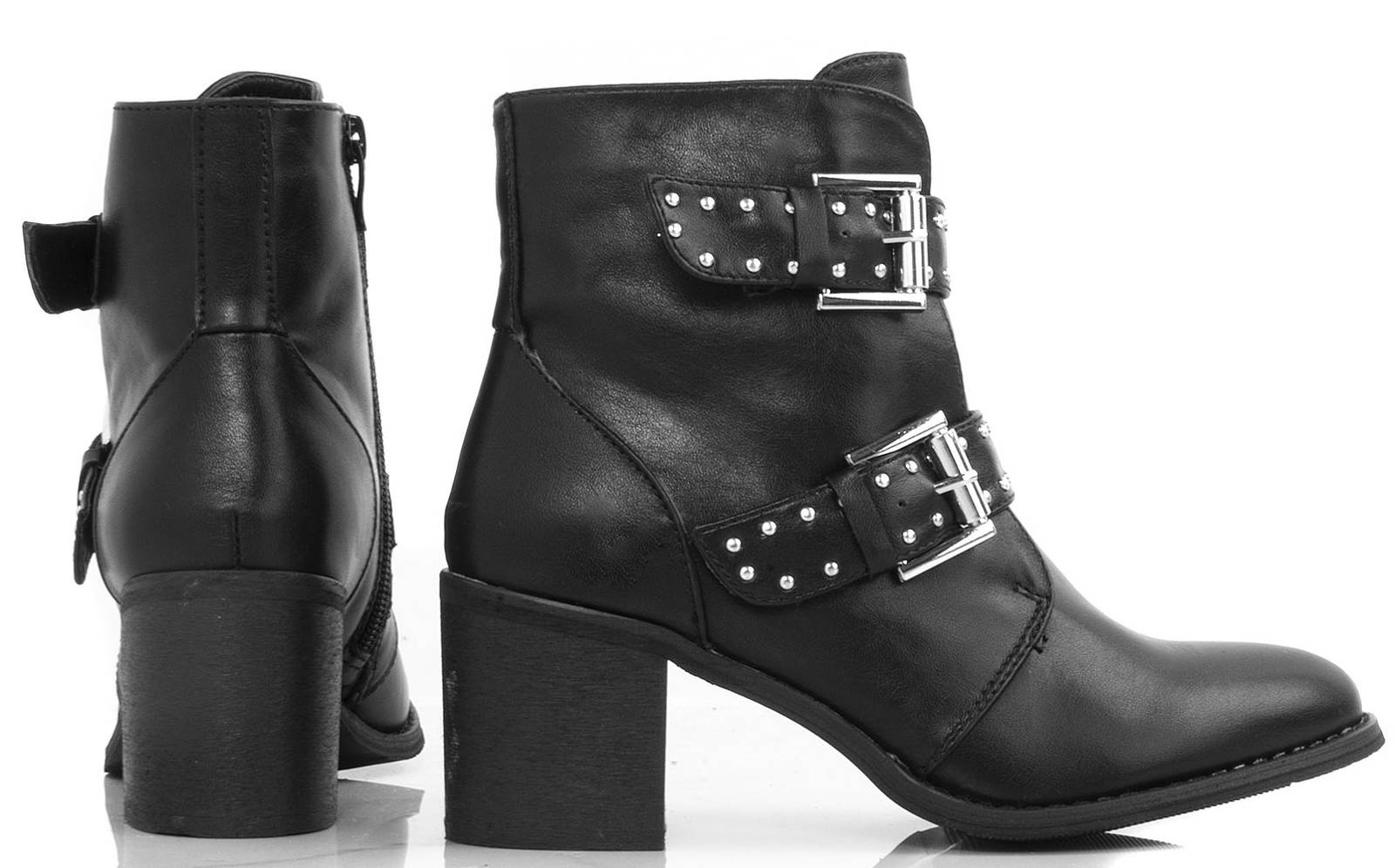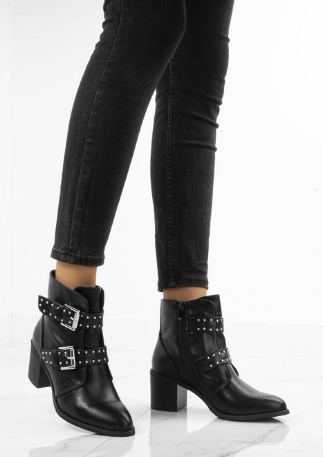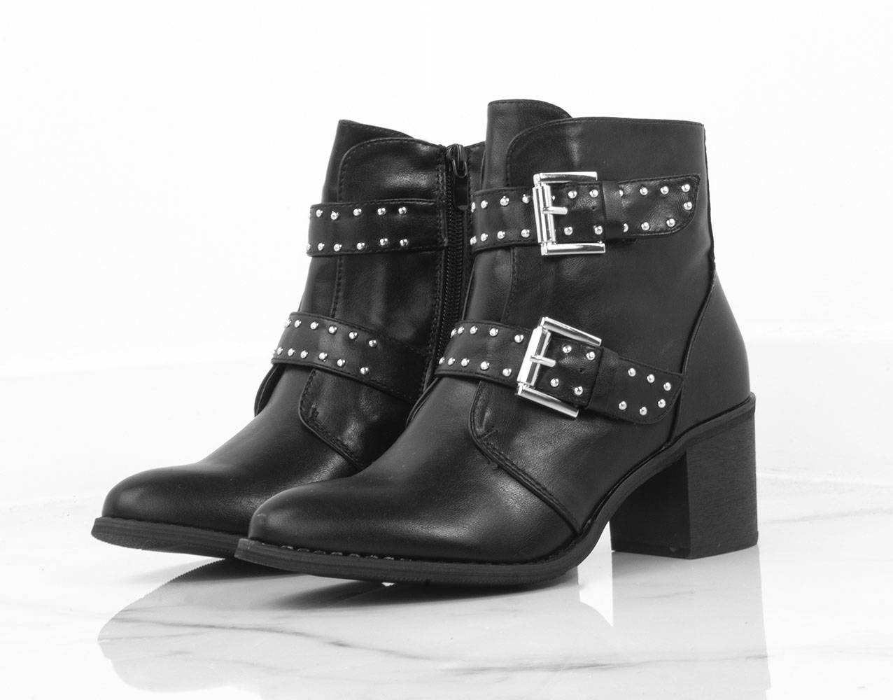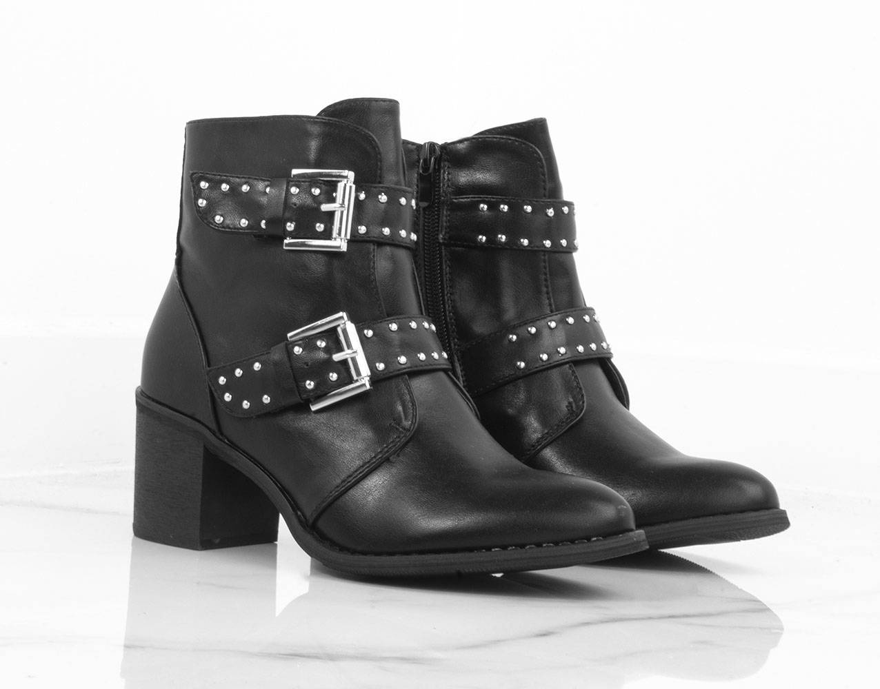Stylowe czarne botki na wygodnym słupku, wykonane ze skóry ekologicznej. Środek ocieplony futerkiem. Ozdobione dwoma klamrami z dżetami.