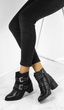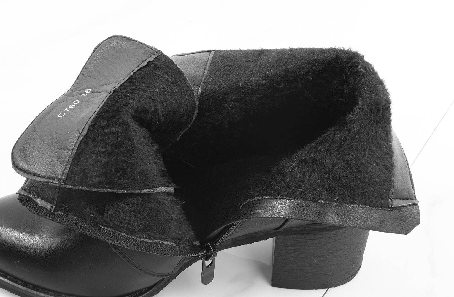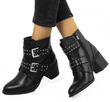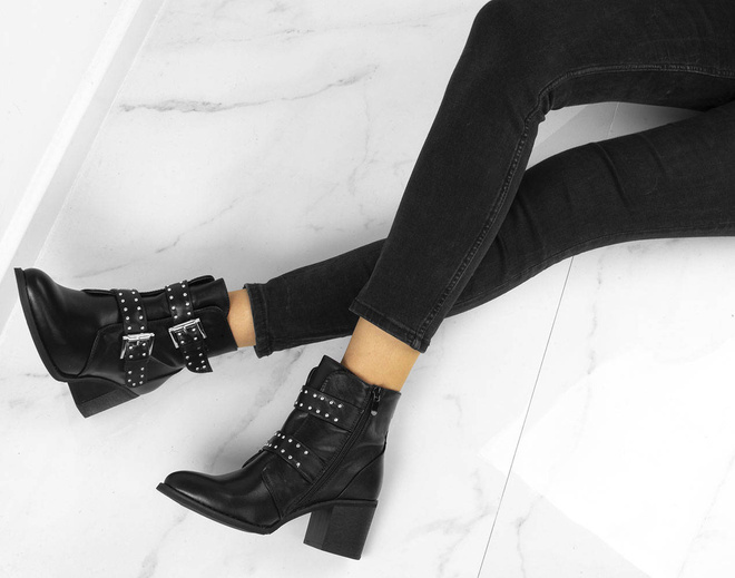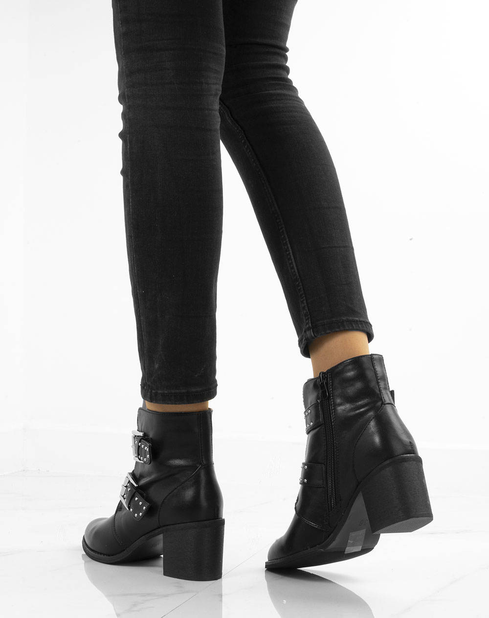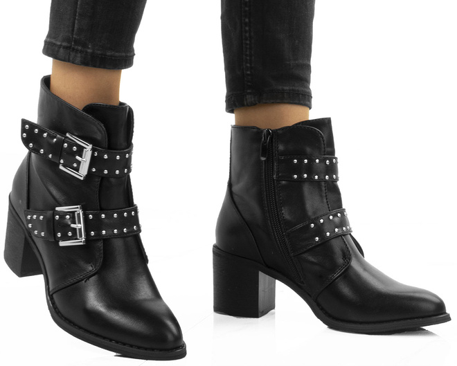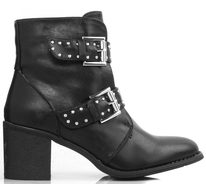 Stylowe czarne botki na wygodnym słupku, wykonane ze skóry ekologicznej. Środek ocieplony futerkiem. Ozdobione dwoma klamrami z dżetami.