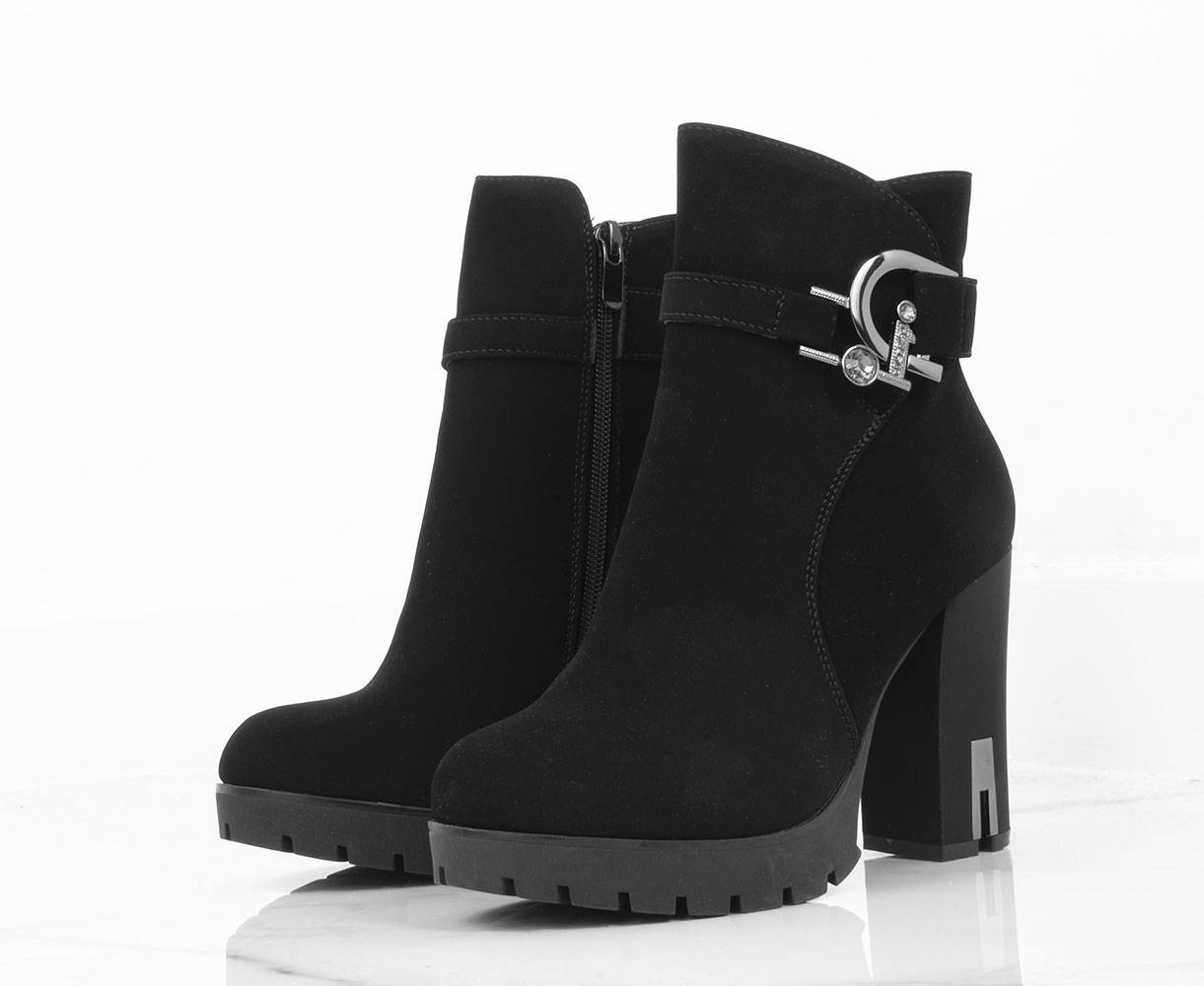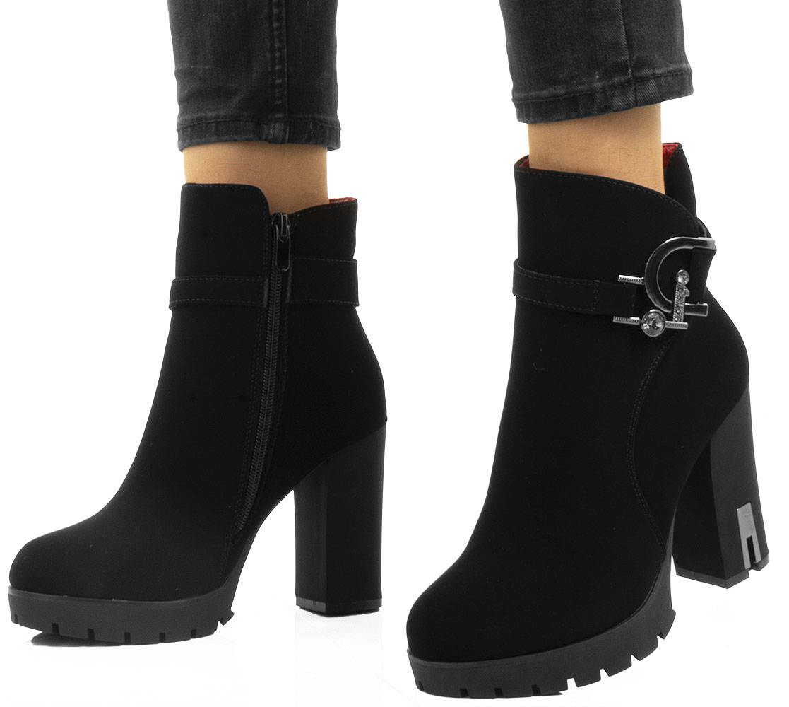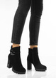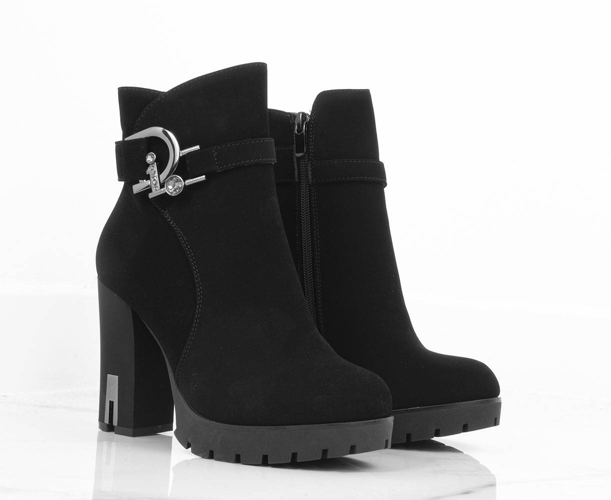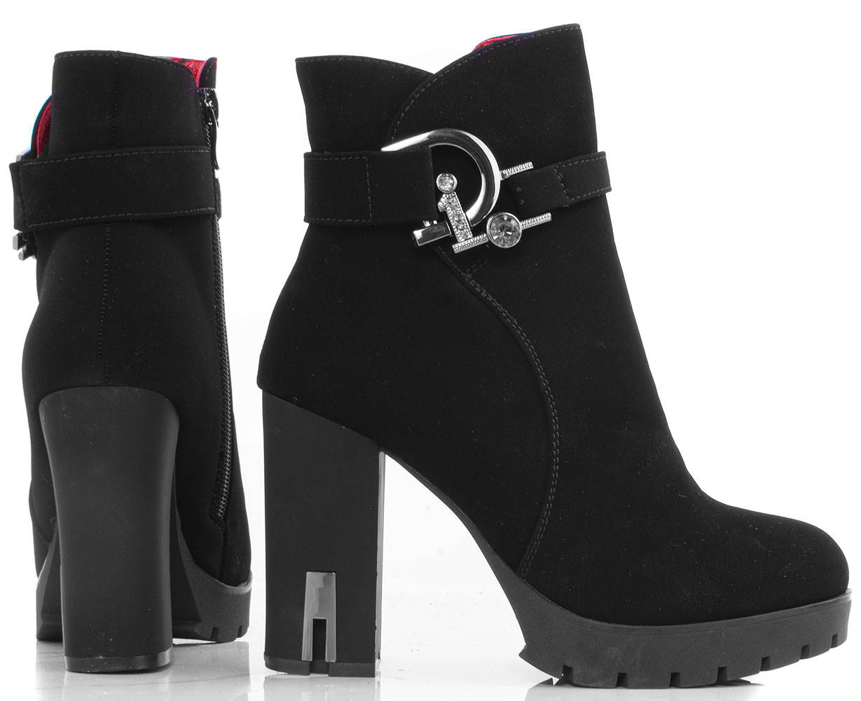 • Stylowe czarne botki na wygodnym słupku i delikatnej platformie. Wykonane z nubuku. Posiadają ozdobiony pasek u góry cholewki. Środek ocieplony delikatnym futerkiem.