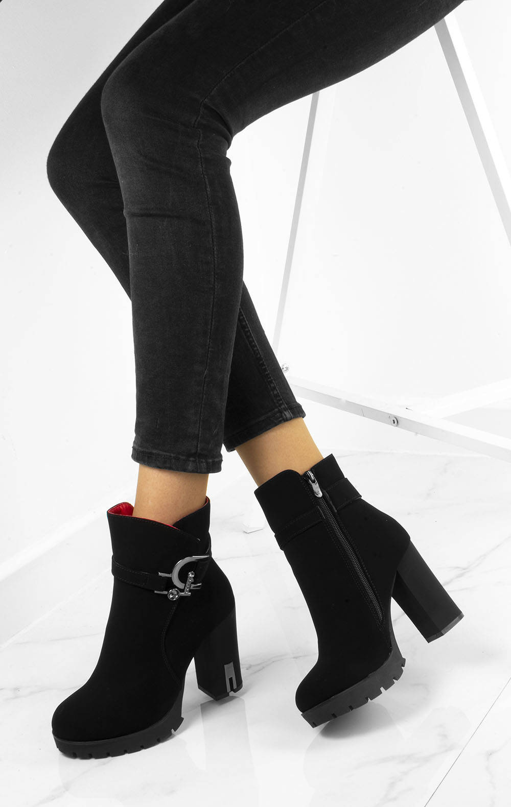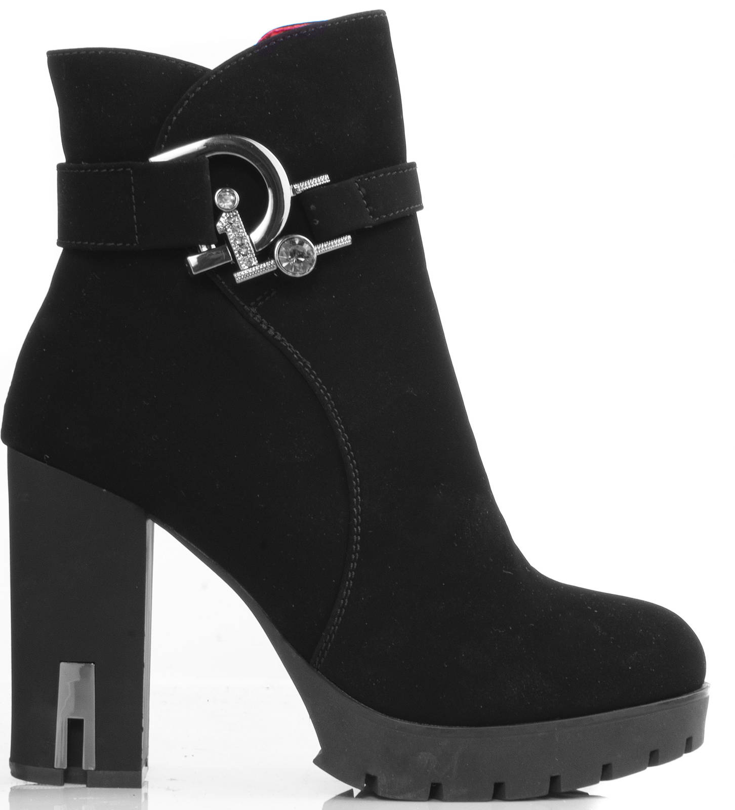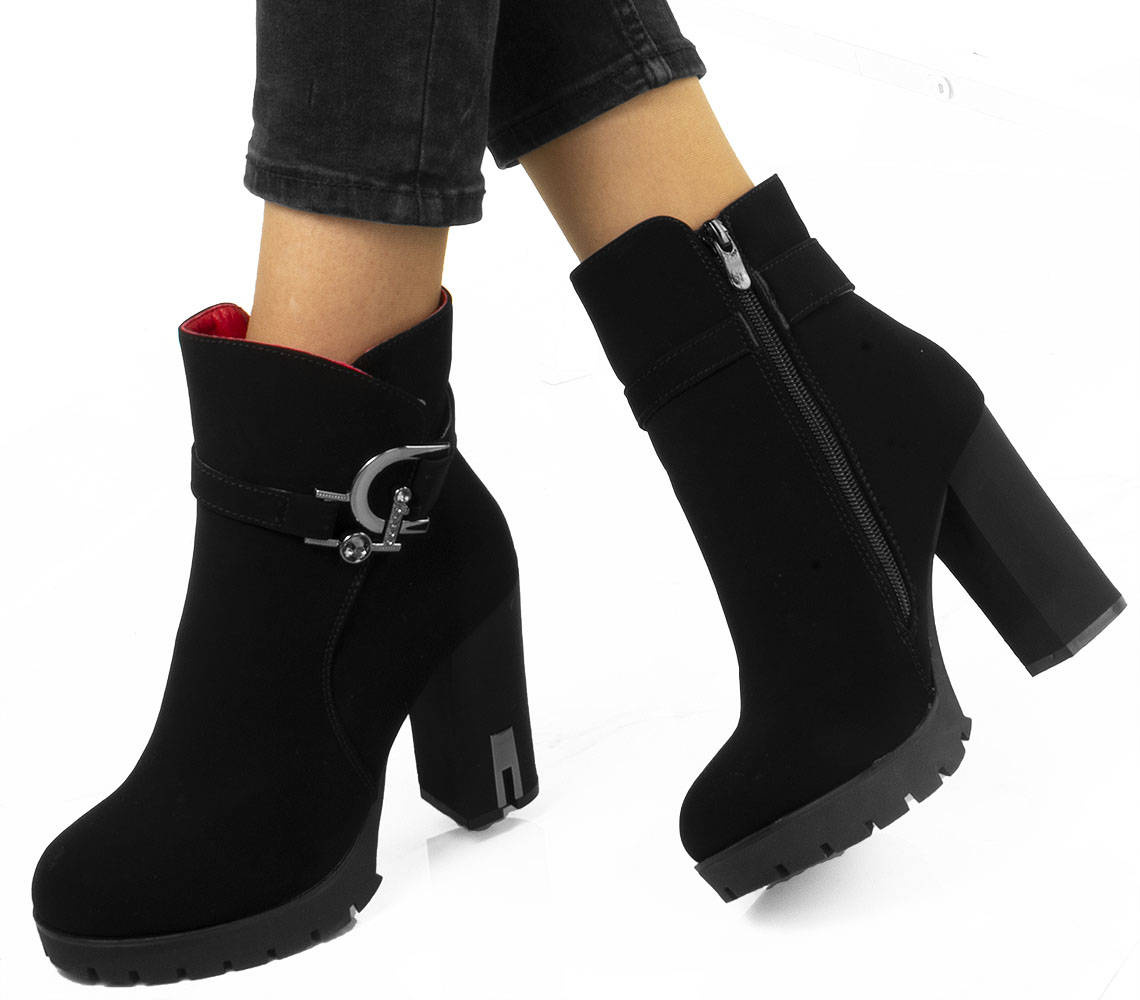 • Stylowe czarne botki na wygodnym słupku i delikatnej platformie. Wykonane z nubuku. Posiadają ozdobiony pasek u góry cholewki. Środek ocieplony delikatnym futerkiem.