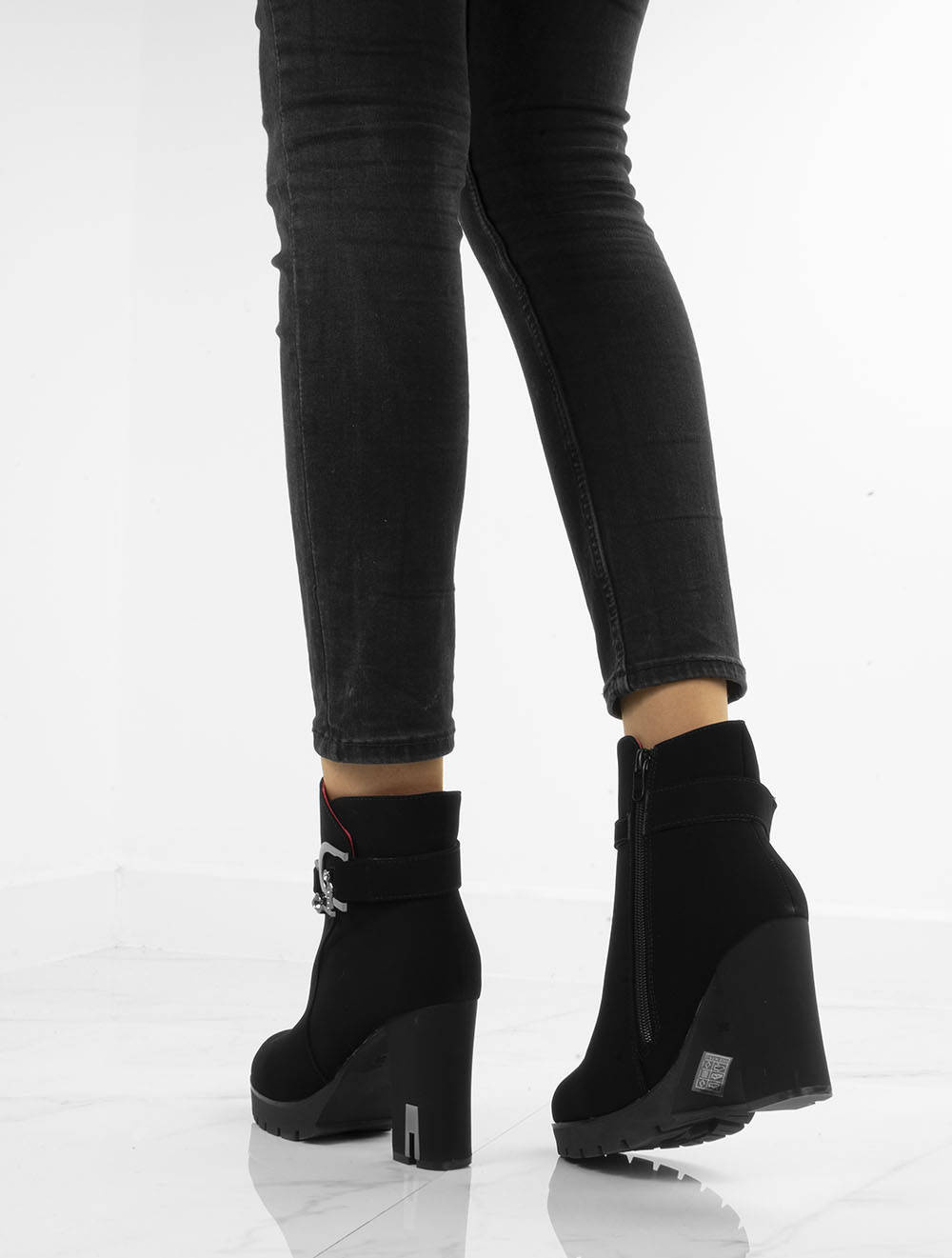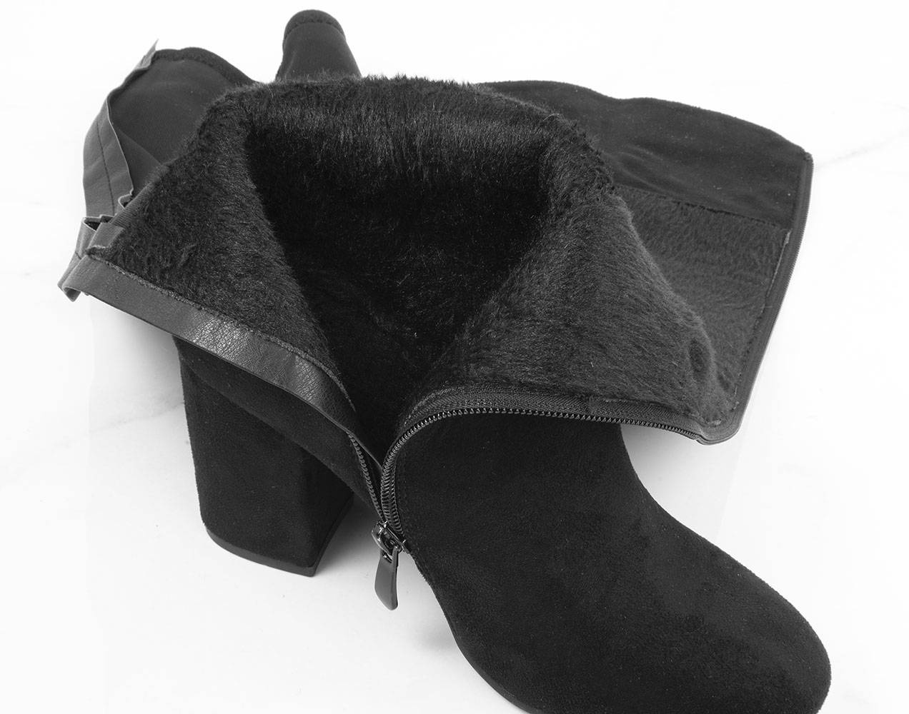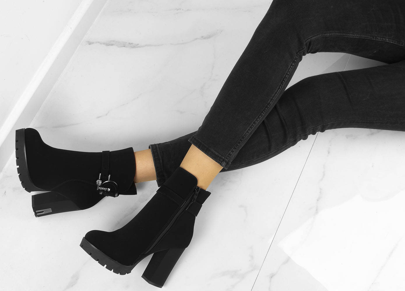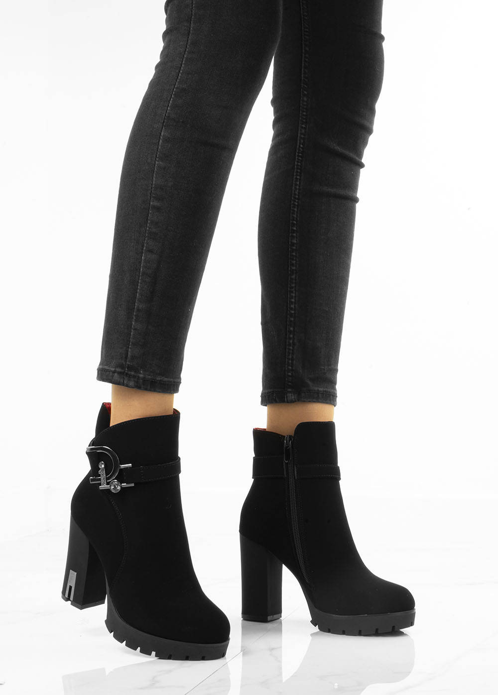 • Stylowe czarne botki na wygodnym słupku i delikatnej platformie. Wykonane z nubuku. Posiadają ozdobiony pasek u góry cholewki. Środek ocieplony delikatnym futerkiem.