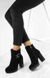 Stylowe czarne botki na wygodnym słupku i delikatnej platformie. Wykonane z nubuku. Posiadają ozdobiony pasek u góry cholewki. Środek ocieplony delikatnym futerkiem.
