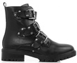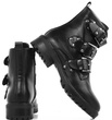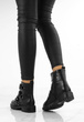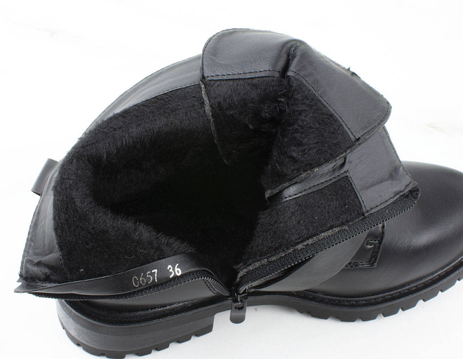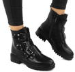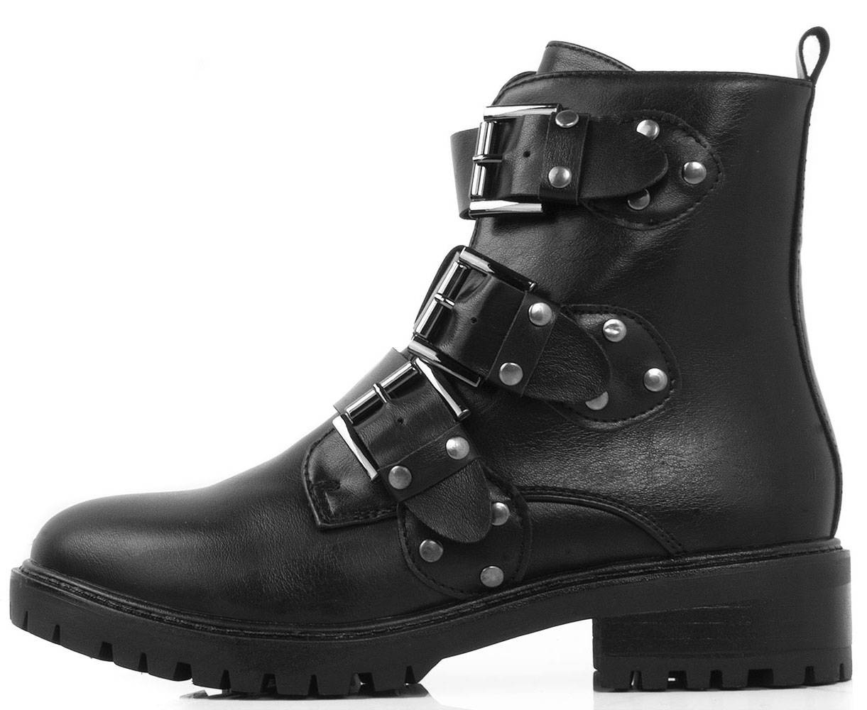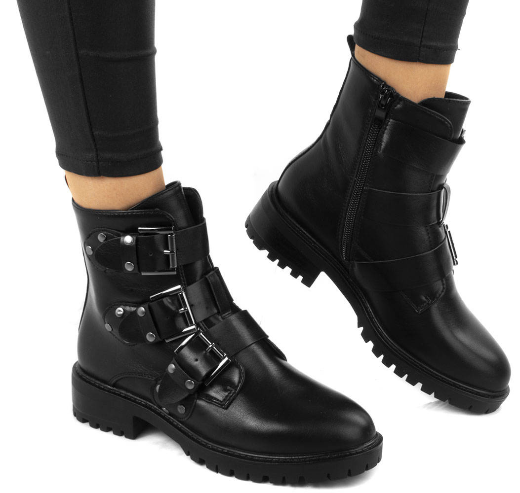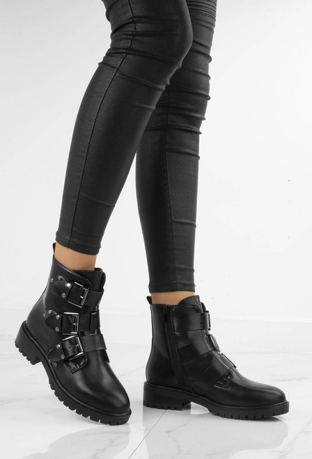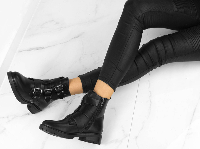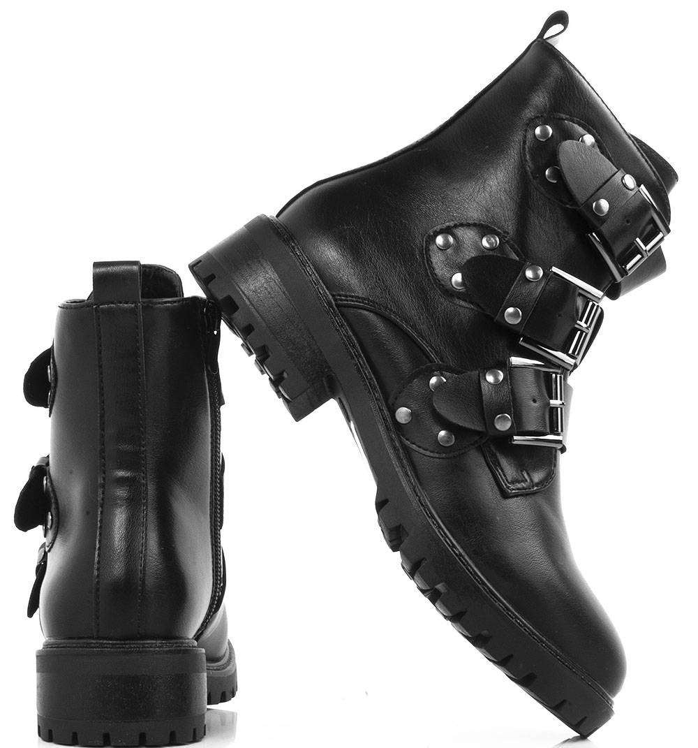 Czarne wysokie botki na płaskim obcasie wykonane ze skóry ekologicznej. Posiadają ozdobny dodatek na cholewce w formie trzech pasków z klamerkami. Ocieplone delikatnym futerkiem. Model pasujący do każdej stylizacji.