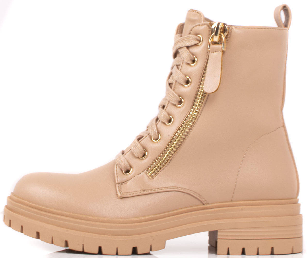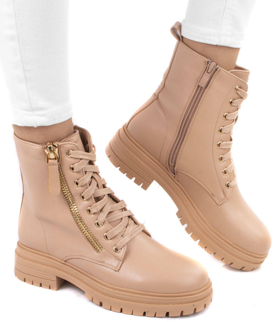 Stylowe botki damskie typu glany. Antypoślizgowa podeszwa typu traper idealna na jesień i zimę. Wnętrze buta ocieplone delikatnym futerkiem. Suwak + sznurowanie sprawiają, że buty są bardzo łatwe w zakładaniu. Dodatkowo ozdobny zamek z drugiej strony buta.