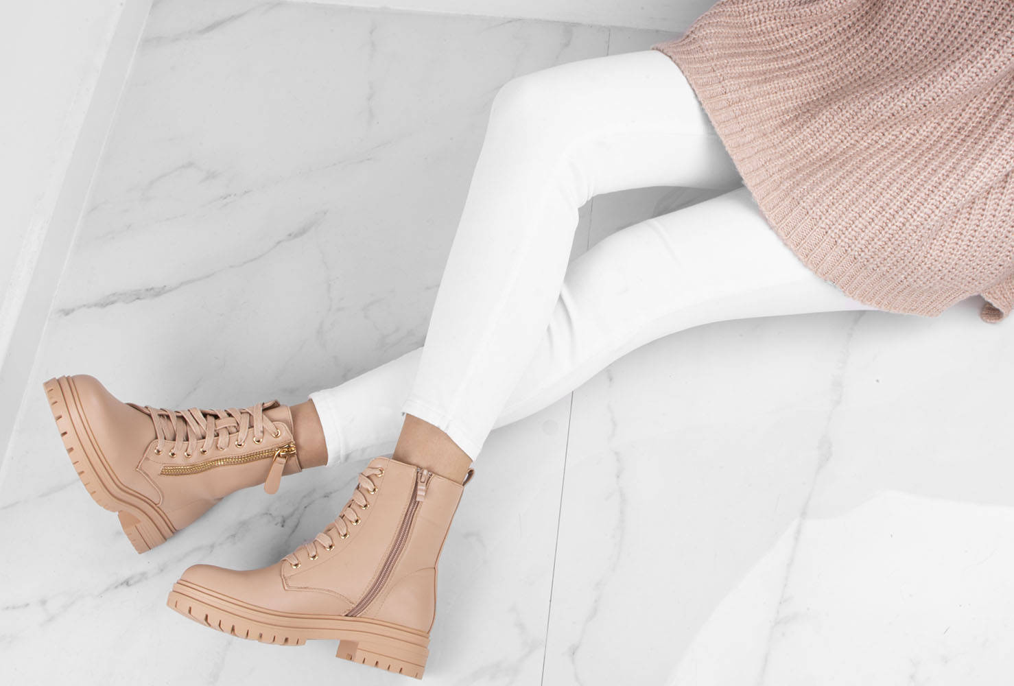 • Stylowe botki damskie typu glany. Antypoślizgowa podeszwa typu traper idealna na jesień i zimę. Wnętrze buta ocieplone delikatnym futerkiem. Suwak + sznurowanie sprawiają, że buty są bardzo łatwe w zakładaniu.