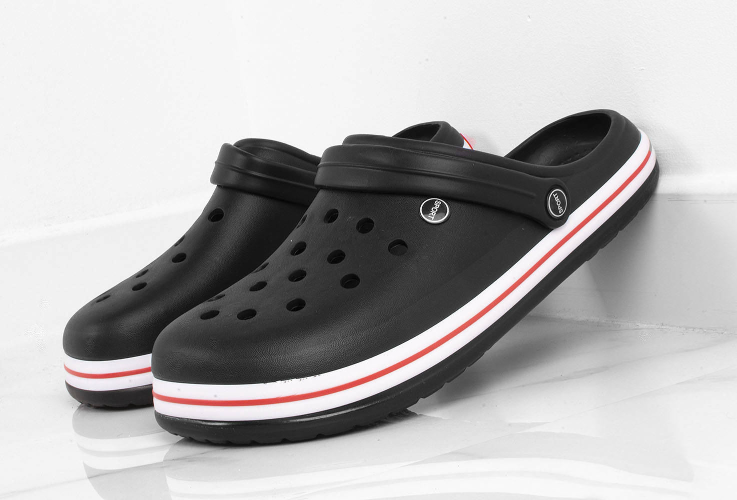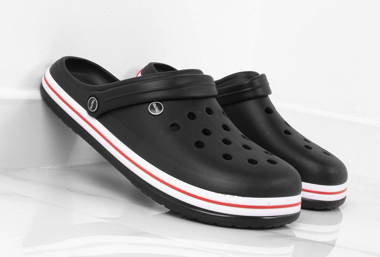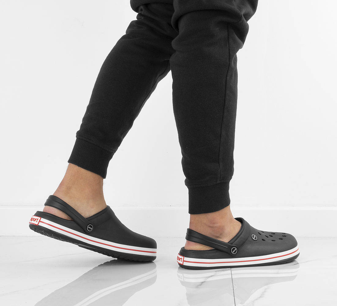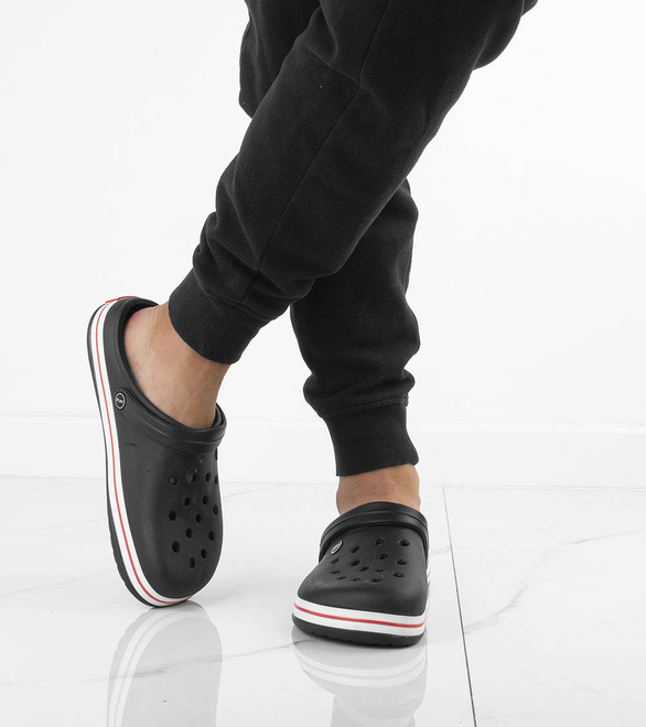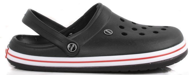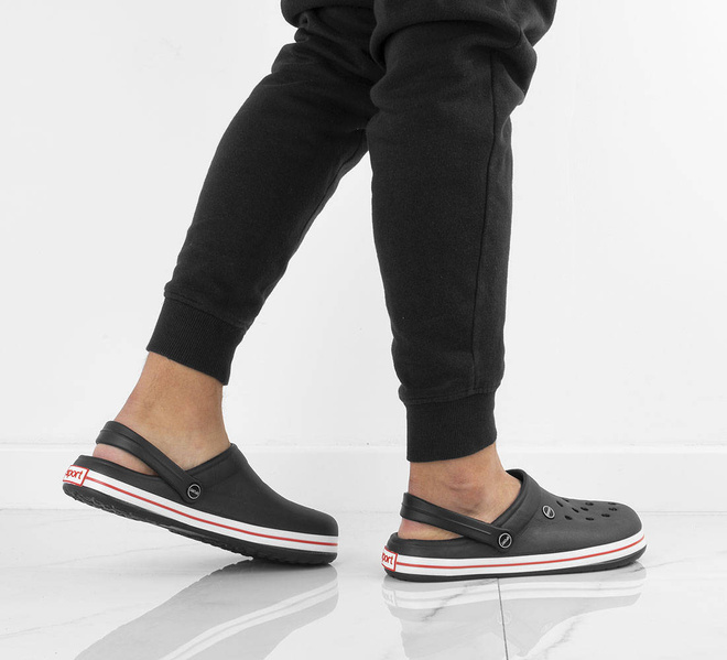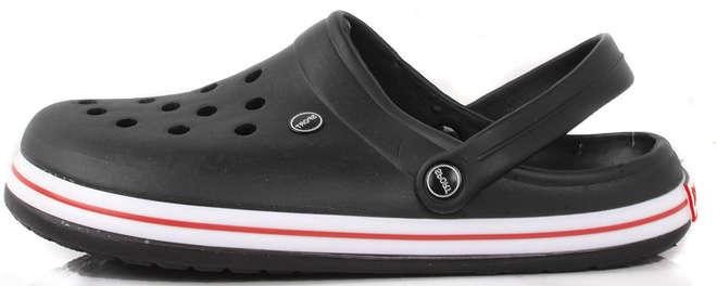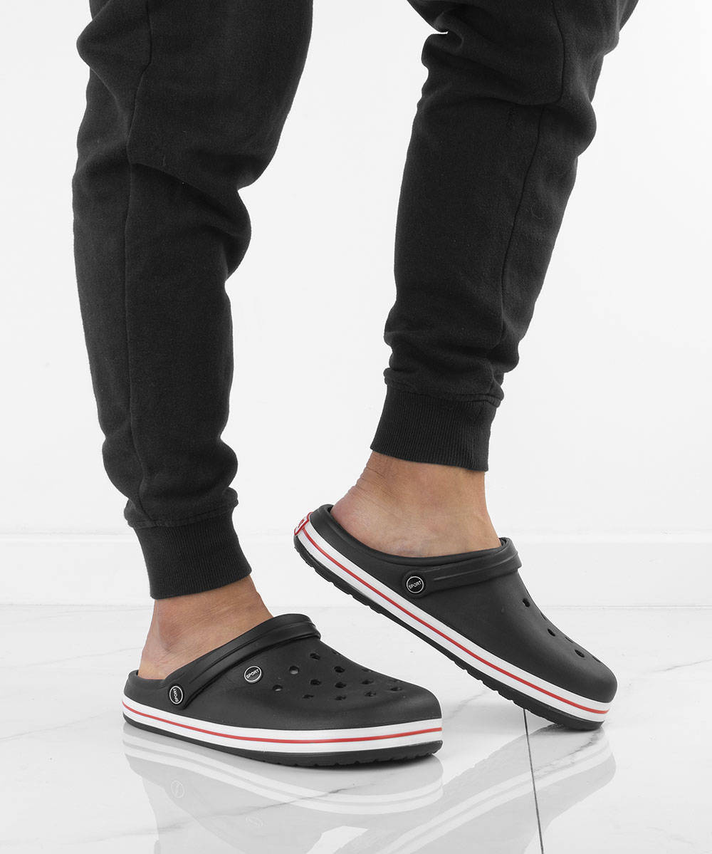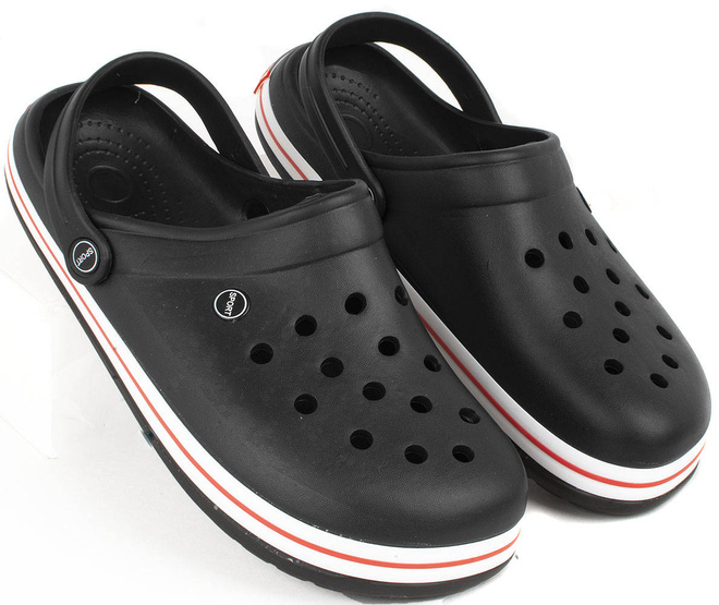 Czarne, lekkie klapki typu "kroksy", z czerwonym akcentem z boku. Zapewnią wygodę i odpowiednią wentylację stopom. Dopełnią w ciekawy sposób każdą stylizację.