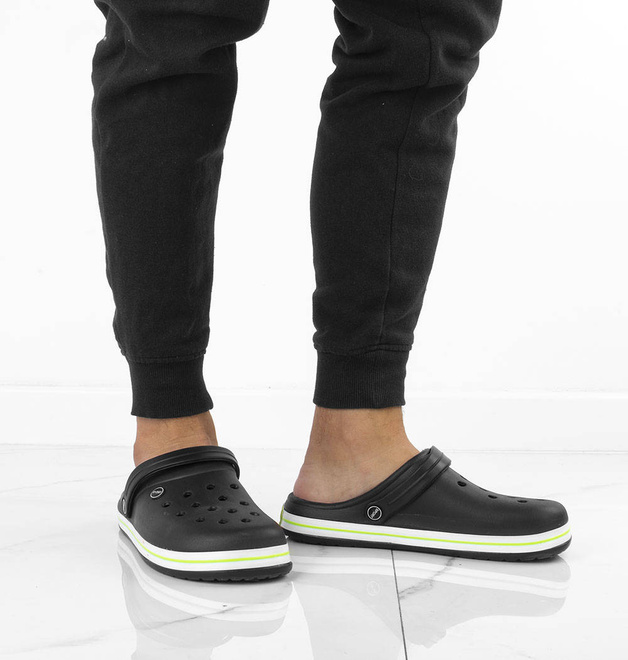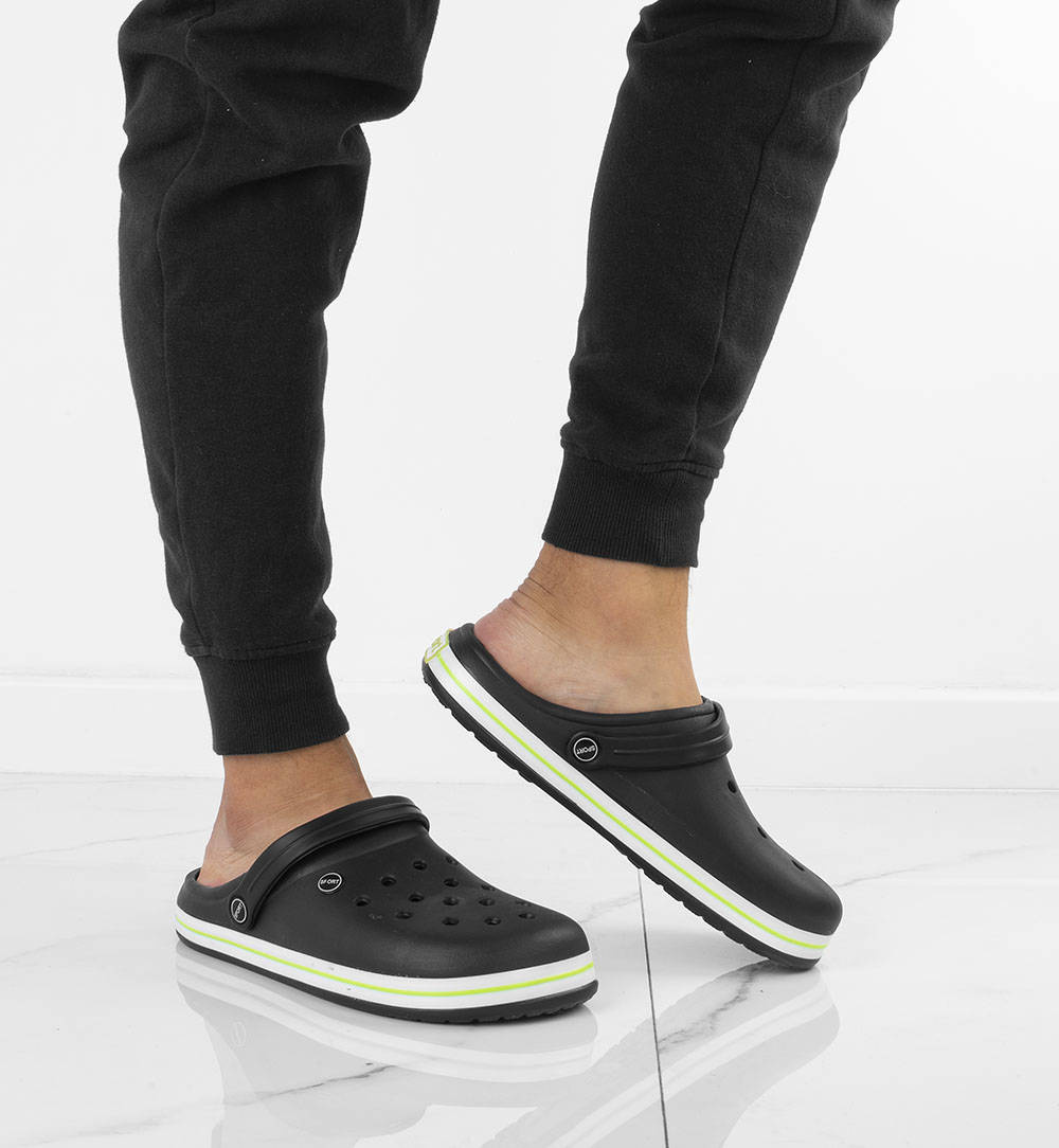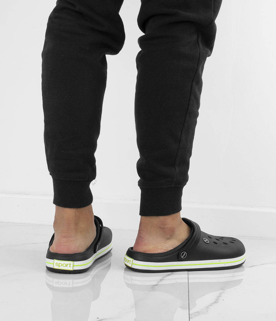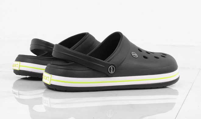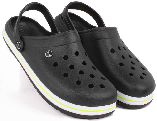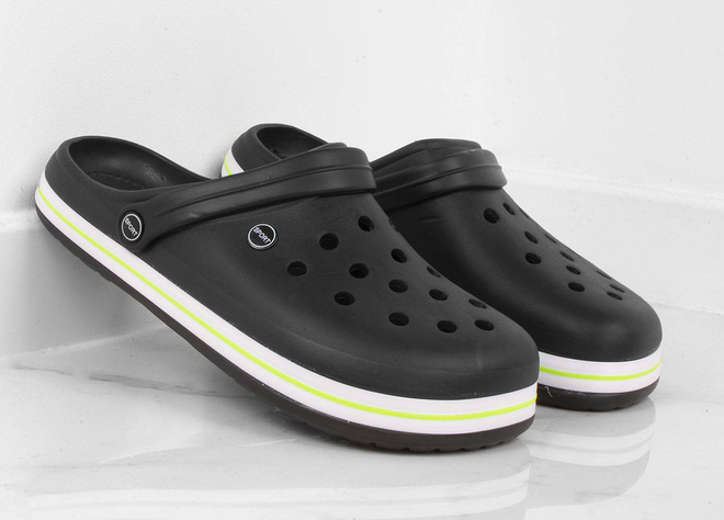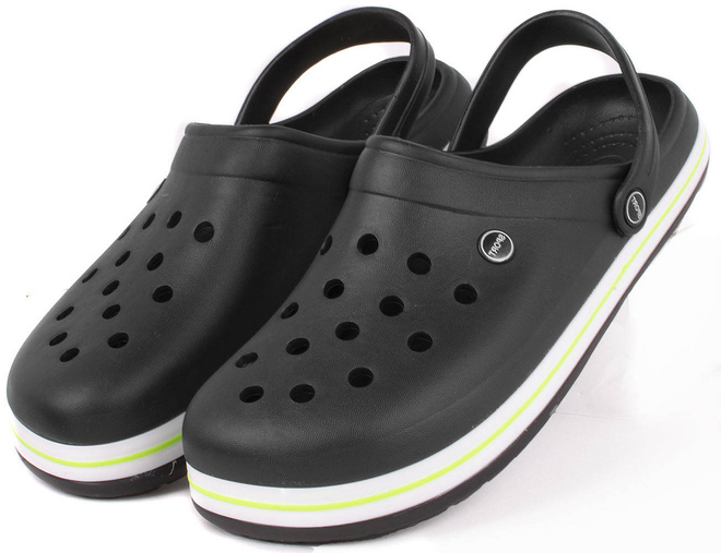 Czarne, lekkie klapki typu "kroksy", z zielonym akcentem z boku. Zapewnią wygodę i odpowiednią wentylację stopom. Dopełnią w ciekawy sposób każdą stylizację.