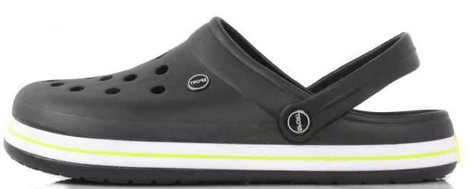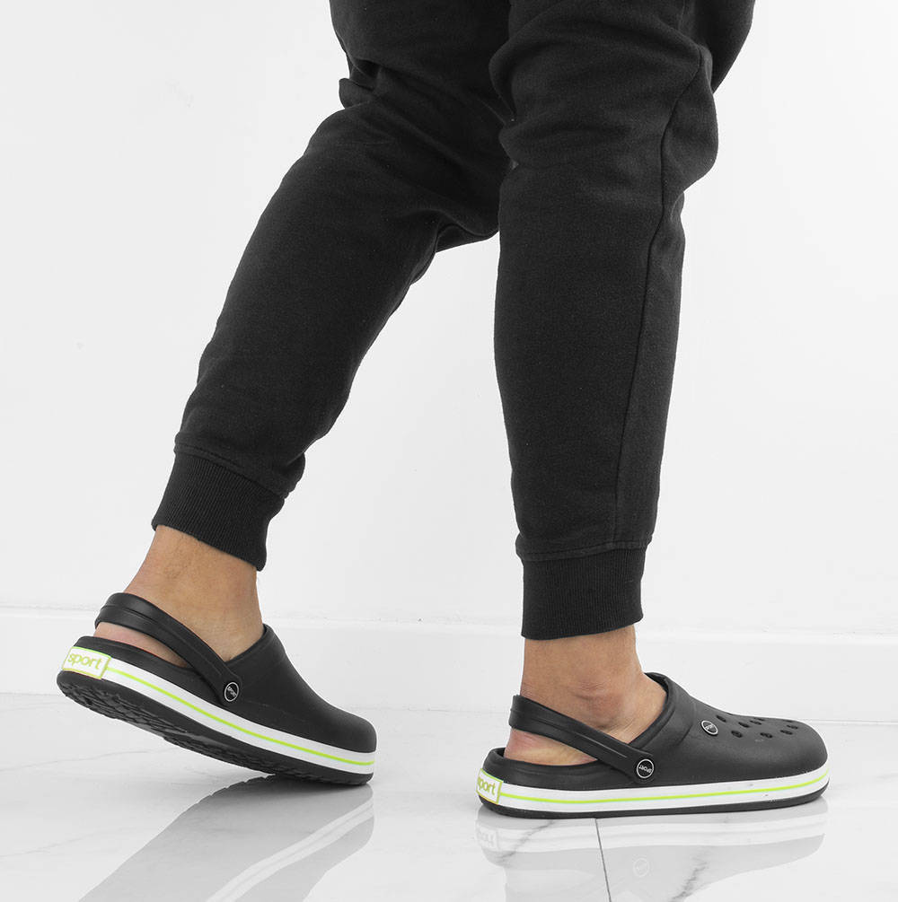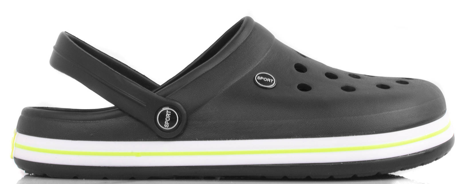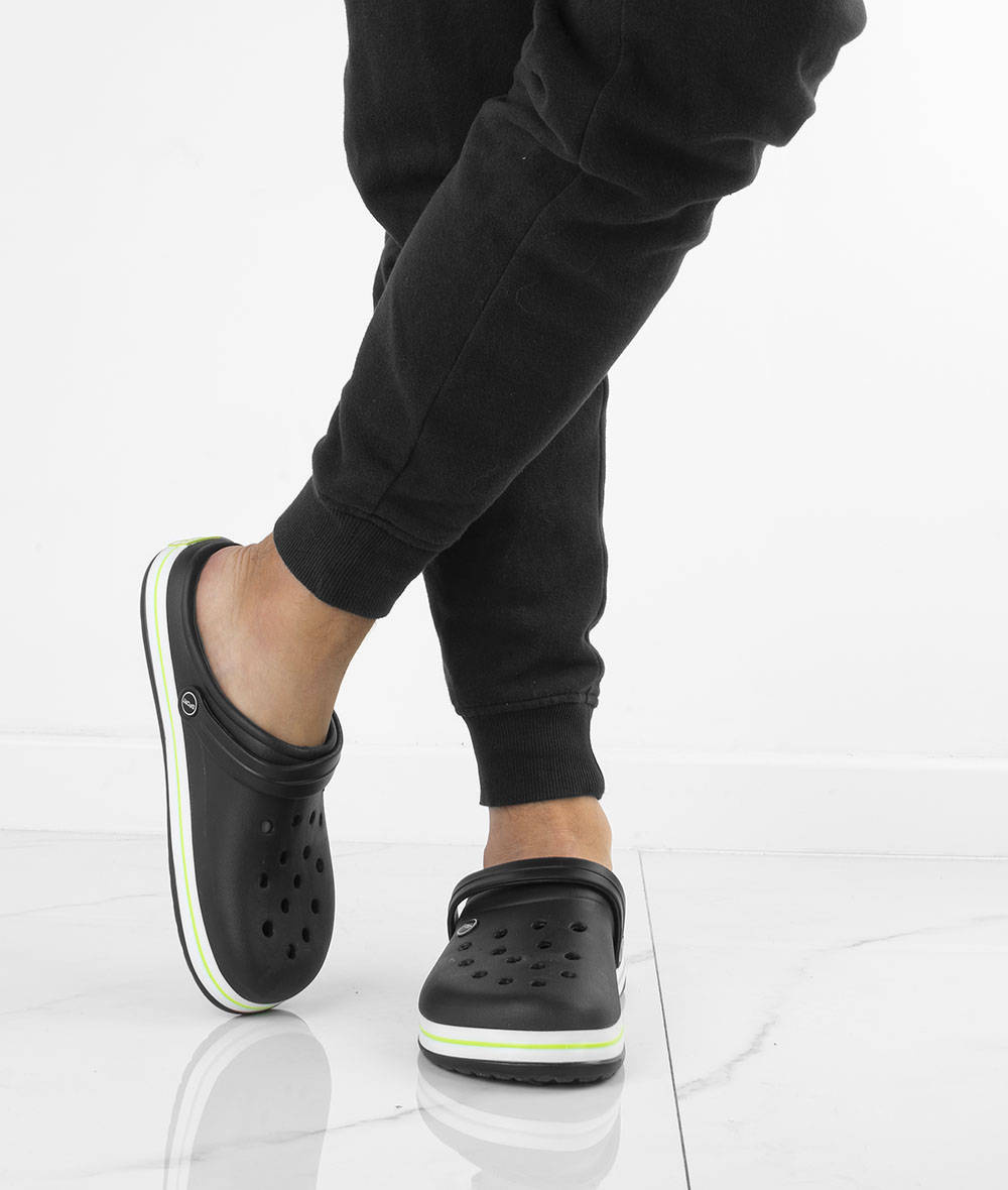 Czarne, lekkie klapki typu "kroksy", z zielonym akcentem z boku. Zapewnią wygodę i odpowiednią wentylację stopom. Dopełnią w ciekawy sposób każdą stylizację.