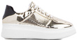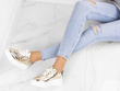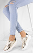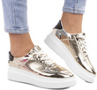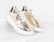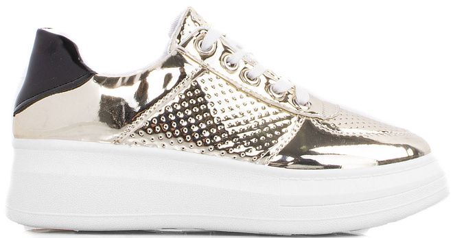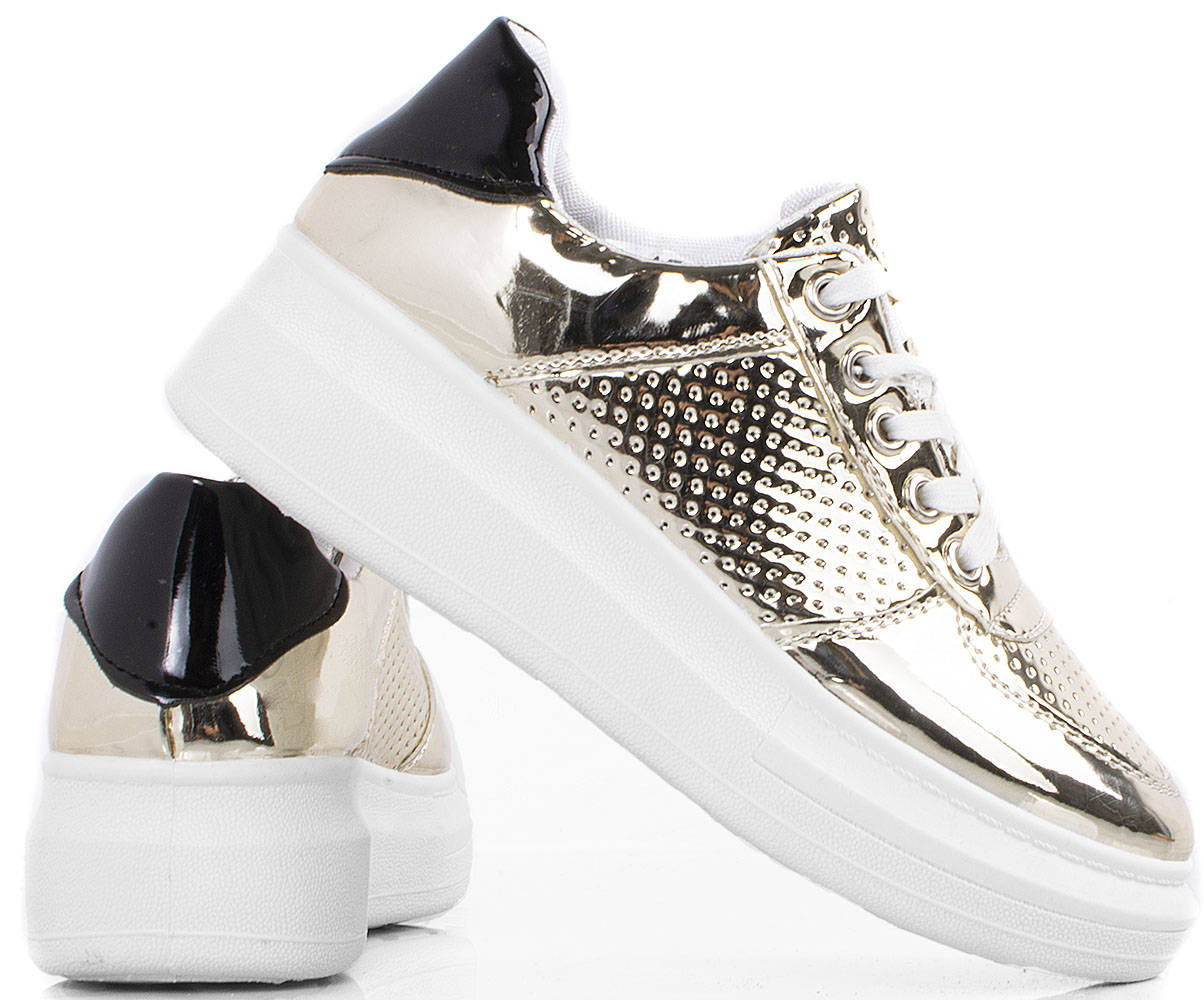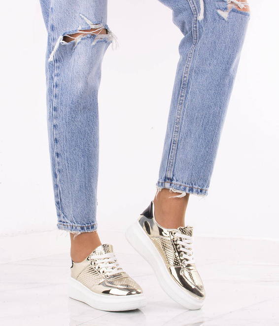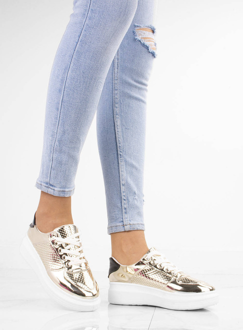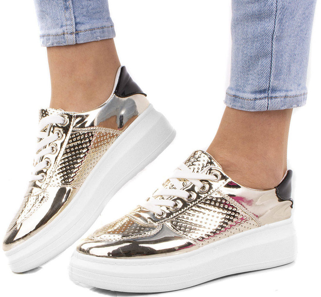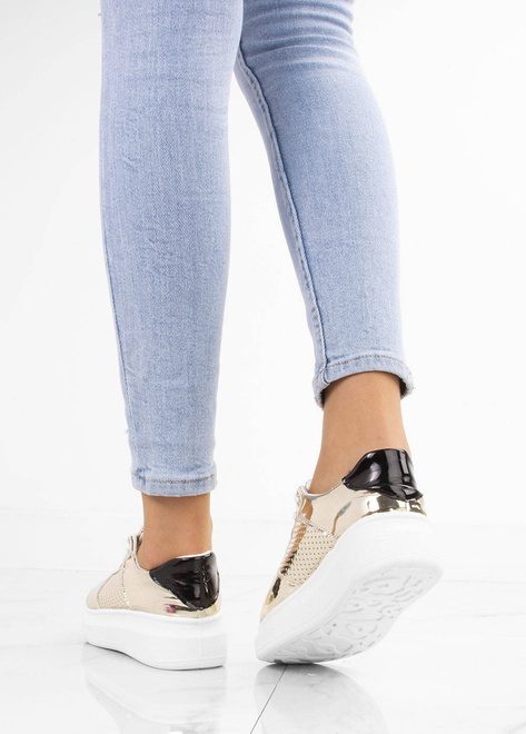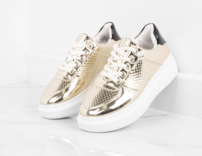 Złote buty sportowe wykonane ze skóry ekologicznej. Posiadają ażurowe zdobienie oraz czarną wstawkę z tyłu buta. Model na białej, grubszej i wygodnej podeszwie. Lekkie oraz stylowe idealne do codziennych stylizacji.