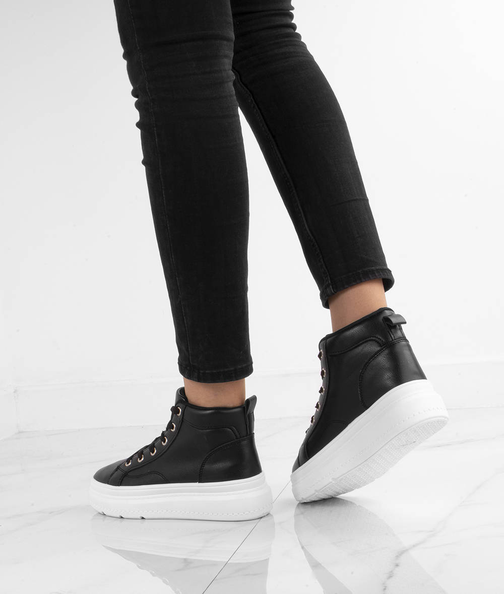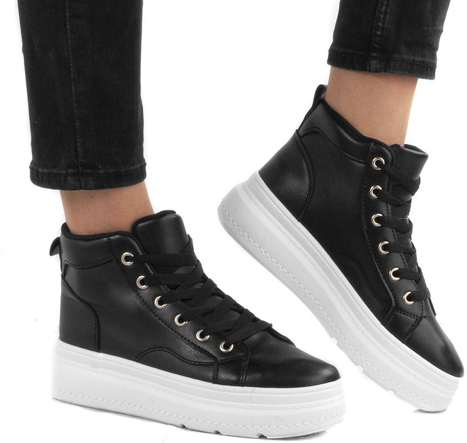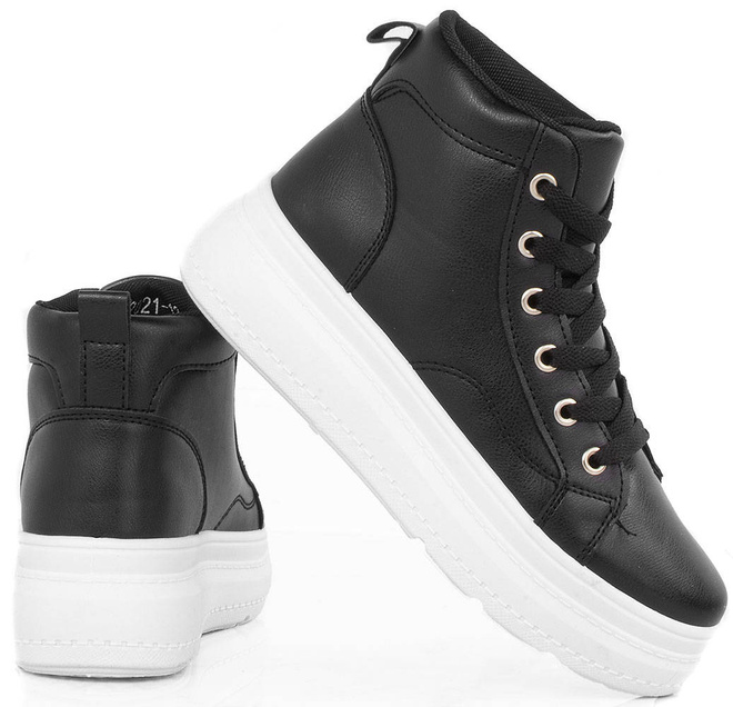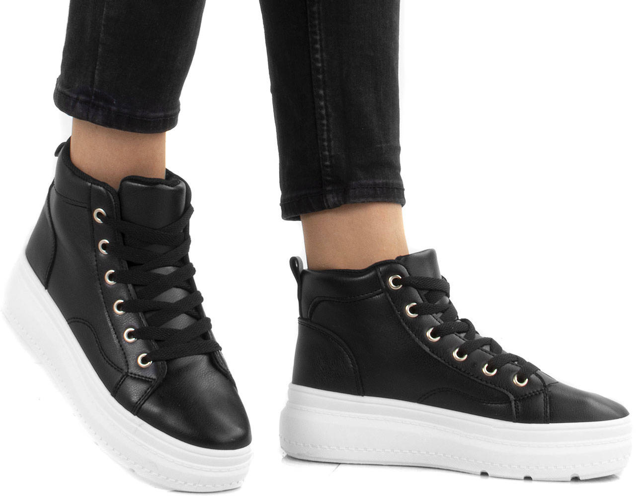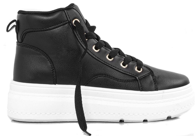 Klasyczne damskie wysokie trampki na grubszej gumowej podeszwie ze skóry ekologicznej. Model sięgający za kostkę, sznurowany. Stylowy i modny, idealny na każdą pogodę!