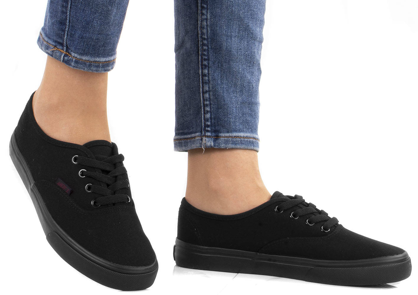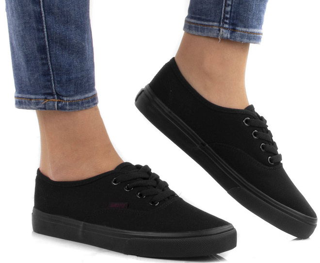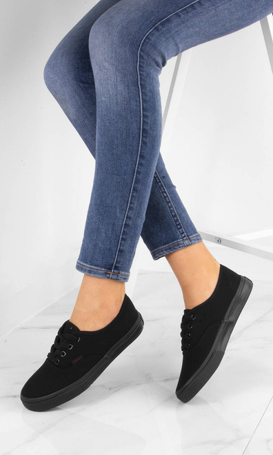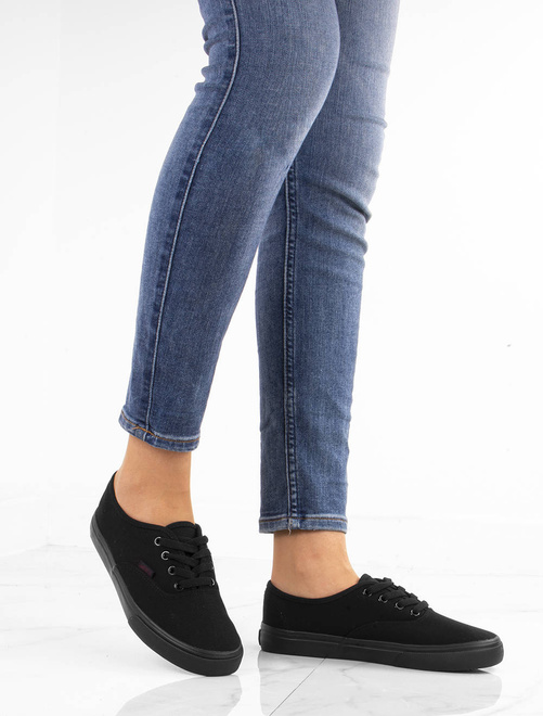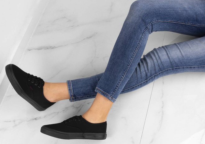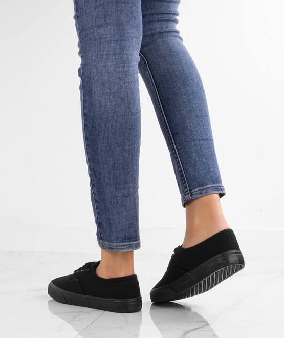 Klasyczne damskie tenisówki typu trampki na płaskiej podeszwie. Cholewka jak i wkładka wykonane z materiału tkaninowego. Super dodatek do Twoich casualowych outfitów!