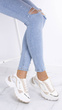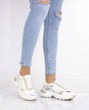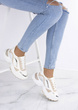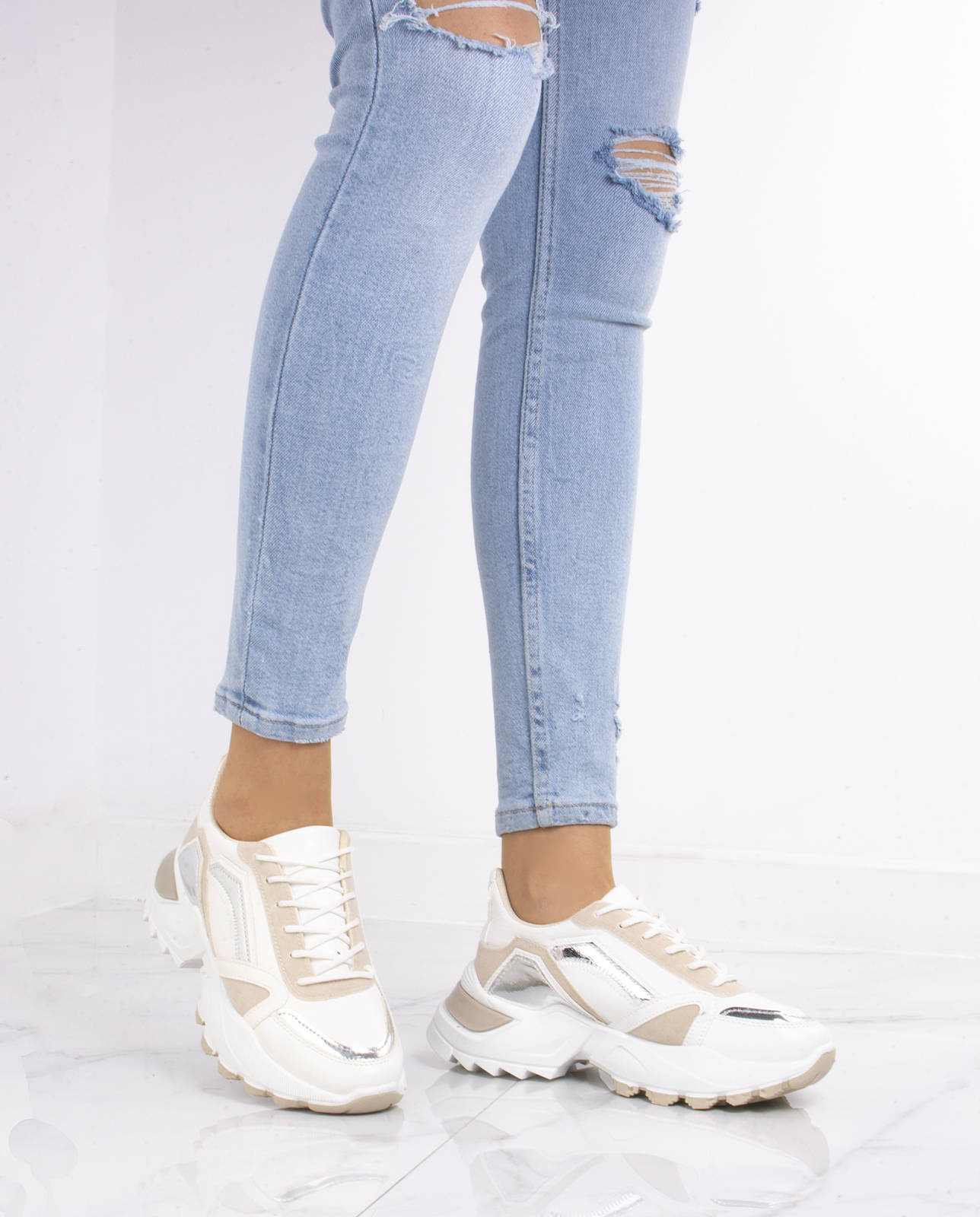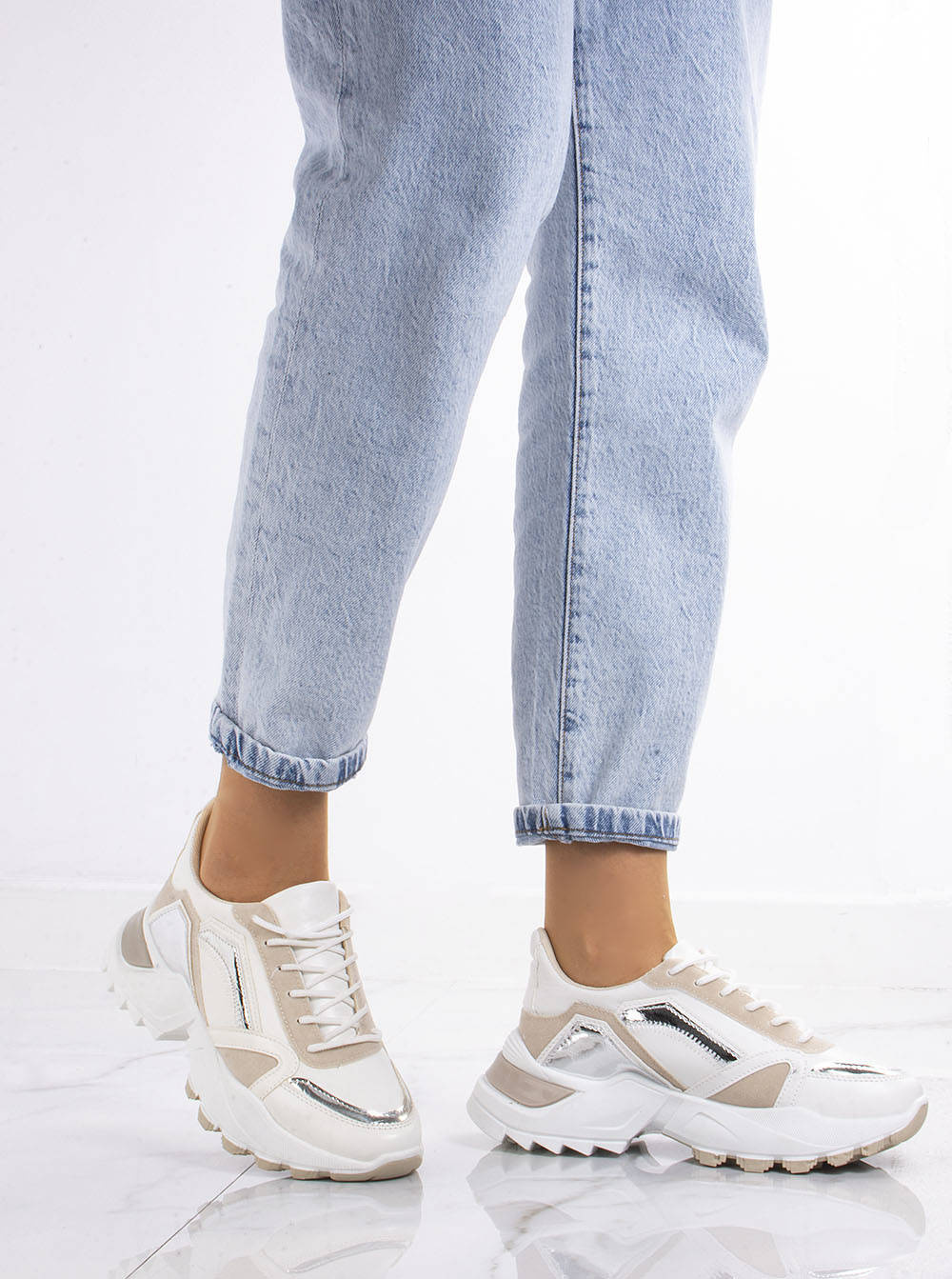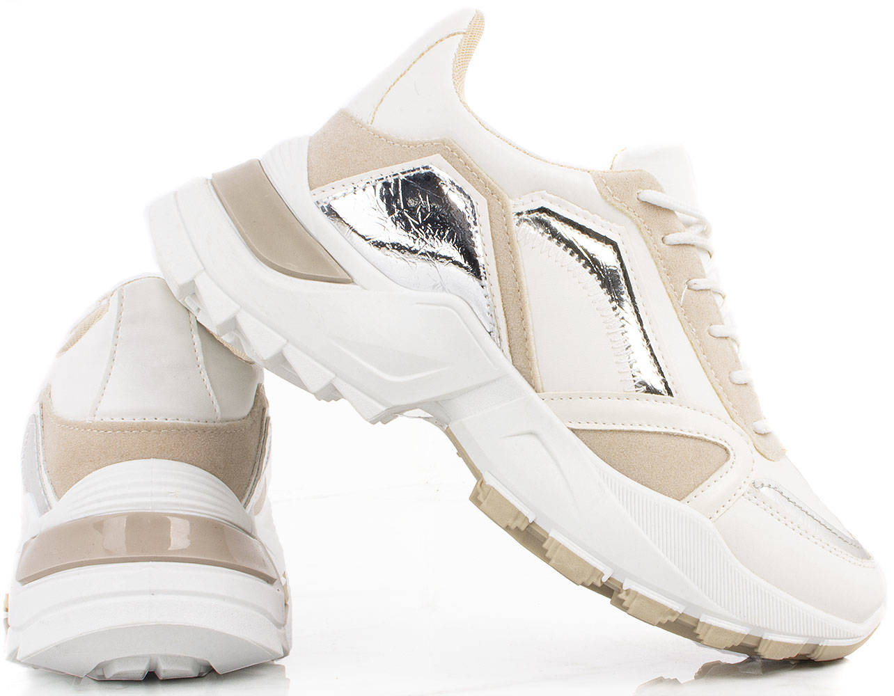 • Sportowe buty damskie typu sneakersy. Obuwie sznurowane, wkładka tkaninowa, gruba, wygodna podeszwa gumowa. Sneakersy w odcieniach beżu ze srebrnymi wstawkami po bokach.