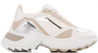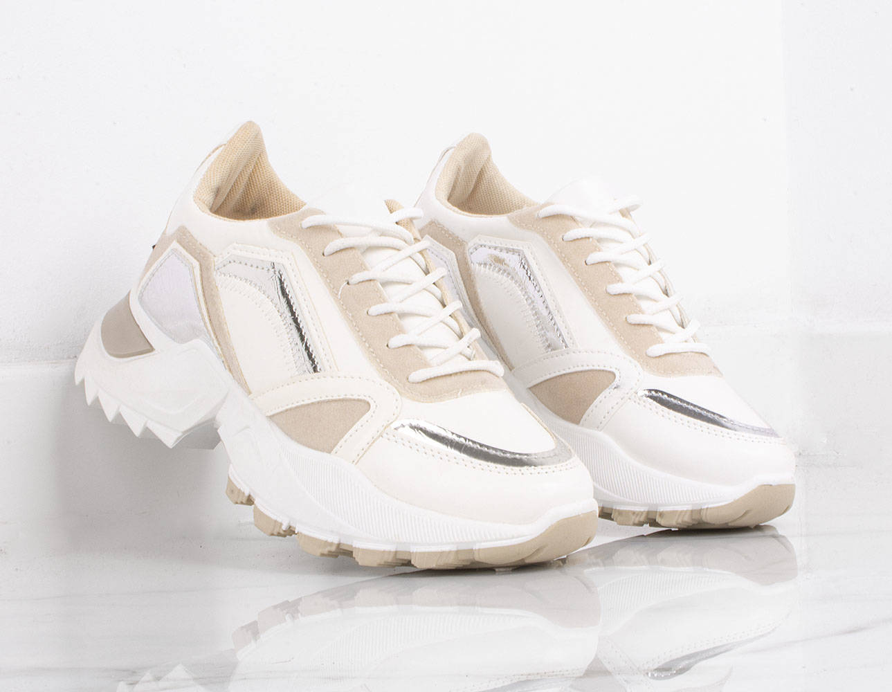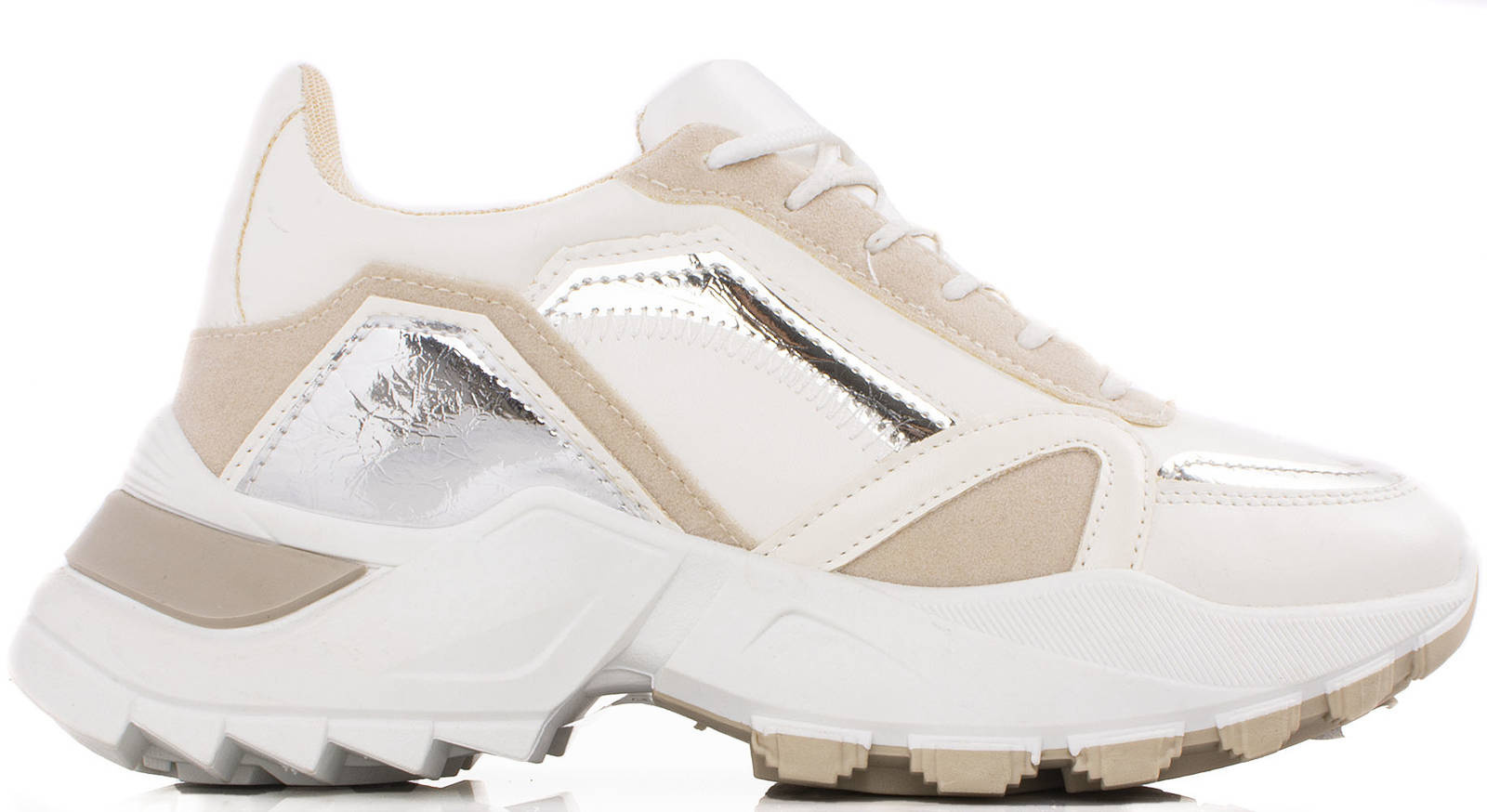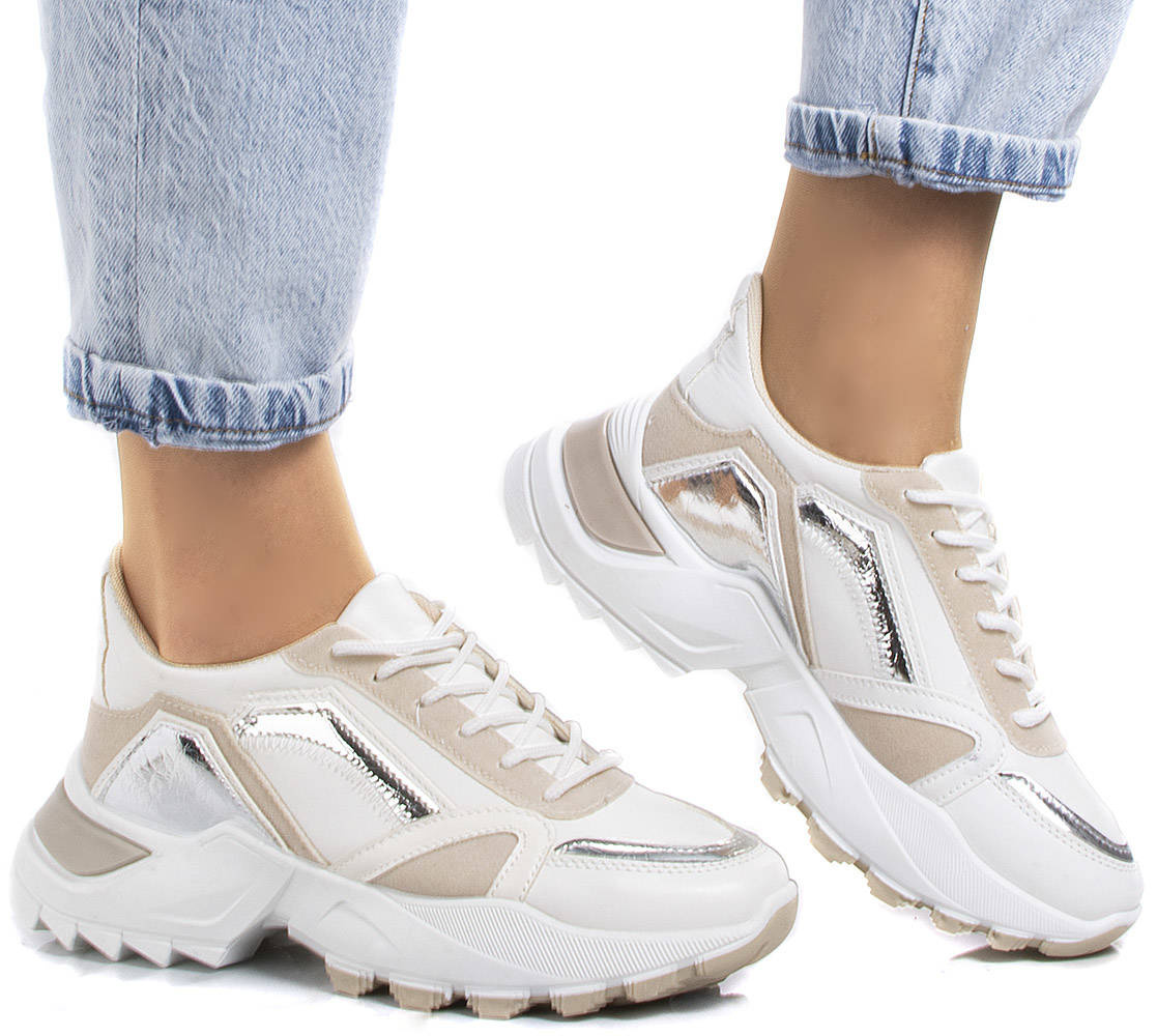 Sportowe buty damskie typu sneakersy. Obuwie sznurowane, wkładka tkaninowa, gruba, wygodna podeszwa gumowa. Sneakersy w odcieniach beżu ze srebrnymi wstawkami po bokach. Z pewnością świetnie się sprawdzą z dresami lub jeansami!