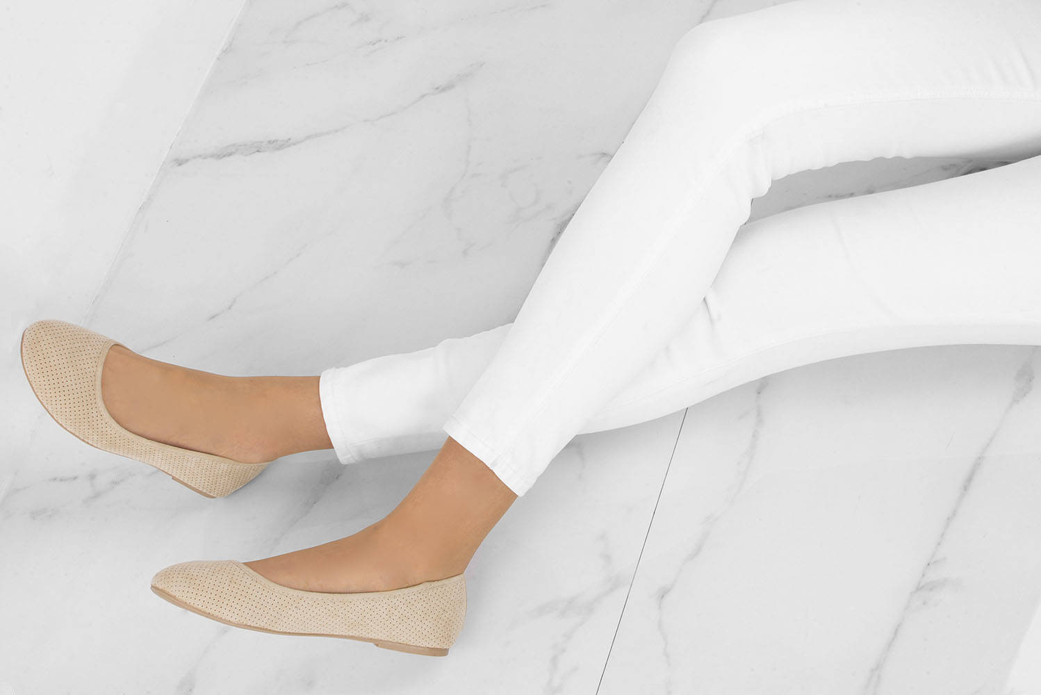 • Lekkie balerinki damskie wykonane z materiału zamszowego. Model z ażurowym wykończeniem, idealny zarówno do sukienki jak i jeansów!
